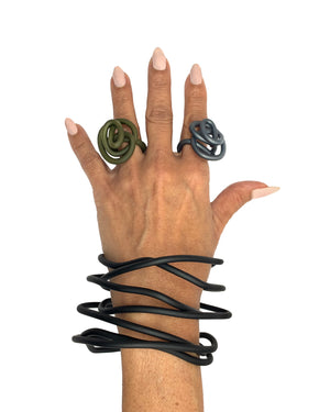 Whimsical rubber coated wire bracelet. Bendable and stackable.