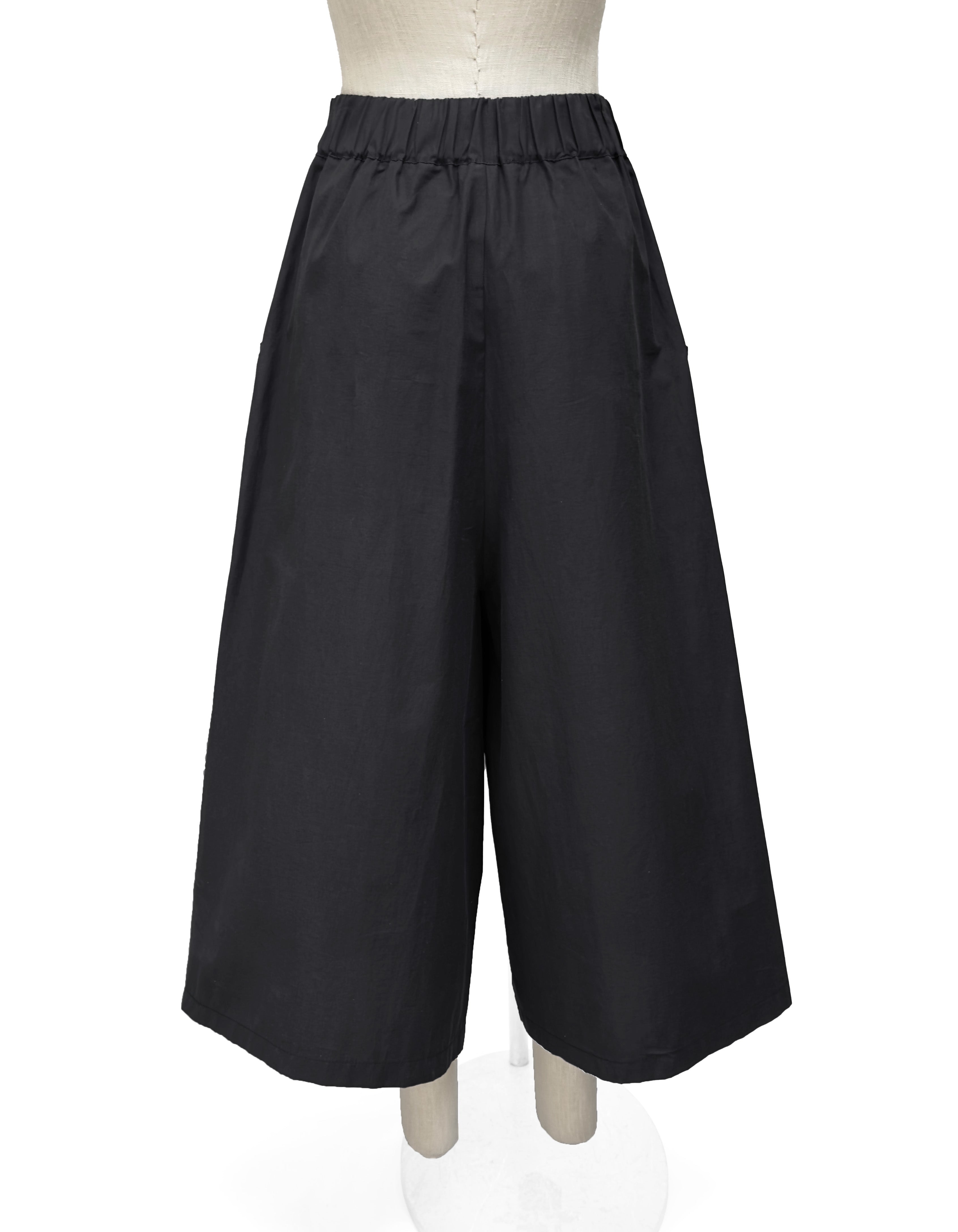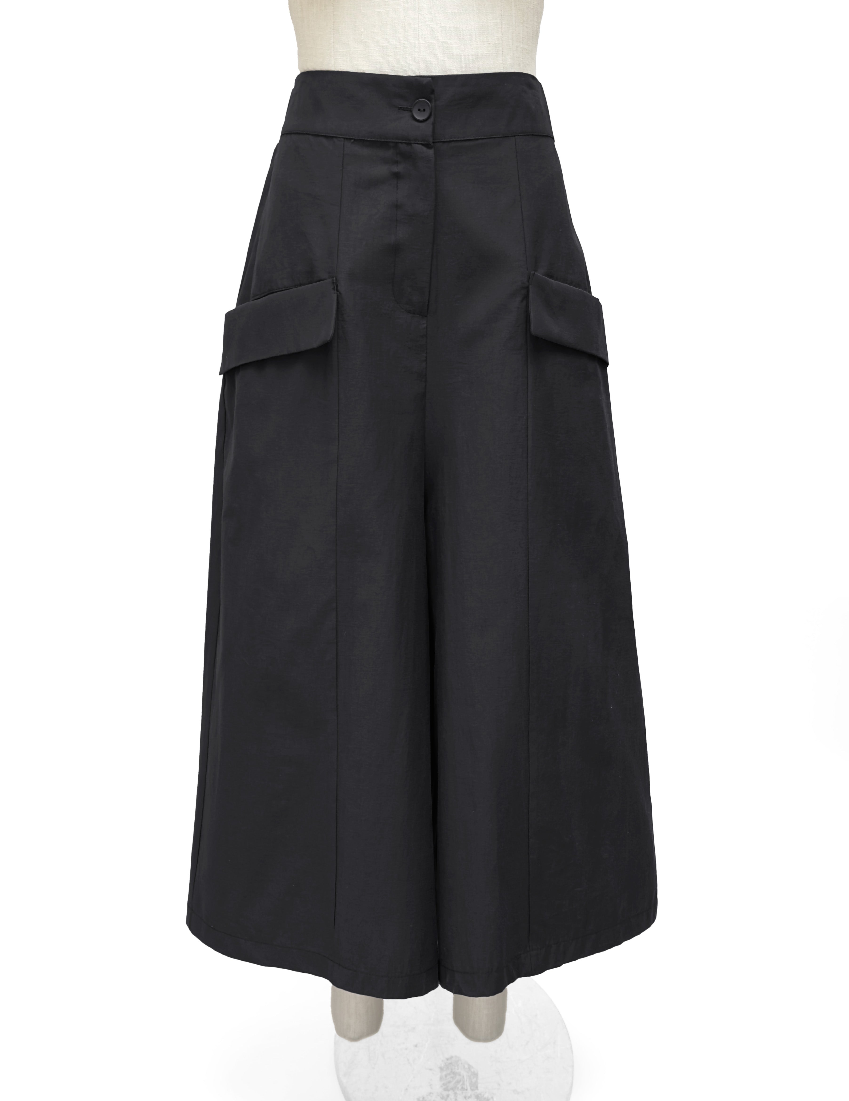 This drop rise pant has a zipper fly closure and it is crafted from a light viscose blend fabric featuring large flap pockets at the front. It is a culotte style pant with a flat front and an elasticized waistband at the back. A stylish piece!