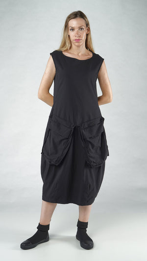 A sleeveless, pull-on dress in an elastic stretch blend. It features a close fitting cut that curves out at the waist into a soft balloon shape and tapers again at the bottom. It has slash pockets and two large flap pockets at the front for a unique statement. It features a flattering boatneck. An easy dress.