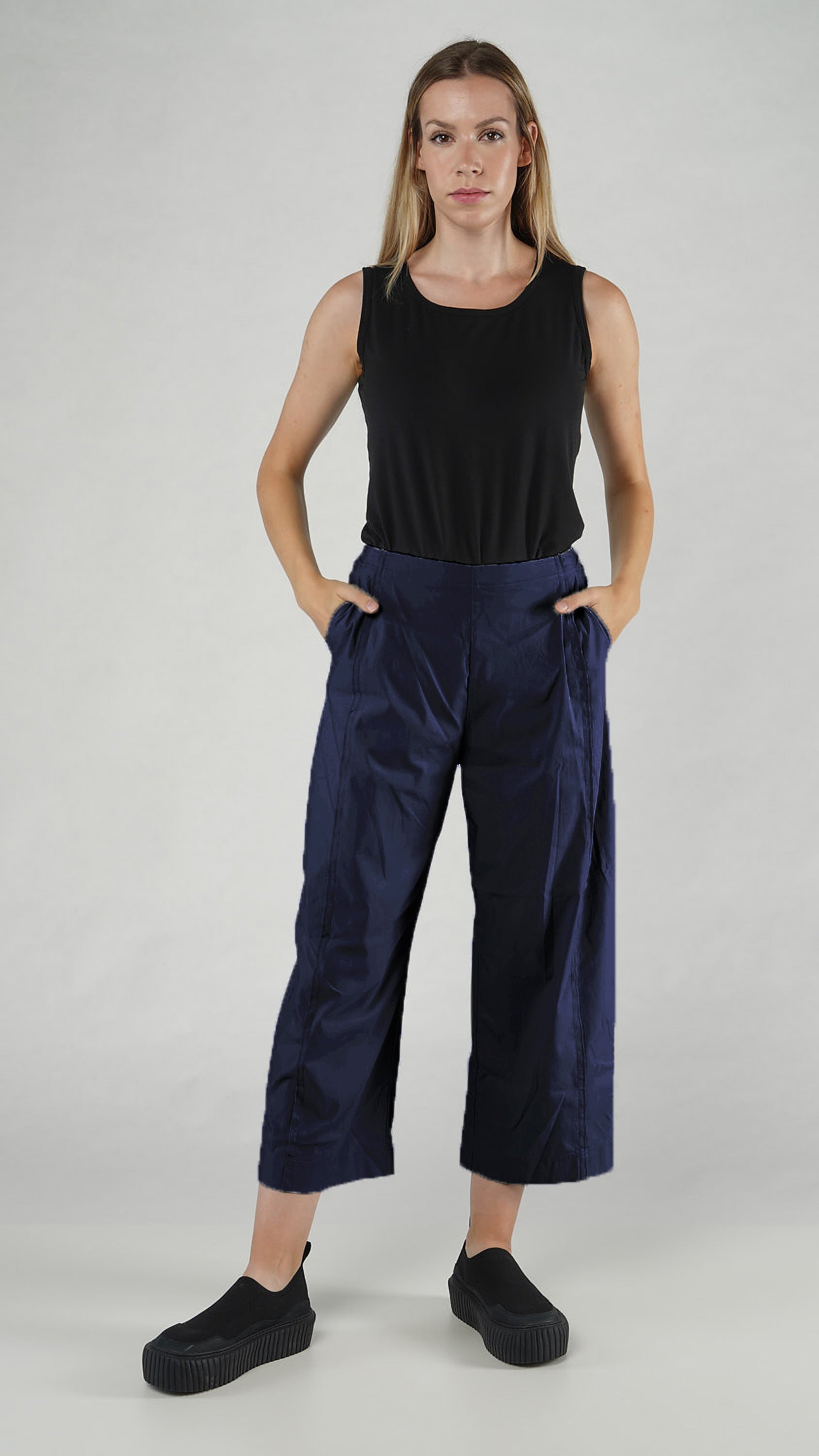 A wide-leg pant in an elastic stretch blend that falls to the ankle. It is a regular-rise, pull-on pant with an elastic waistband and features flattering exposed, serged vertical seams. It has slash pockets at the front and two large patch pockets at the back.