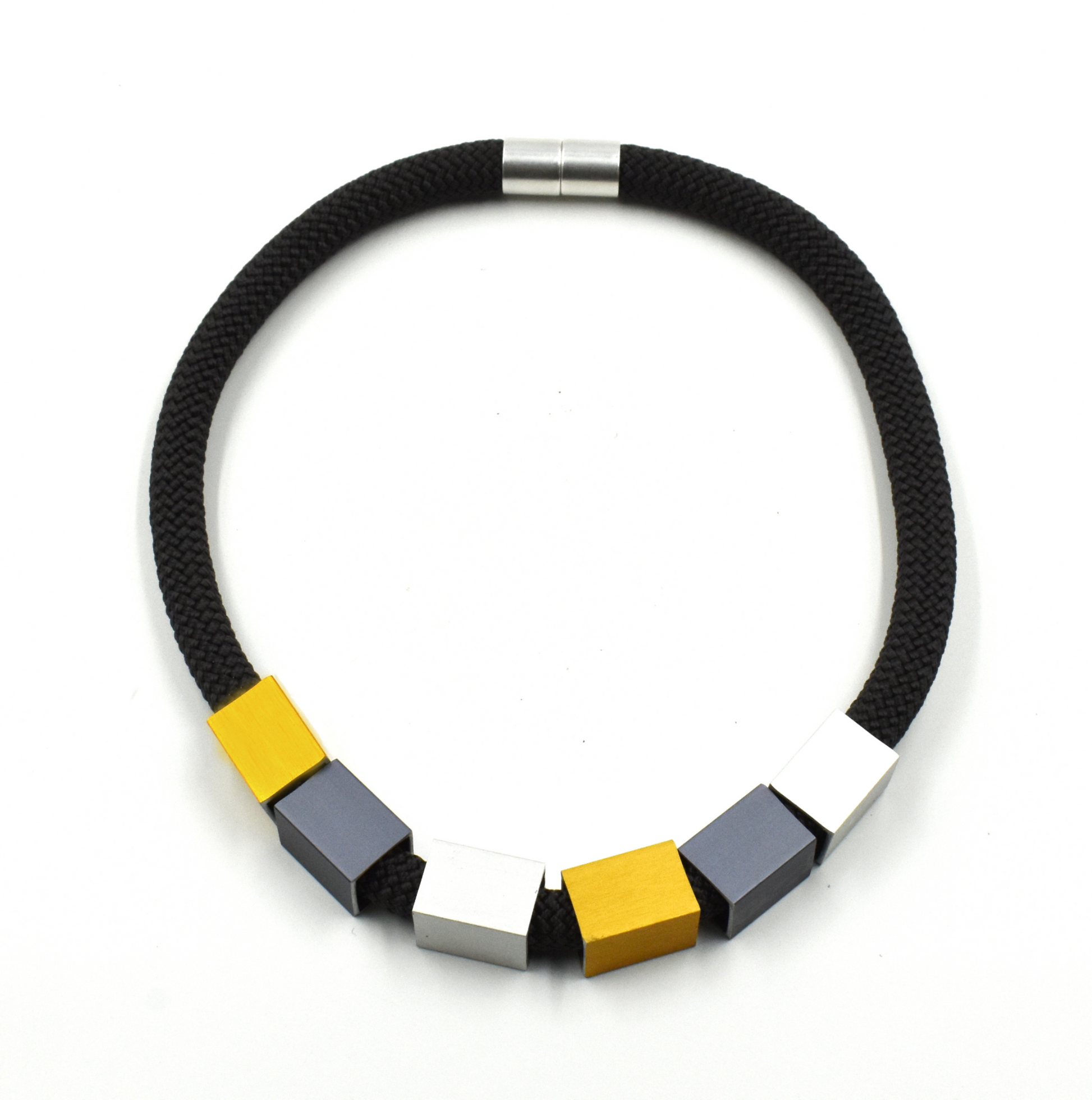 This collar completes any outfit, it features a single cord with aluminum box beads and fastens with a magnetic closure. It is extremely lightweight.