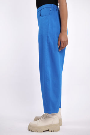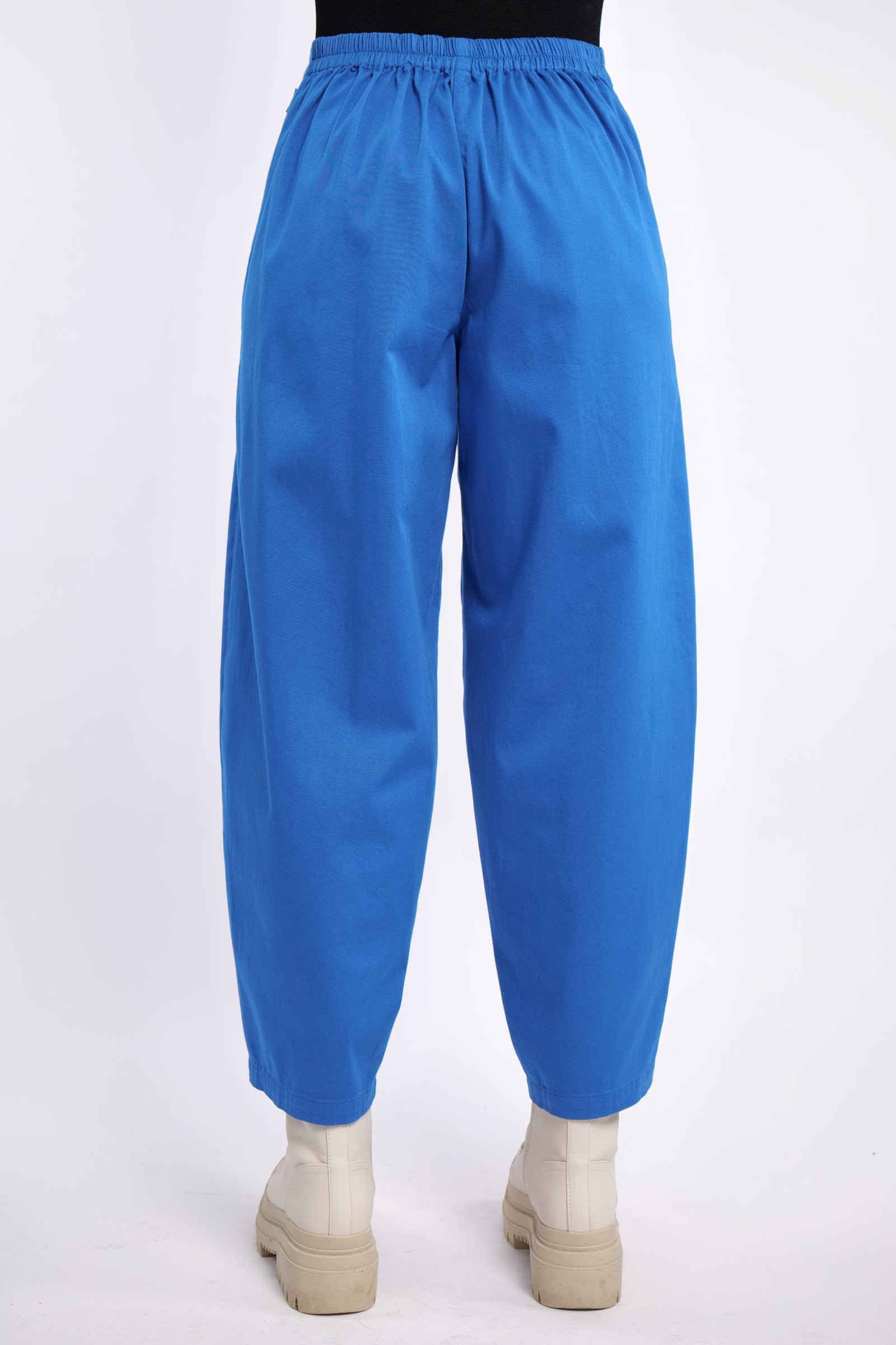 This Elemente Clemente pant has a barrel leg silhouette and it is crafted from a sturdy cotton blend fabric. It features 2 curved pockets and a welt pocket at the front. It slightly tapers down at the bottom and lands just above the ankle. It has a flat front and an elasticized waistband at the back for comfort.