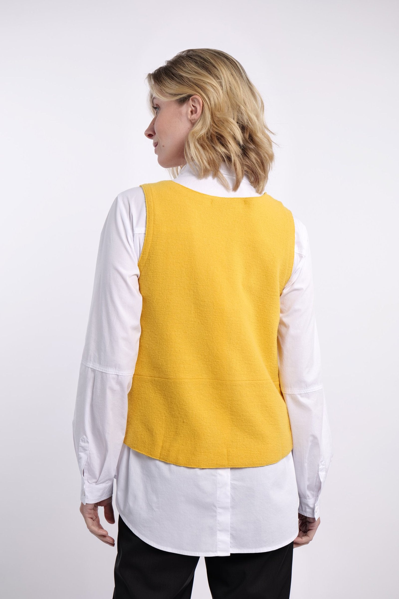 This vest is crafted from 100% wool, designed to be dressed up and down. It features a V-neck, a front button closure and a yoke seam at the back. It has two integrated pockets at the front for practicality.
