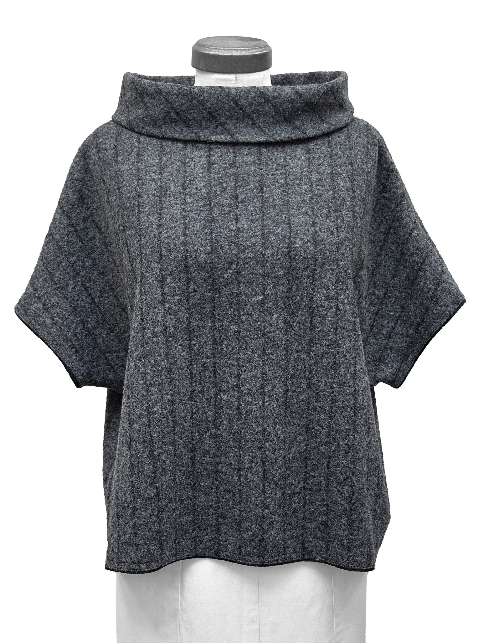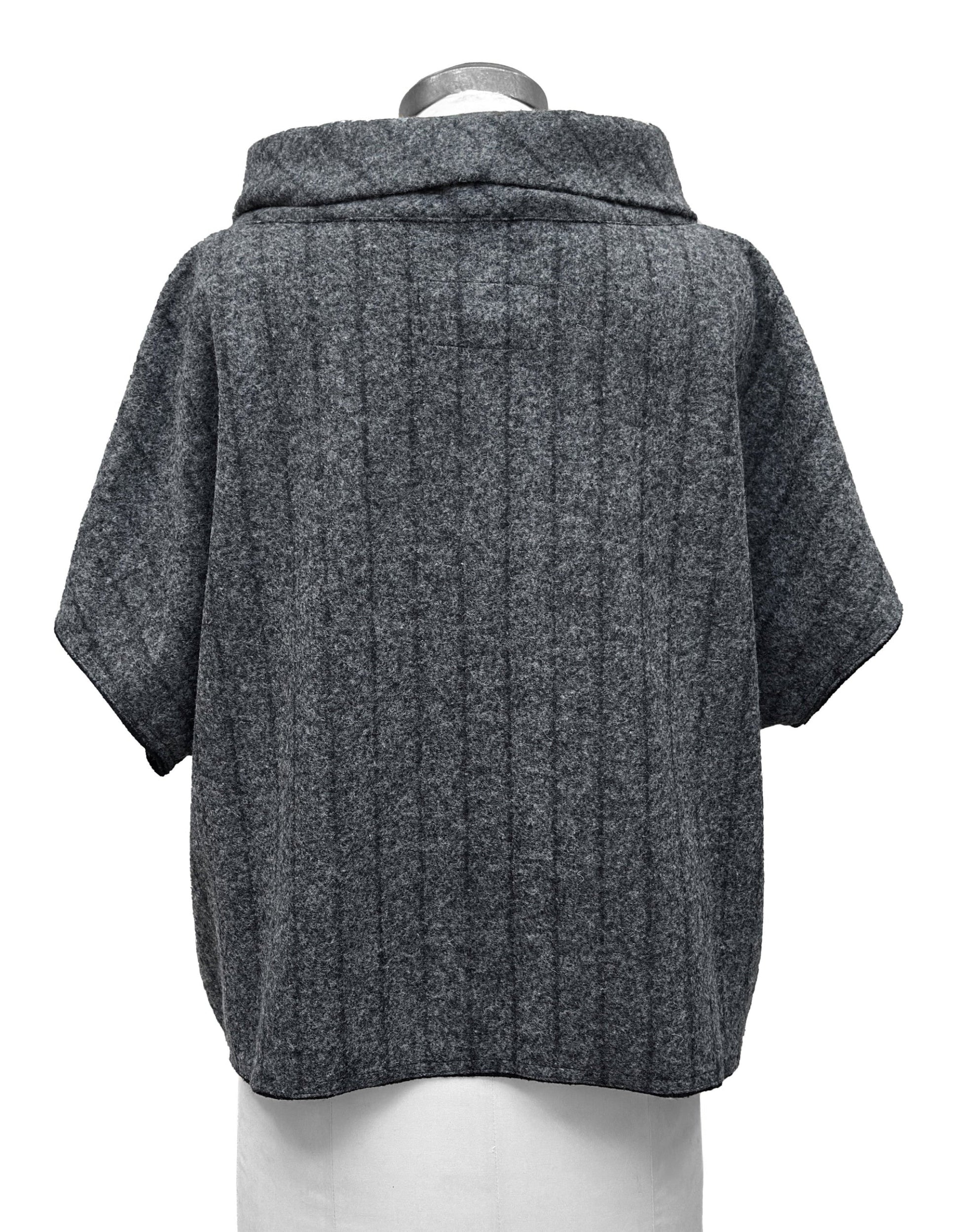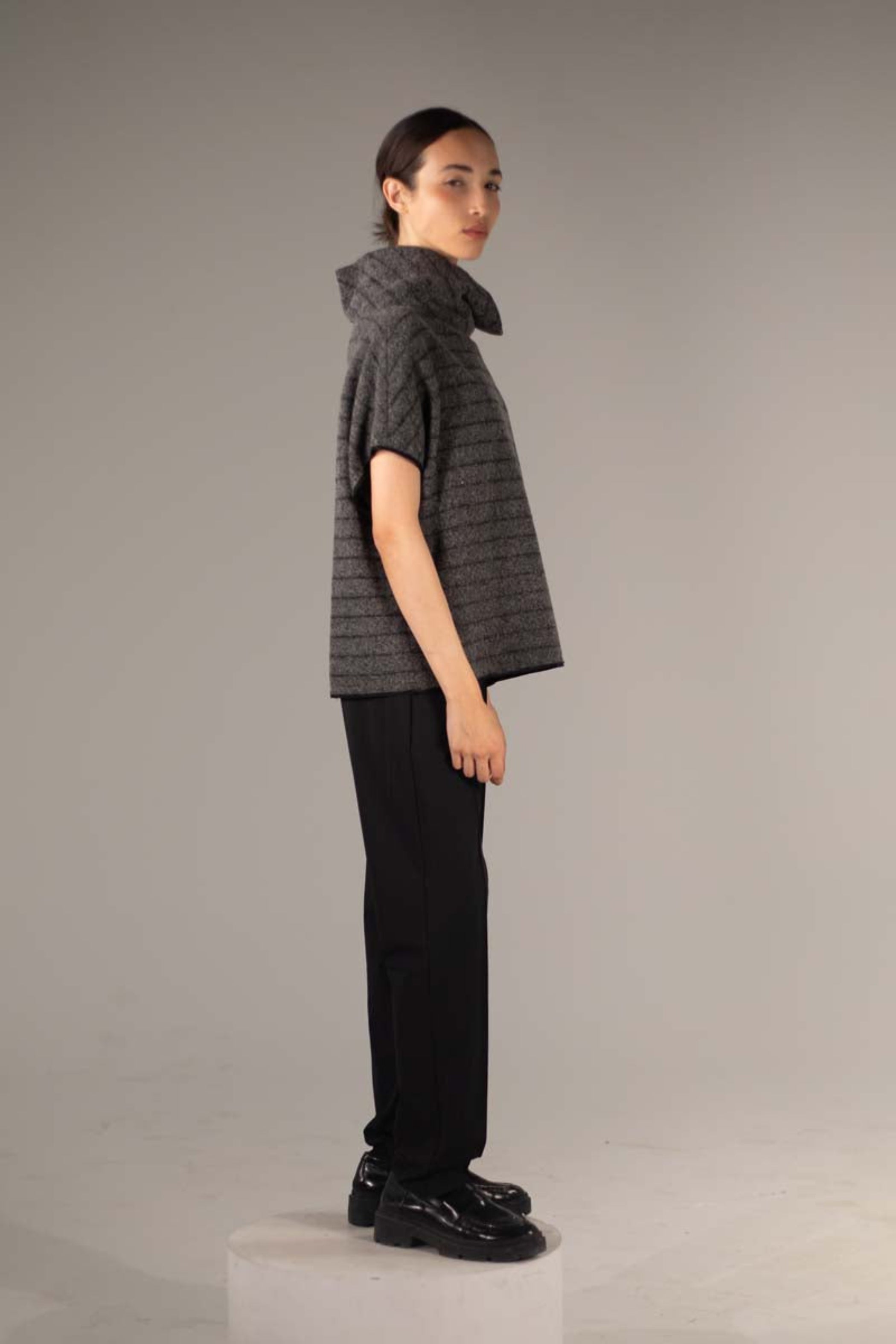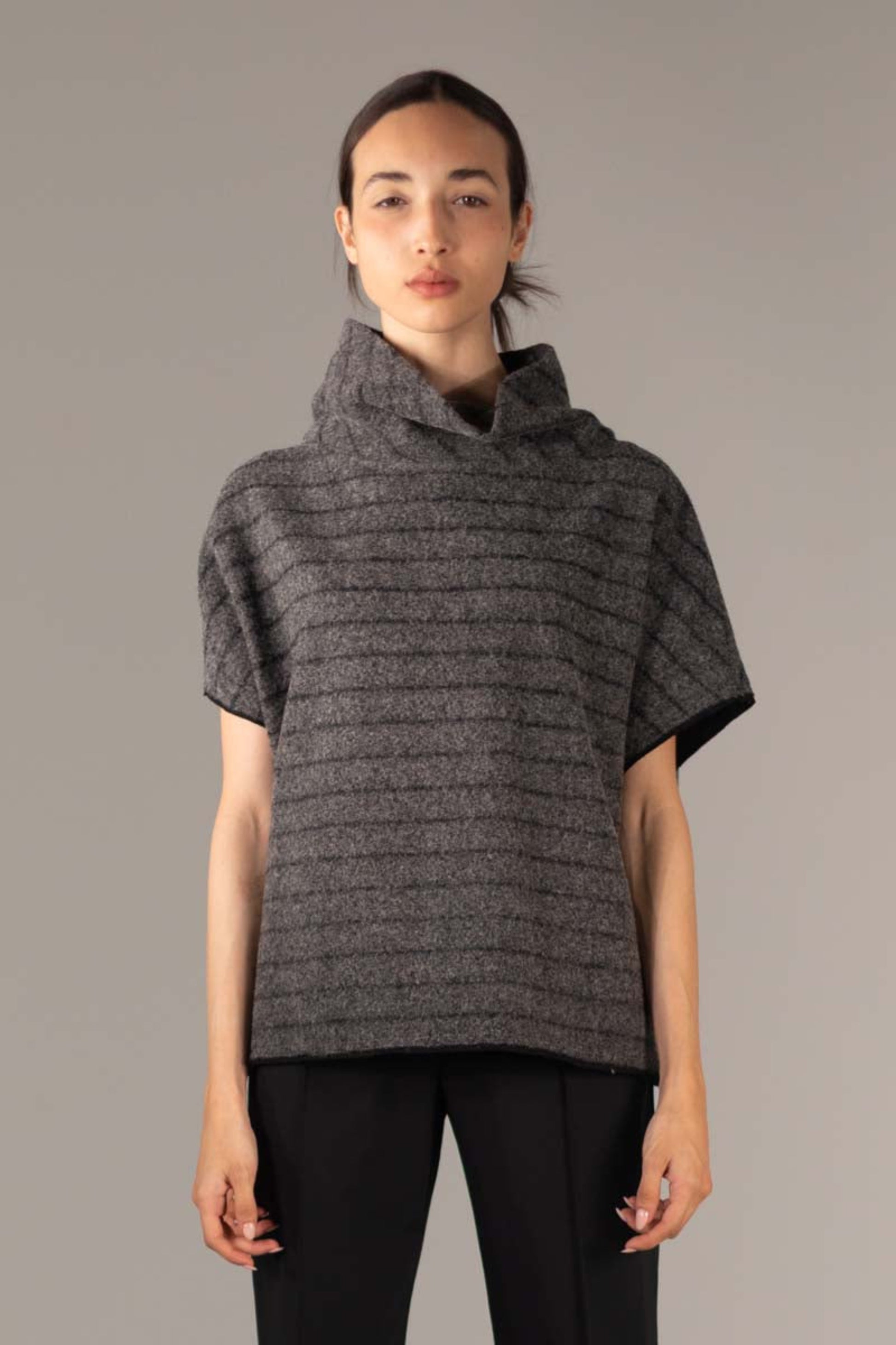 This pullover is constructed from a blend of boiled wool and silk, featuring black vertical stripes*. Its boxy fit, short dropped sleeves, and turtleneck design make it a classic style to layer over any outfit. This pullover falls at the upper hips.