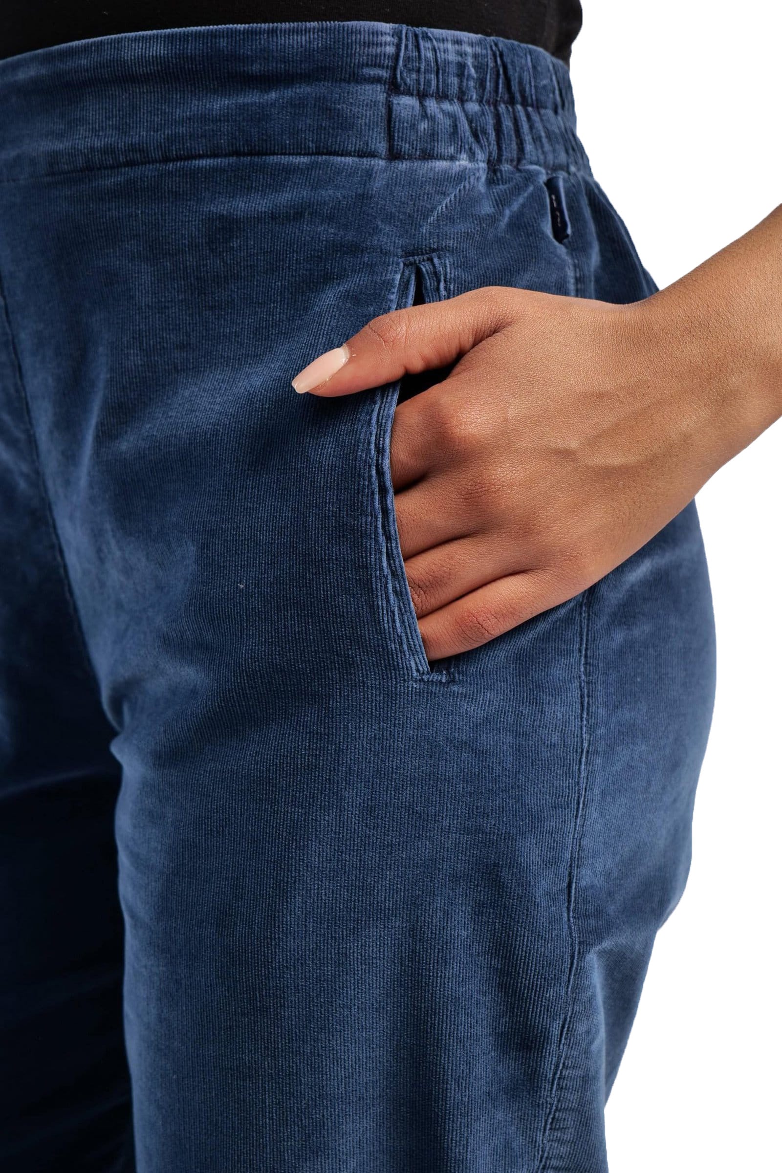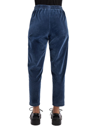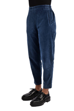 A tapered fine wale corduroy pant with pockets and a slight stretch. This pant is flat through the front, elastic through the back waistband, with front slit pockets. This pant is roomy in the hips and tapers to the hem, falling full-length.