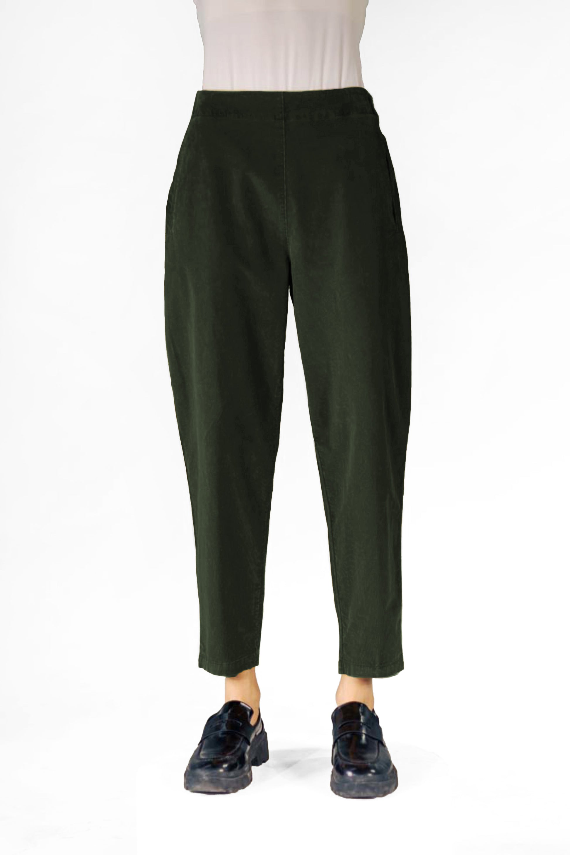 A tapered fine wale corduroy pant with pockets and slight stretch. This pant is flat through the front, elastic through the back waistband, with front slit pockets. This pant is roomy in the hips and tapers to the hem, falling full-length.