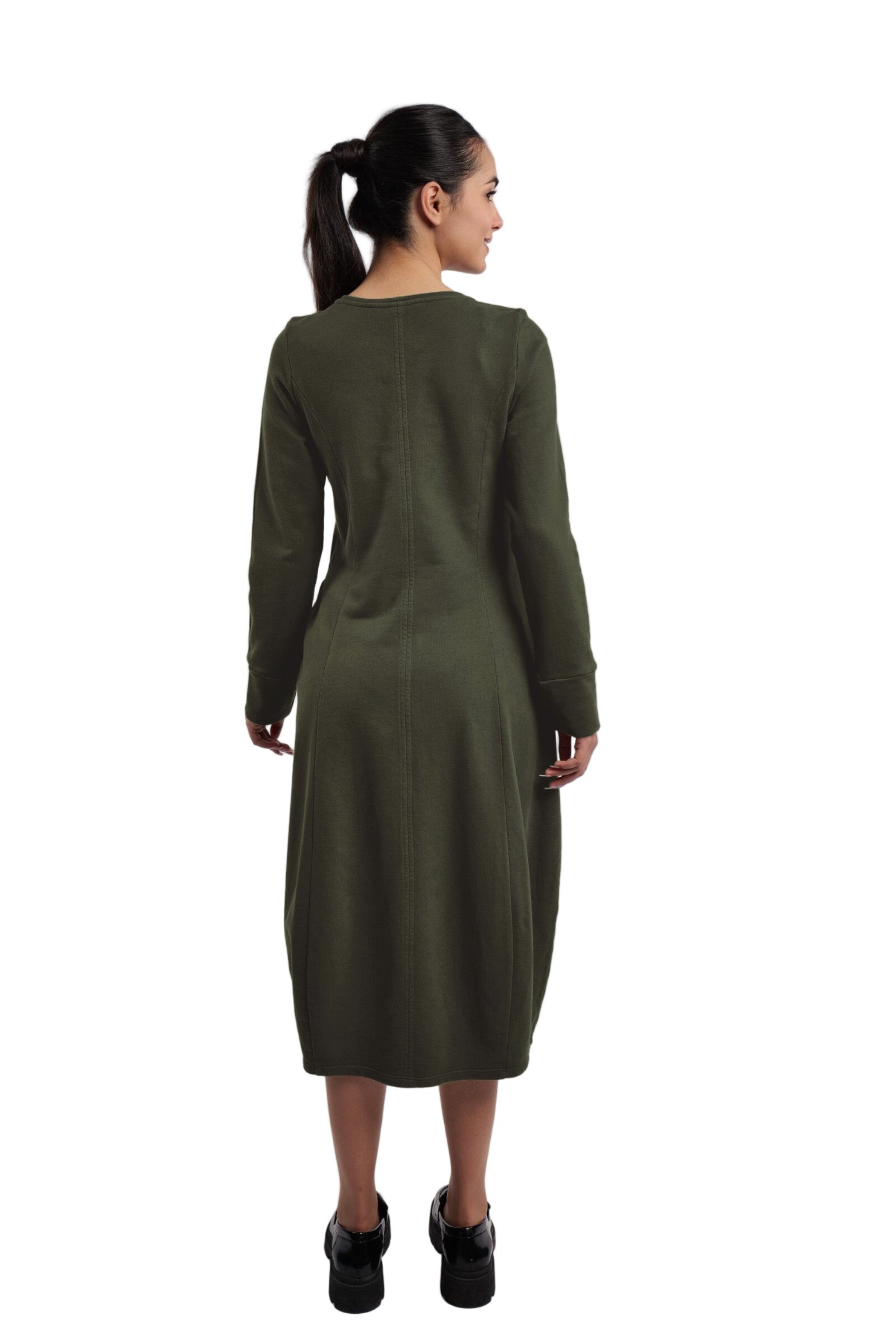 A long bubble dress by Elemente Clemente crafted from a soft cotton French Terry. It has long, cuffed set-in sleeves, side seam pockets and a high round neckline. This dress features princess seams both at the front and back and has a relaxed fit throughout the hips.