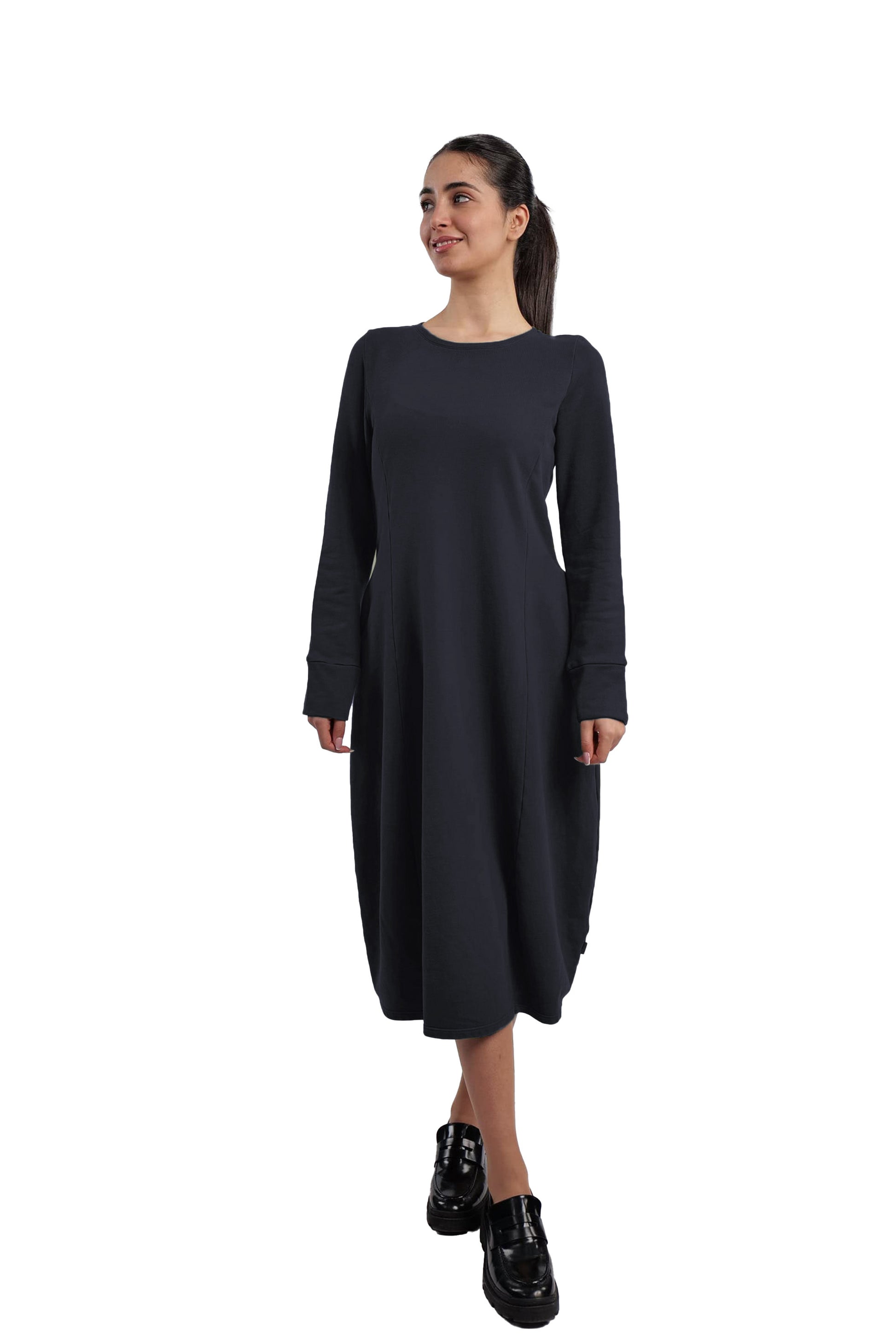 A long bubble dress by Elemente Clemente crafted from a soft cotton French Terry. It has long, cuffed set-in sleeves, side seam pockets and a high round neckline. This dress features princess seams both at the front and back and has a relaxed fit throughout the hips.