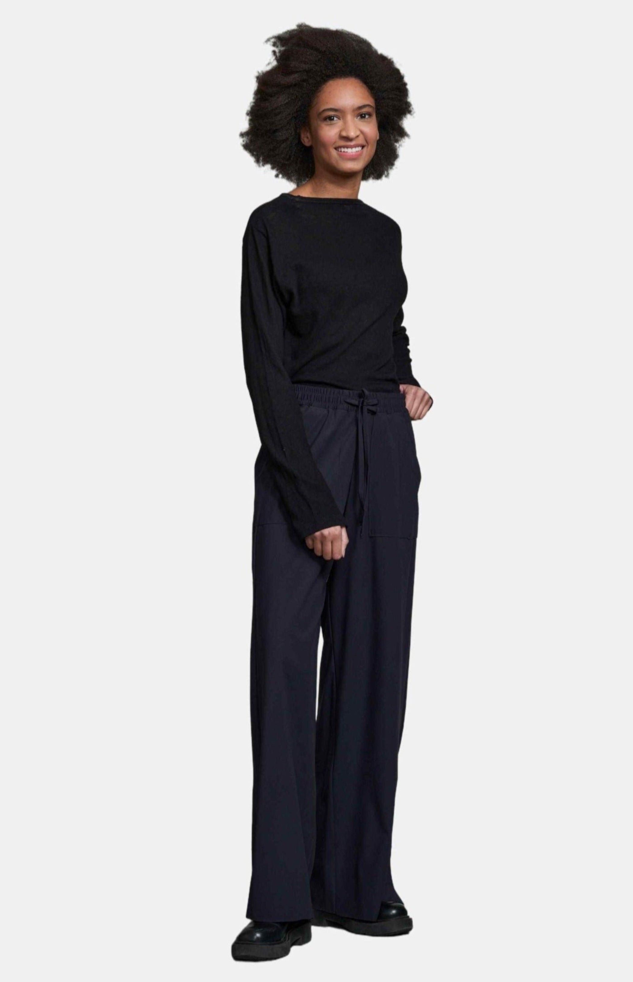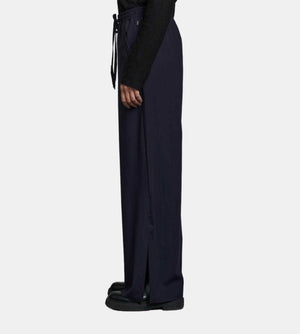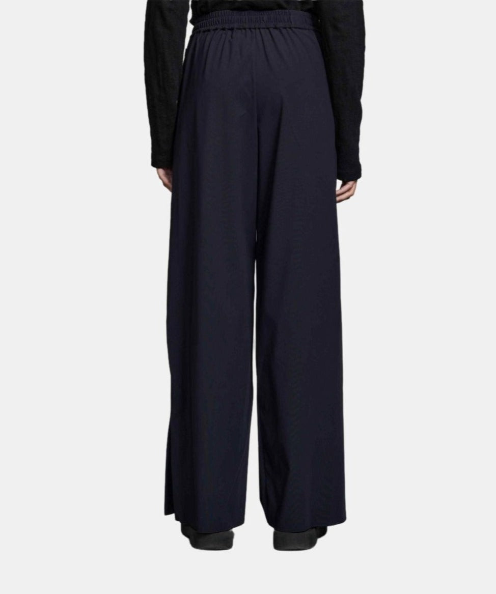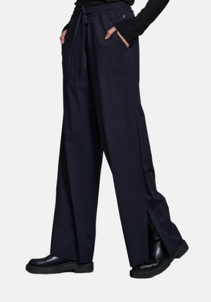 This pant is crafted from a technical fabric, they feature a drawstring elasticized waistband and a wide leg straight silhouette. For added practicality, these pants feature two front pockets, 9" side slits at the bottom, and a full length fit.