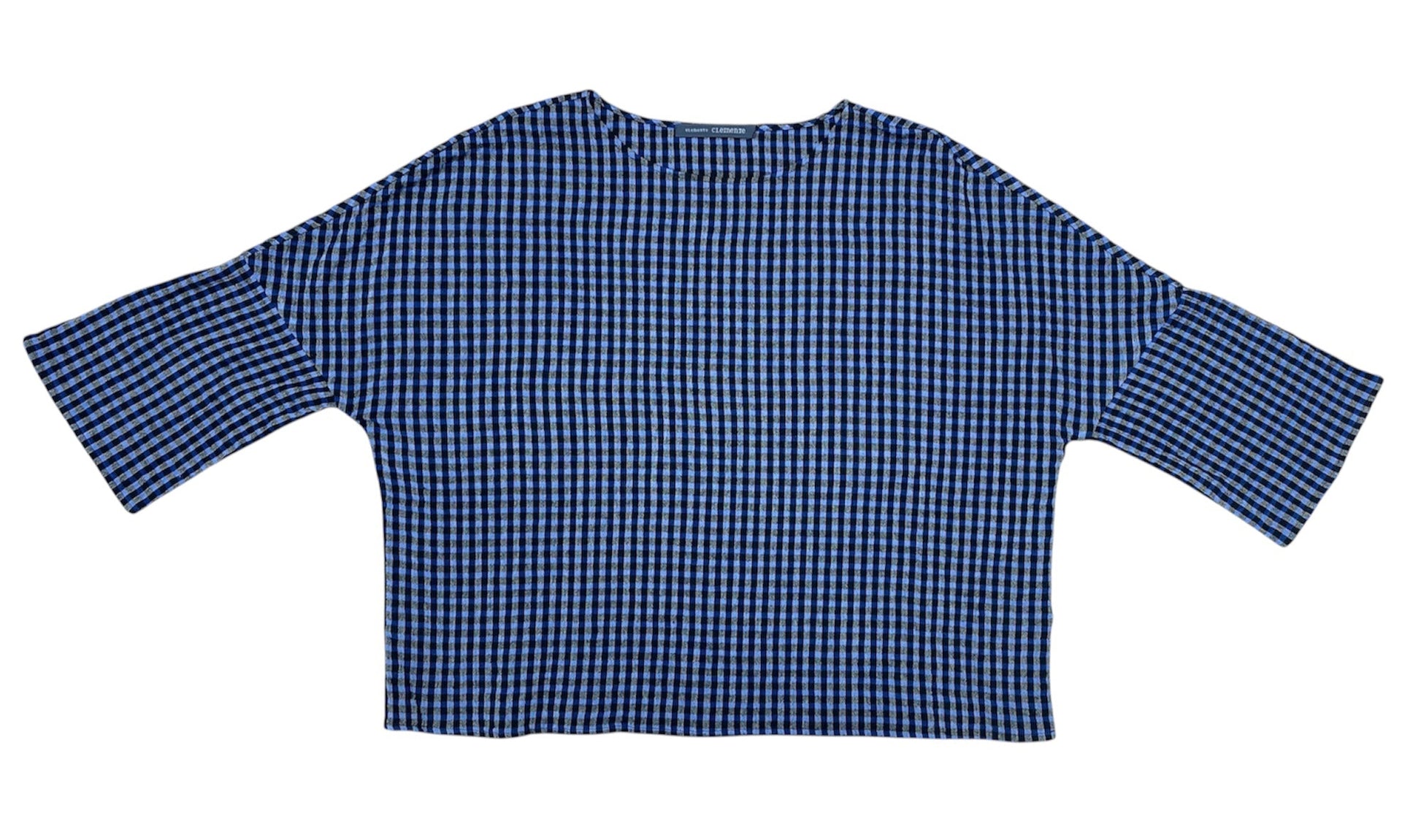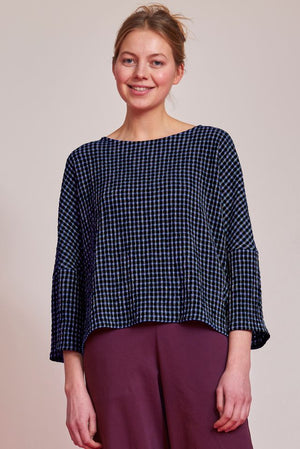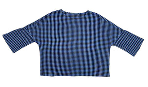 A boxy blouse with long sleeves. It has a high, wide neckline and very dropped shoulders. This blouse falls cropped, at the hips in length. This top is an easy layer over sleeveless pieces or for sun protection.