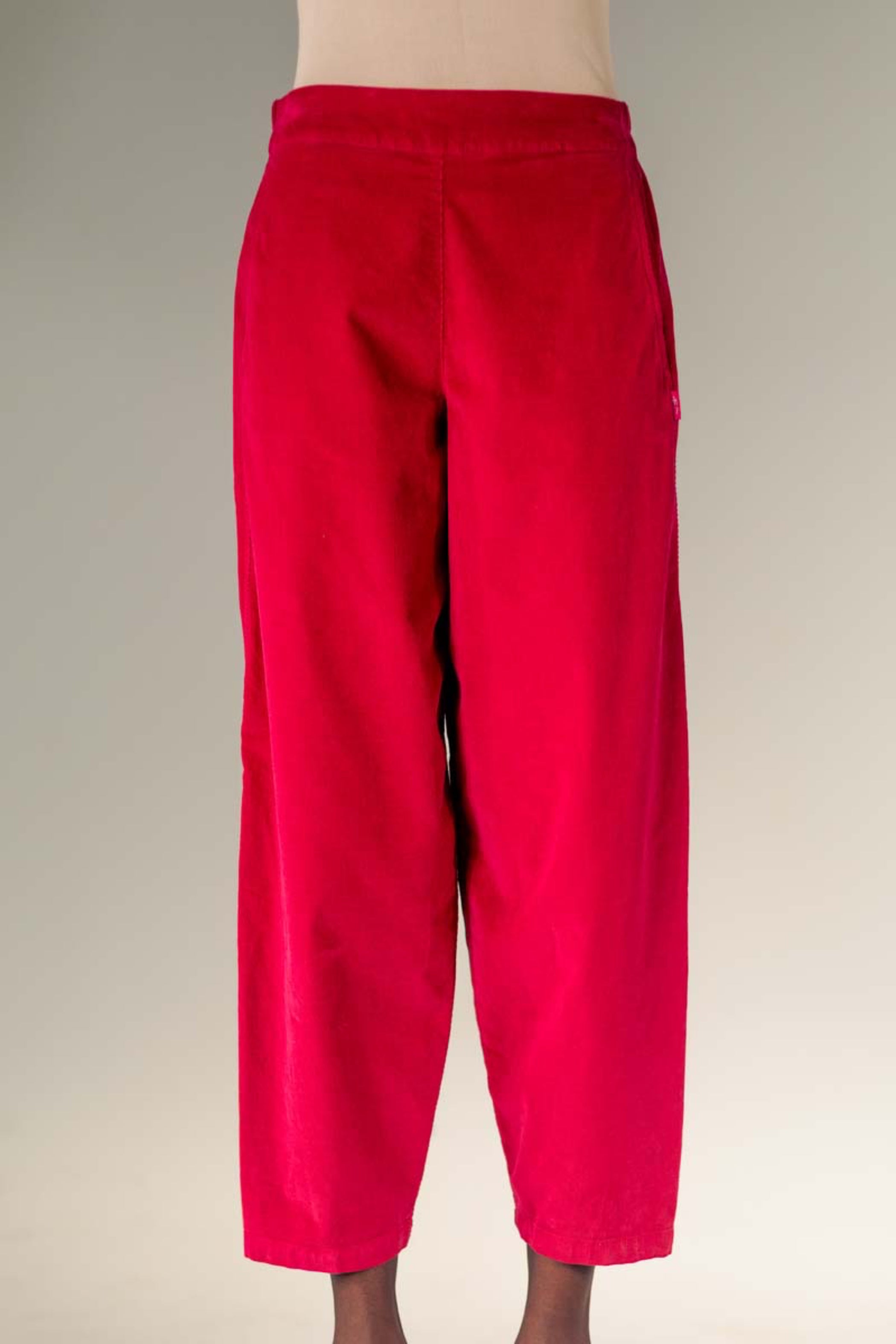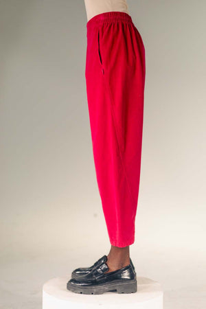 A barrel leg pant with pockets and a bit of stretch in baby wale corduroy. This pant is flat through the front and elasticized through the back waistband, with front slit pockets. This pant is roomy in the hips and slightly tapers towards the hem, falling above the ankle.