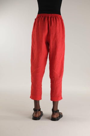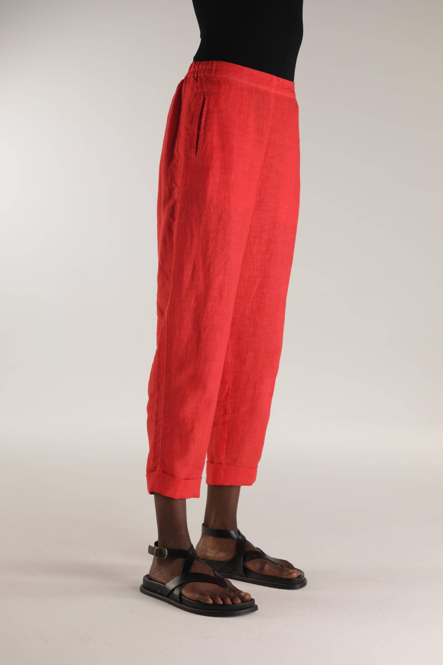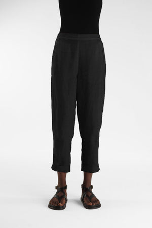 A classic tapered pant with pockets. This pant is flat through the front, elastic through the back waistband, with front slit pockets. It is roomy in the hips and tapers to the hem, falling full-length with a small cuff.