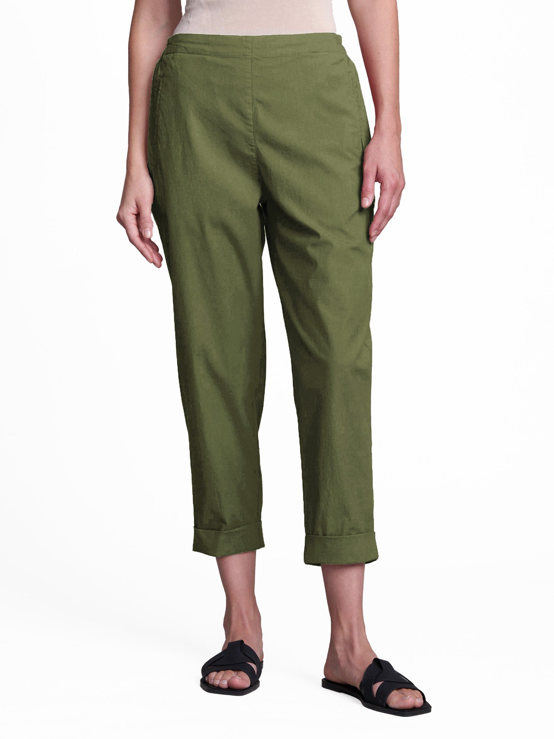 A classic tapered pant crafted from an organic cotton with stretch. This pant has a front with an elasticized waist at the back and features slit pockets. It is roomy in the hips and tapers to the hem, falling full-length with a small cuff.
