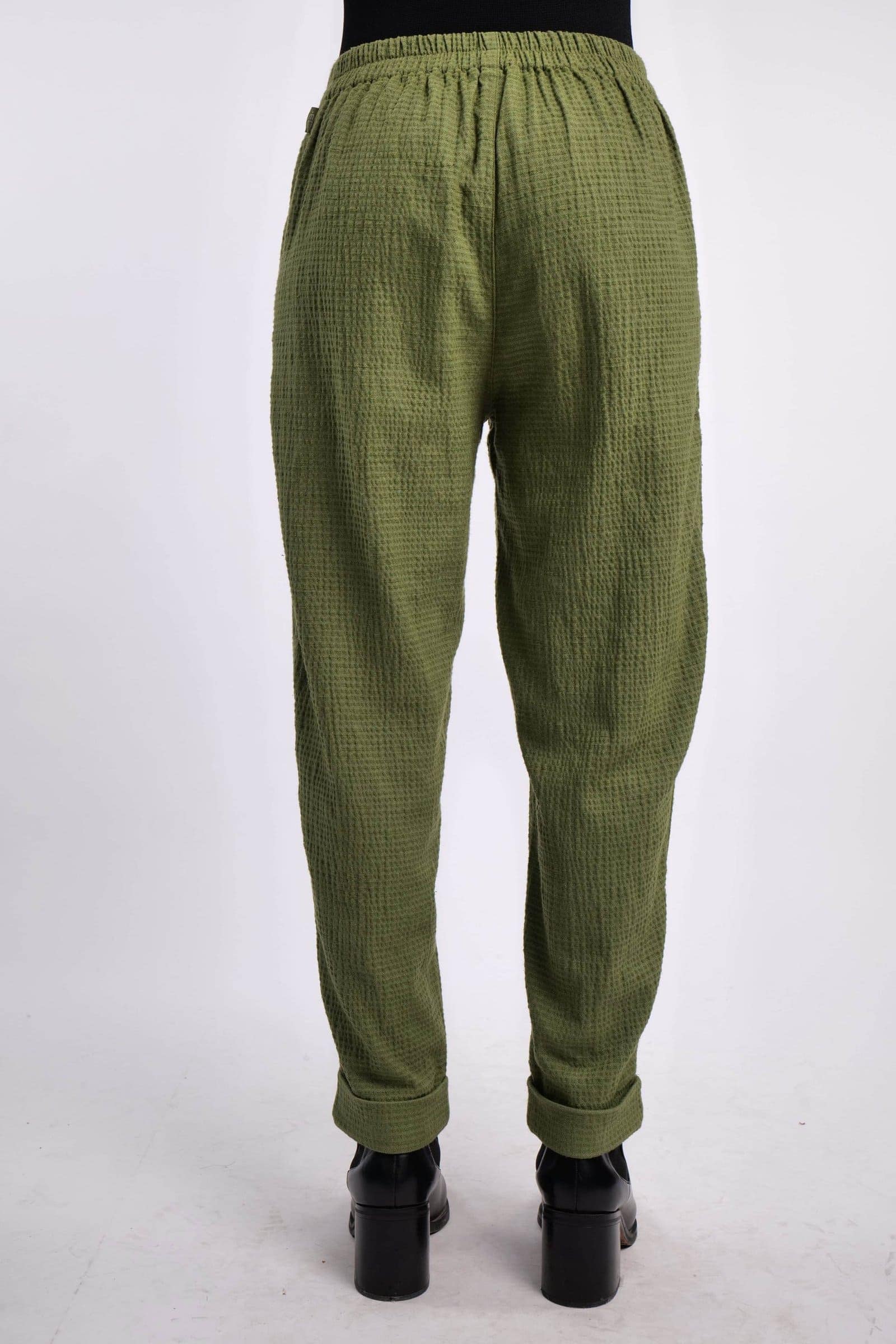 A tapered pant with pockets and a bit of stretch. This pant is flat through the front, elastic through the back waistband, with front slit pockets. This pant is roomy in the hips and tapers to the hem, falling full-length with a small cuff.