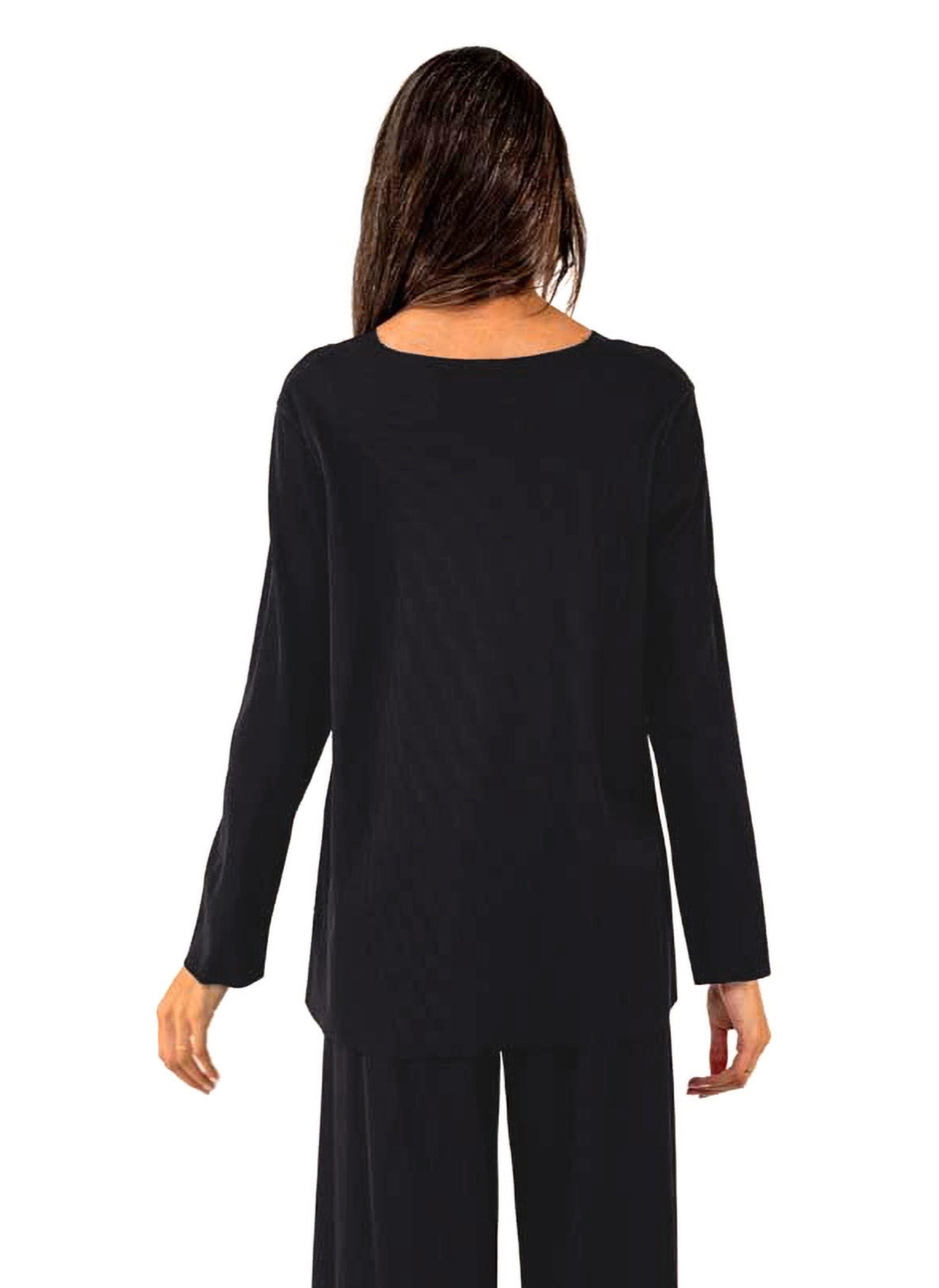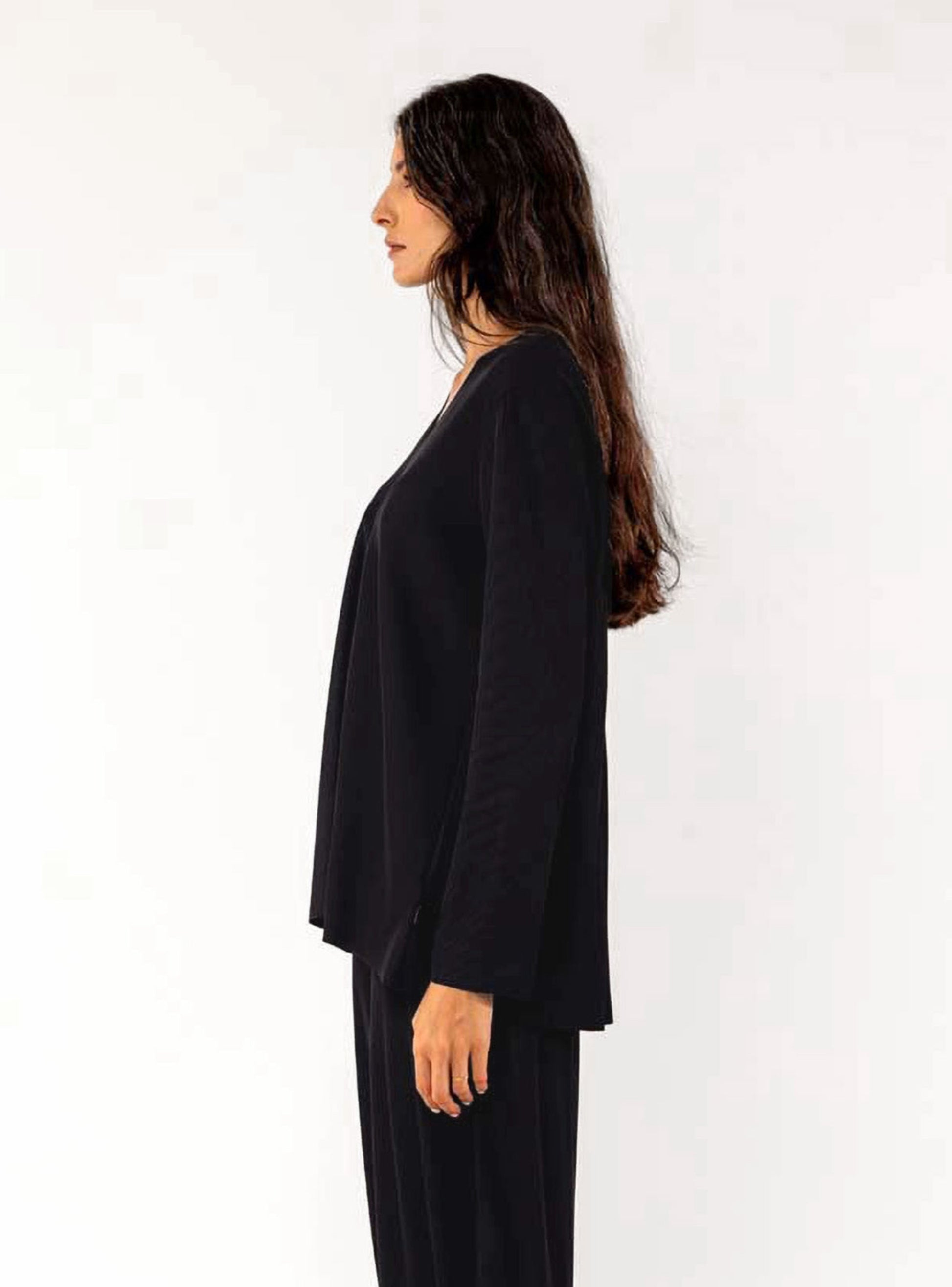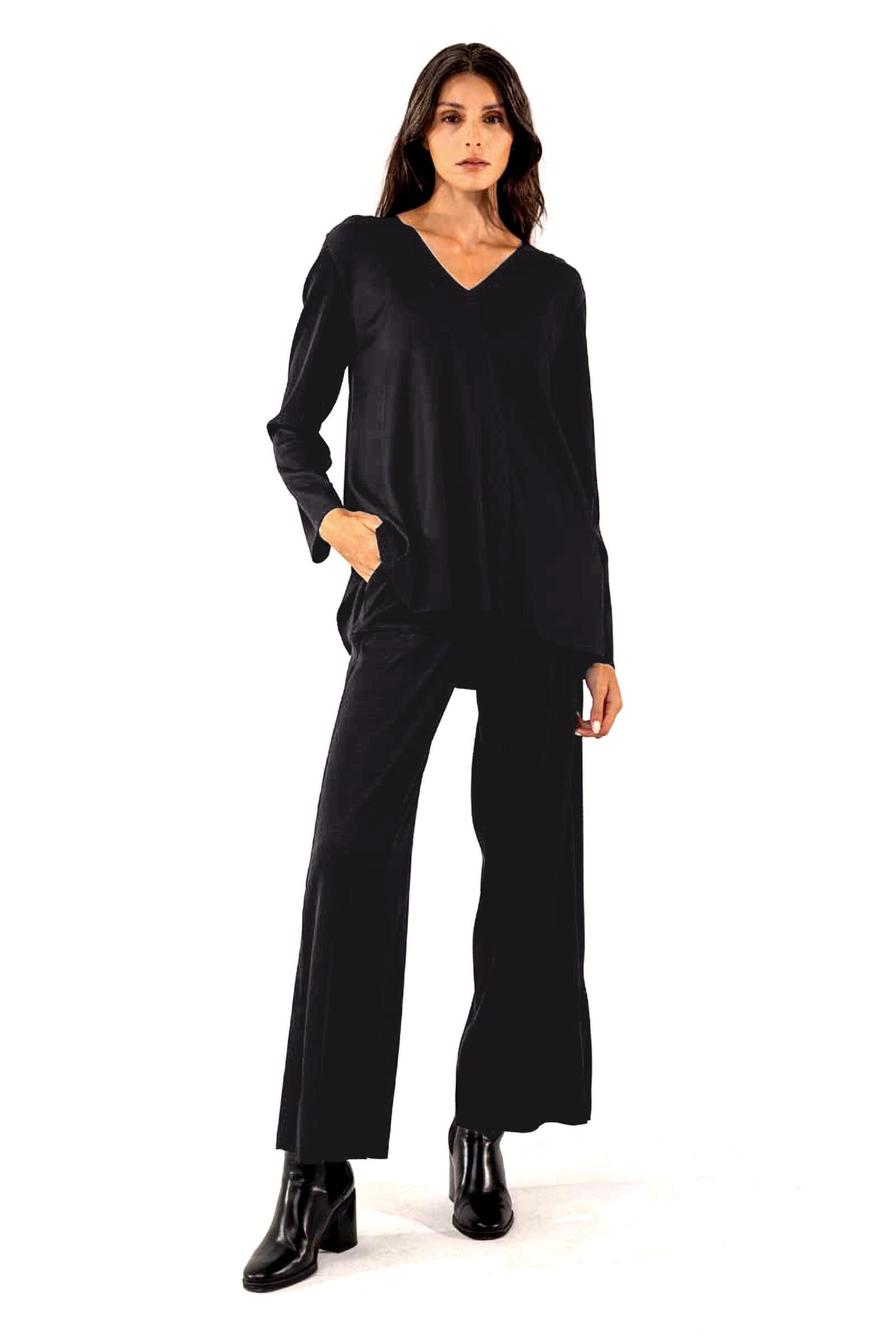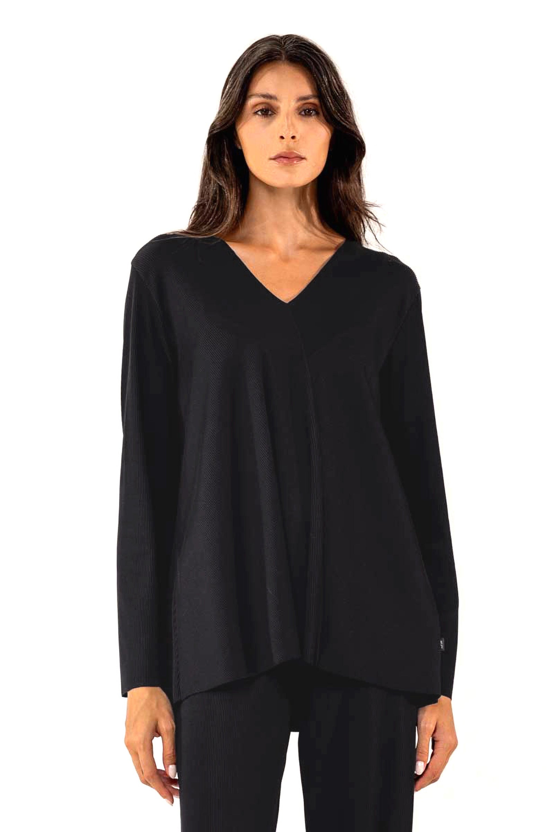 Gorgeous A-line shirt made from a ribbed stretch fabric. features a diagonal seam from the v-neckline to the bottom raw edge. Relaxed fit with a flattering silhouette that flares at the hip. Long relaxed sleeves with a raw edge hem. Very easy care wash and travel piece.