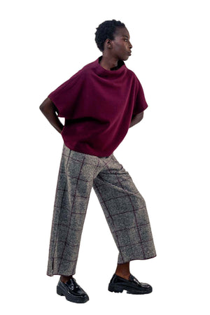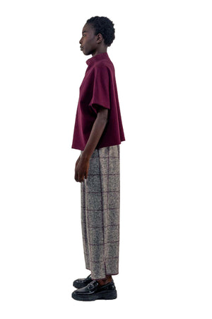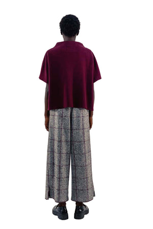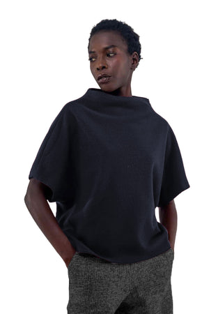 A loose boiled wool topper with a high funnel collar and dropped shoulders. The fabric is a light boiled wool that can layer over any piece. The collar and cuffs are double-thick and top stitched for a firm shape. This top falls hip-length.