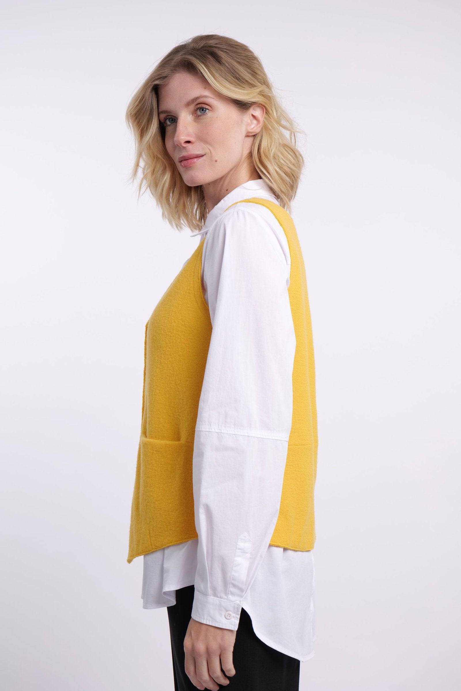 This vest is crafted from 100% wool, designed to be dressed up and down. It features a V-neck, a front button closure and a yoke seam at the back. It has two integrated pockets at the front for practicality.