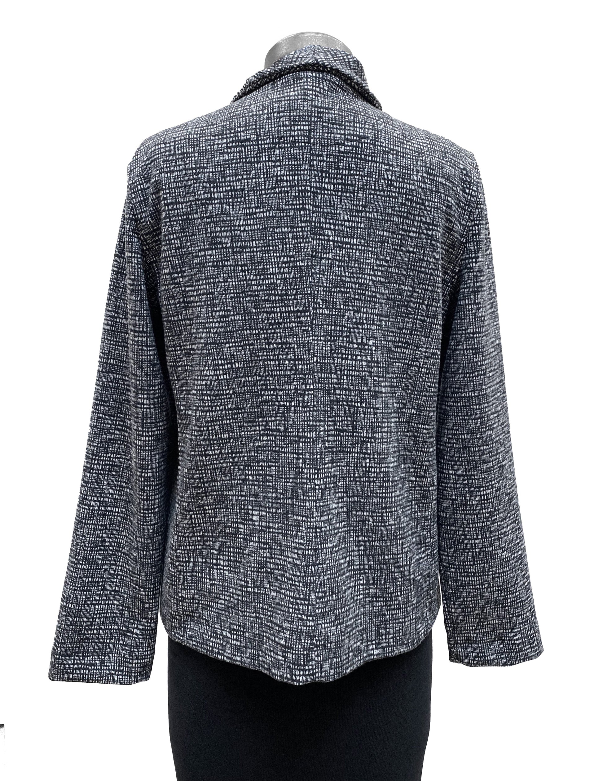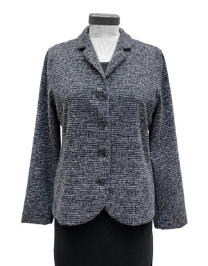 A medium-weight jacket crafted from a soft jacquard knit featuring an abstract grid pattern. This jacket has a notched collar, 4 buttons through the front and princess seams both front and back to create a fitted look. A flattering piece.