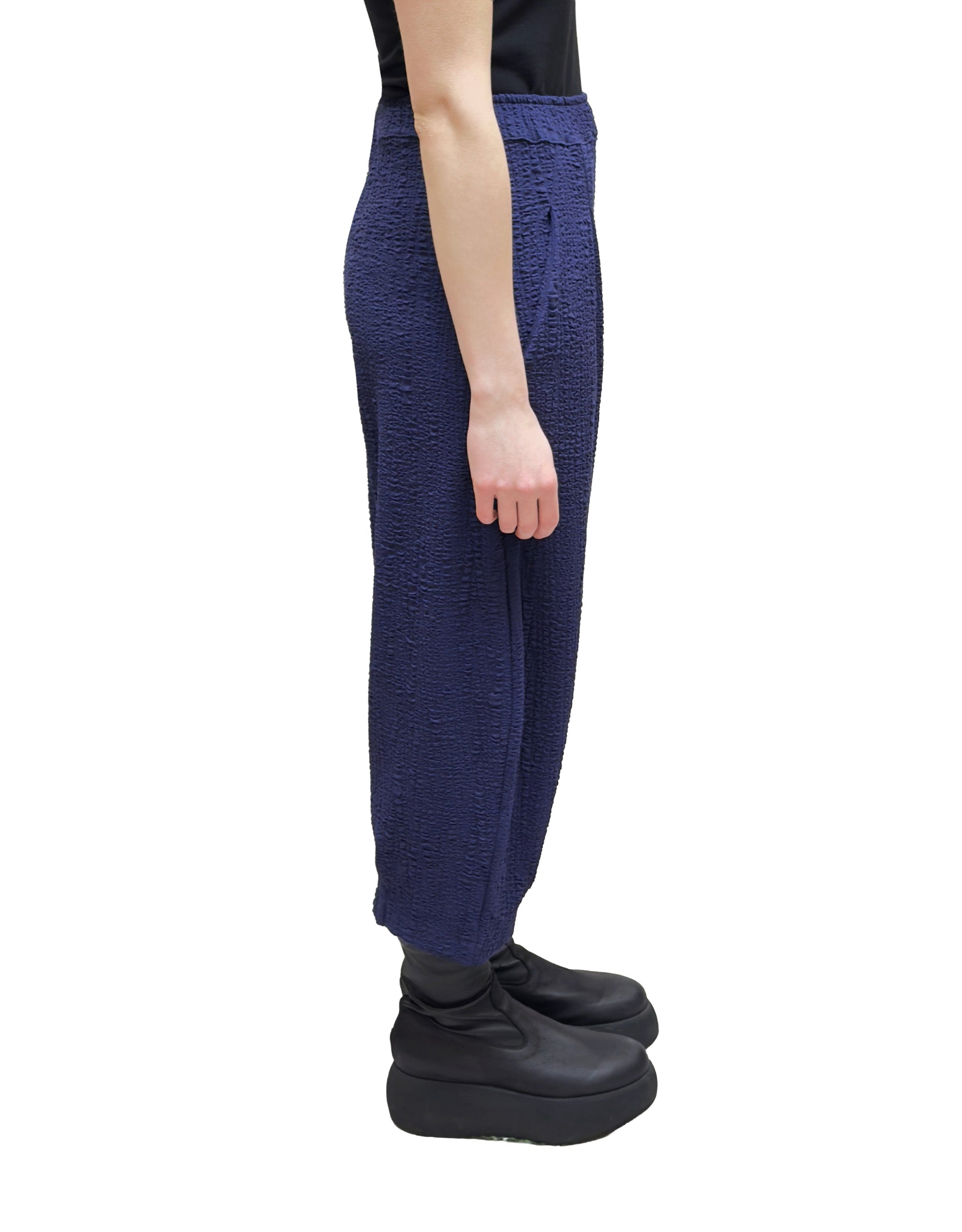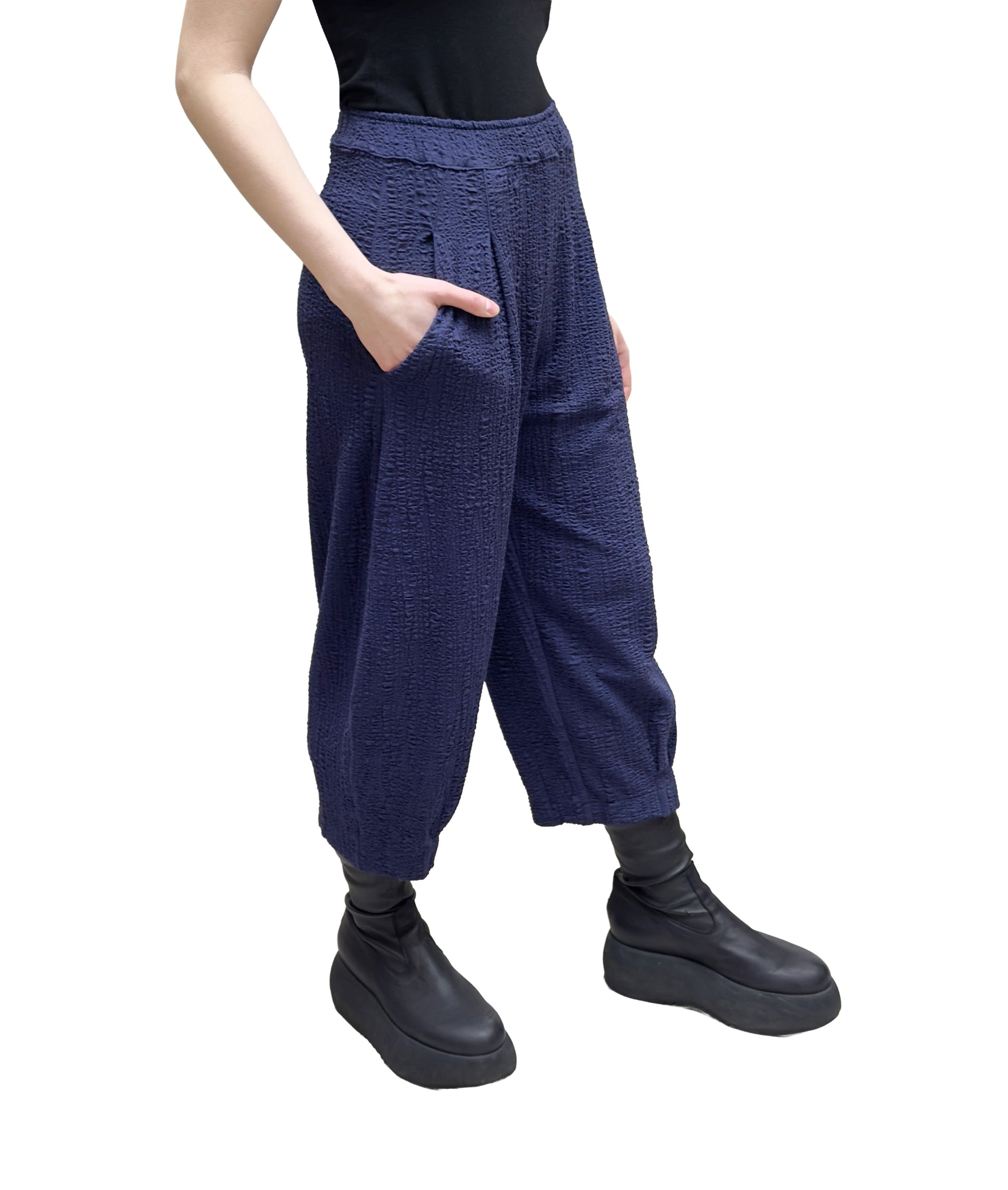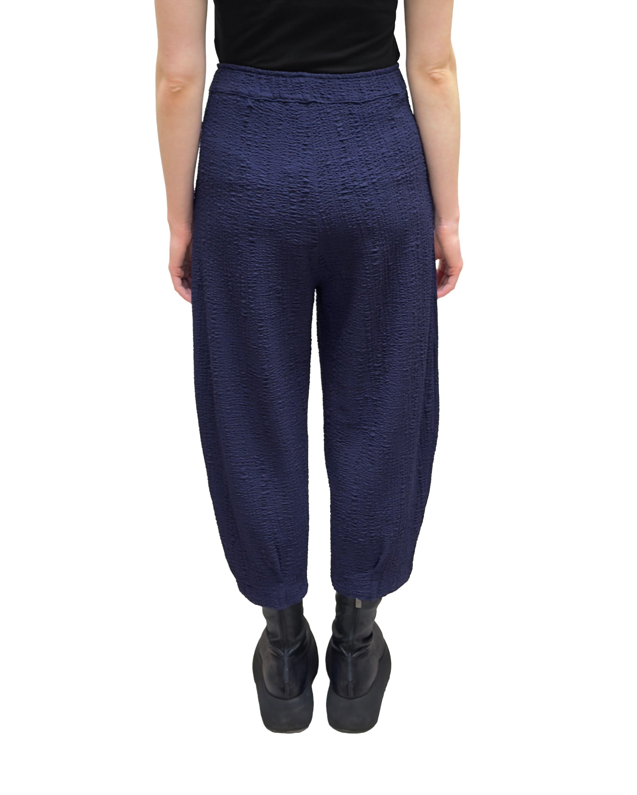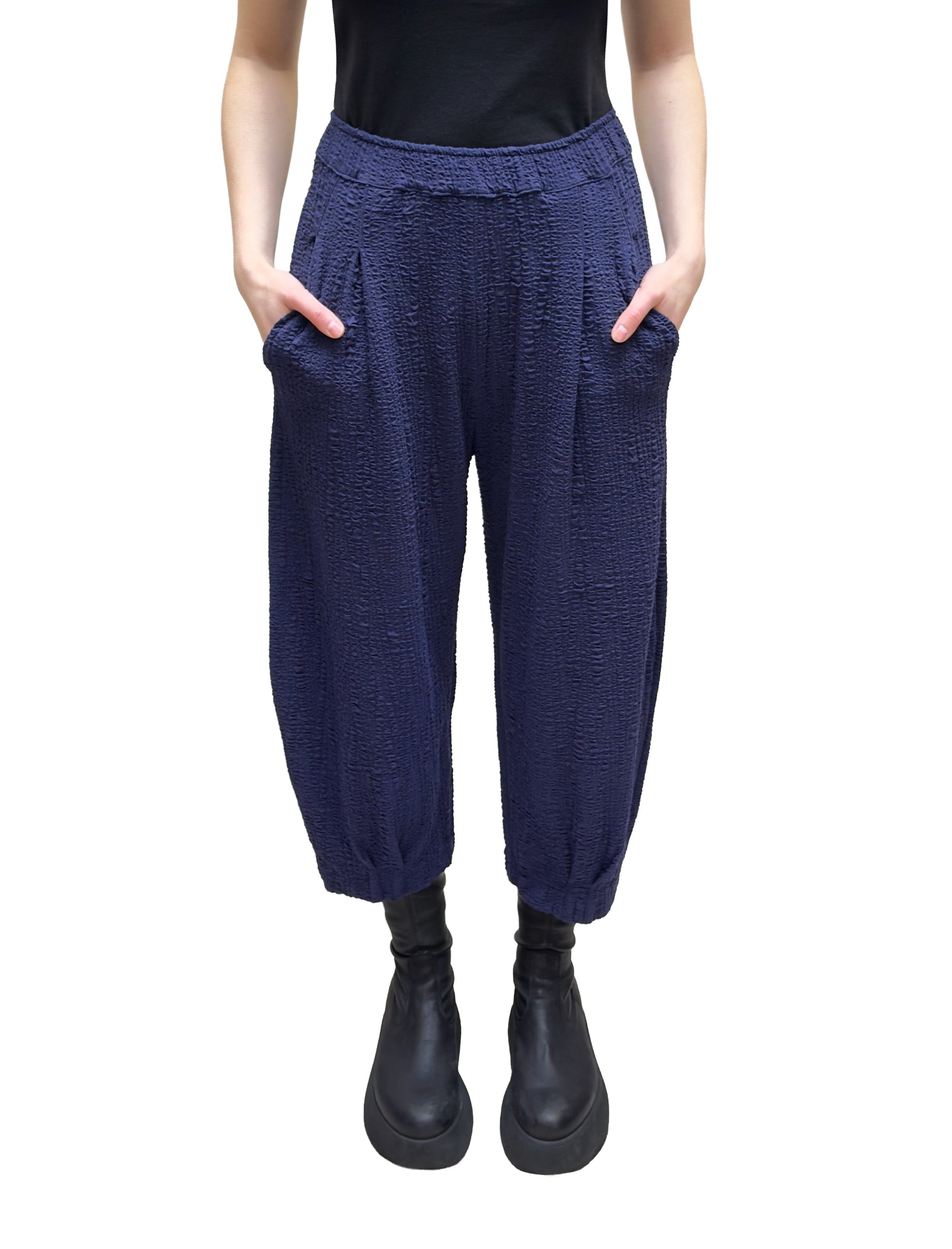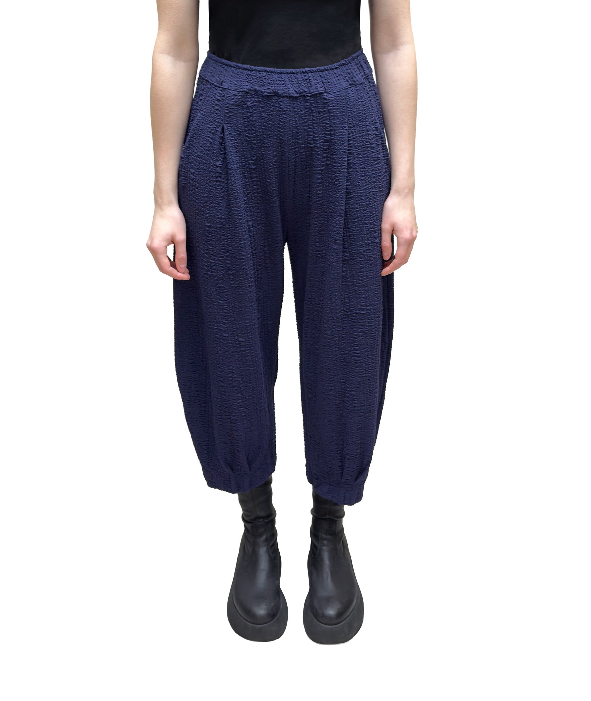 A medium-weight pant in a soft textured jacquard knit. Added comfort with an elastic waistband and 2 tucks in front giving room in the hips. The leg is rounded and tapers where it finishes at the ankle. There are pockets at the sides.