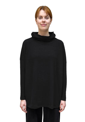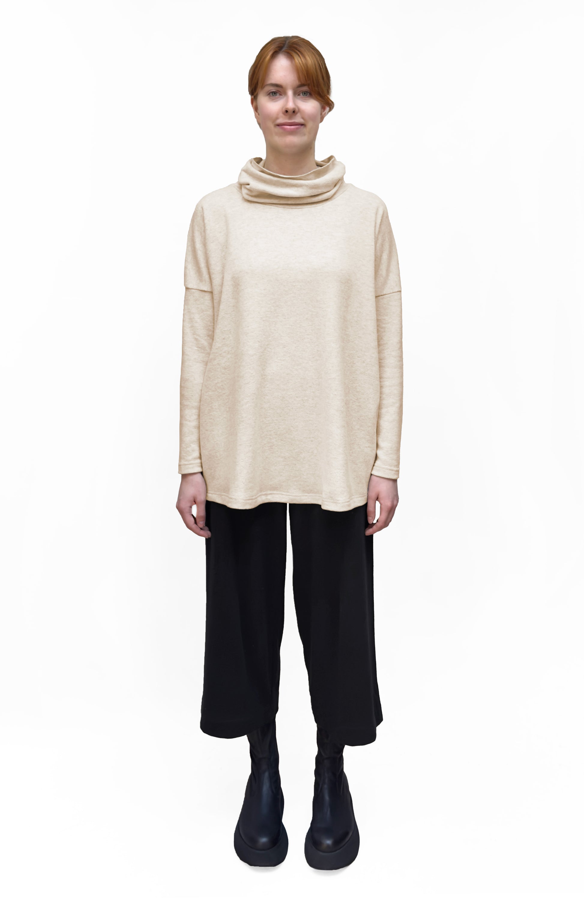 An oversized fit cowl sweater in Mama B's cozy knit fabric. It has dropped shoulders and fitted sleeves, with a long cowl neck. The slightly rounded hem falls mid thigh, making it tunic length.