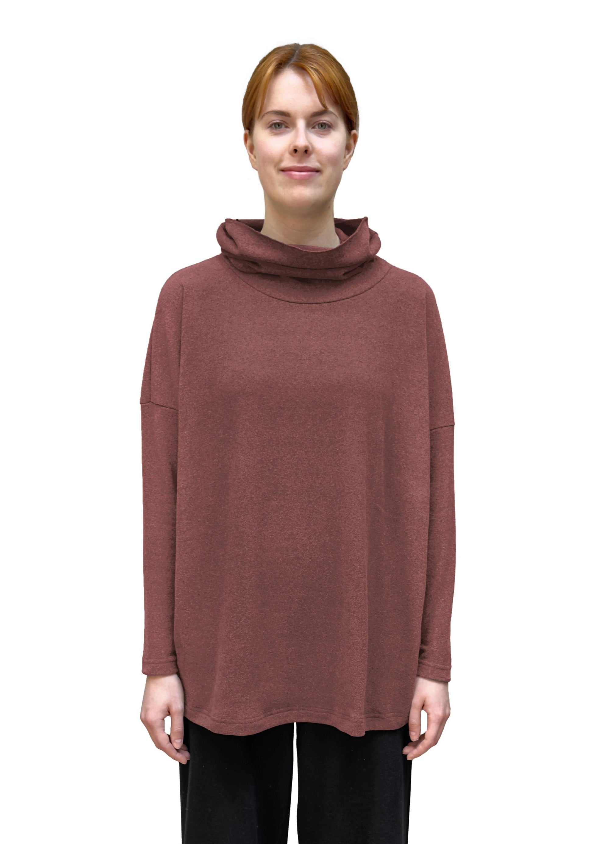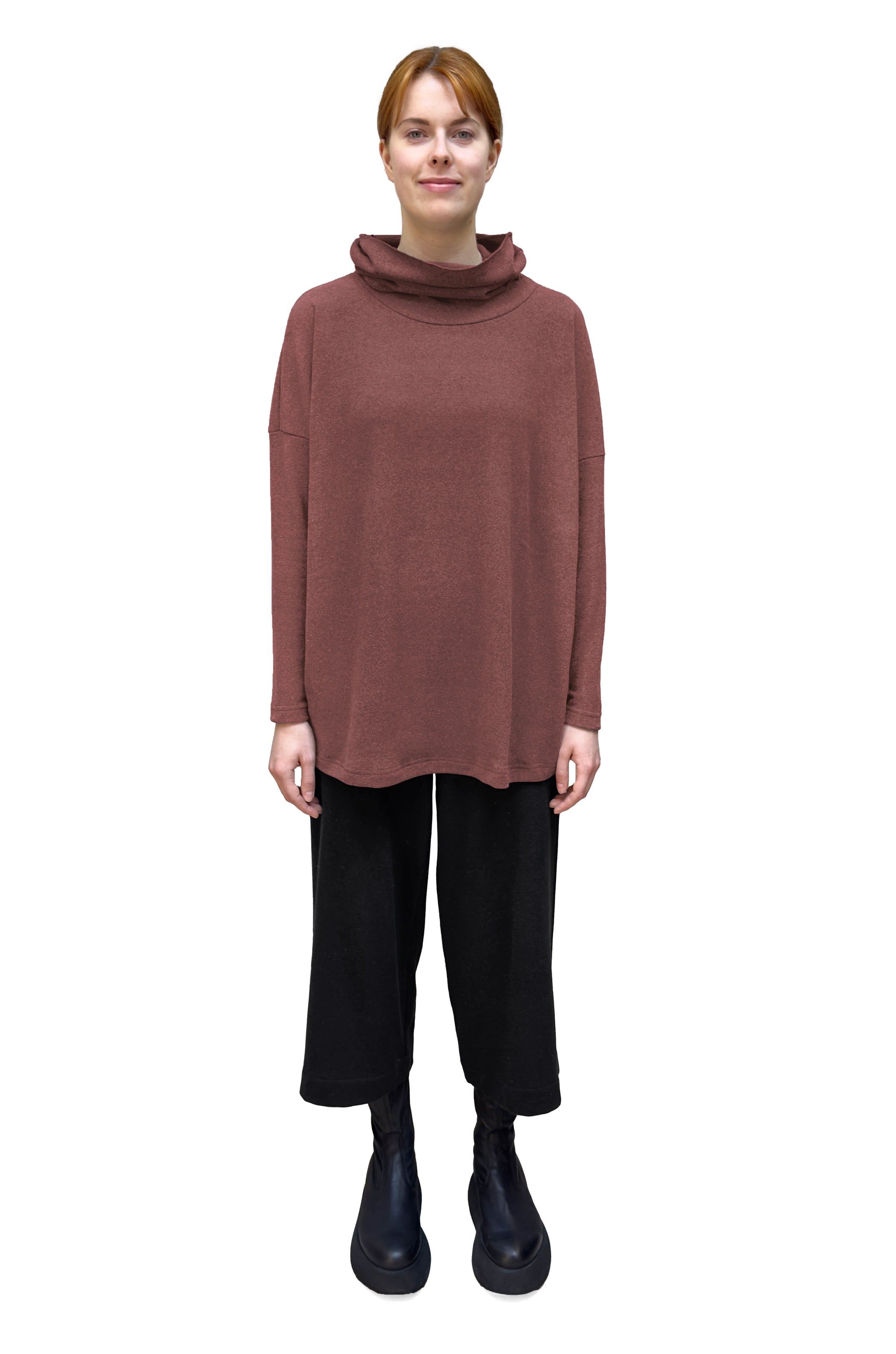 An oversized fit cowl sweater in Mama B's cozy knit fabric. It has dropped shoulders and fitted sleeves, with a long cowl neck. The slightly rounded hem falls mid thigh, making it tunic length.