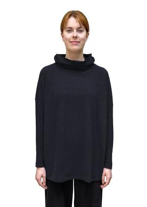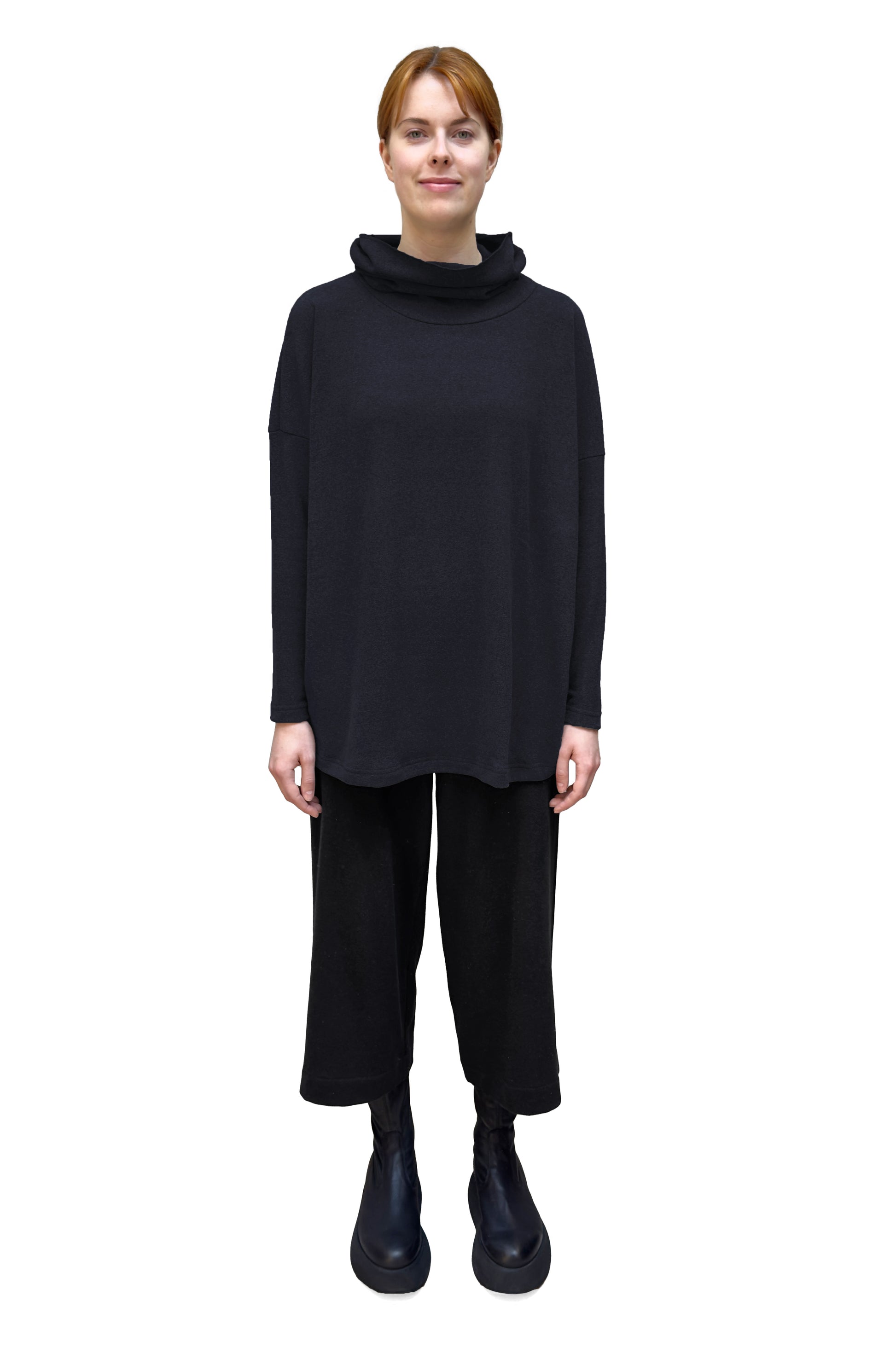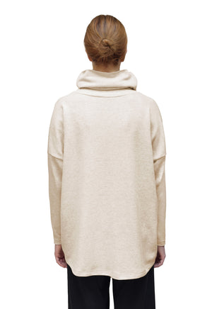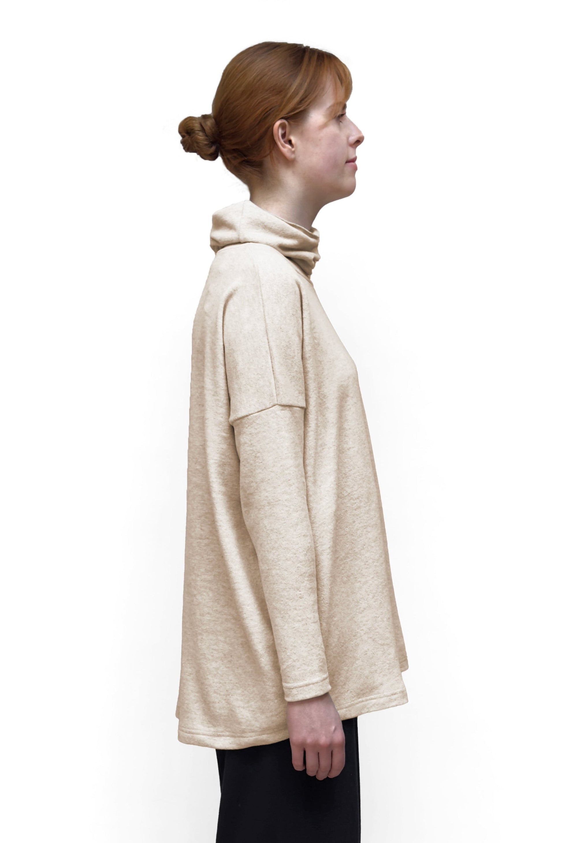An oversized fit cowl sweater in Mama B's cozy knit fabric. It has dropped shoulders and fitted sleeves, with a long cowl neck. The slightly rounded hem falls mid thigh, making it tunic length.