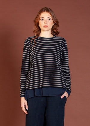 This is a relaxed fit, long sleeve pullover in Mama b’s cozy knit fabric. It features long sleeves, a medium striped pattern and a high round neck. It falls right at the hips.