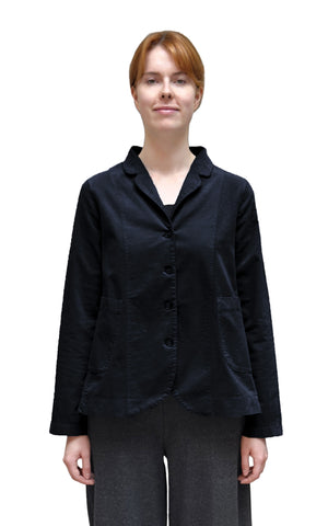 An amazing jacket crafted from a soft cotton velvet fabric featuring a relaxed A-line cut fitting closer at the bust and flaring out at the hips. It offers close fitting, long set-in sleeves and a front button closure. The small notched collar and patch pockets at the front complete the look.