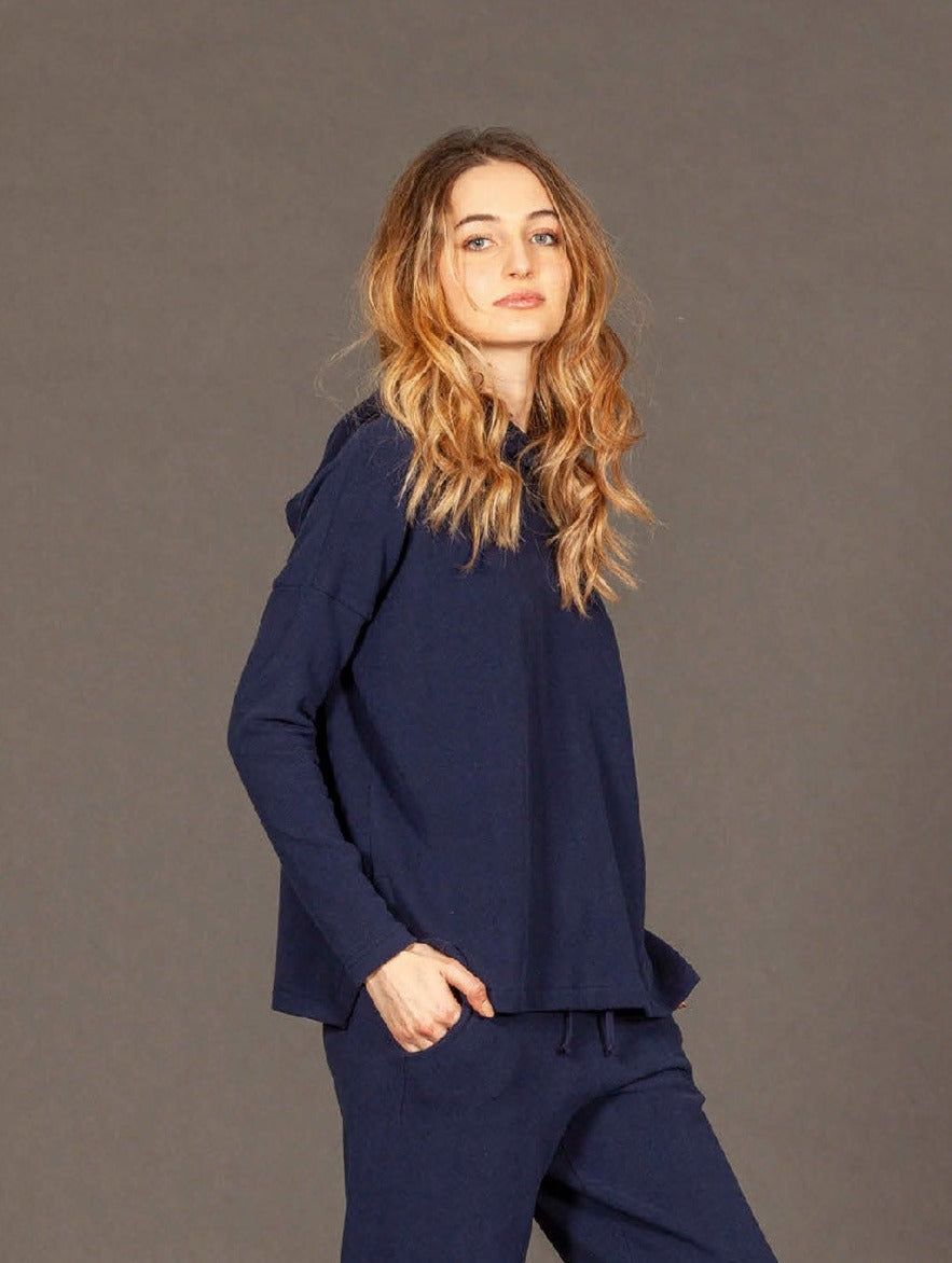 This is a relaxed fit, long sleeve hoodie in Mama b’s cozy knit fabric. This style has a hood and 6" slits on the sides for ease. It falls right at the hips.
