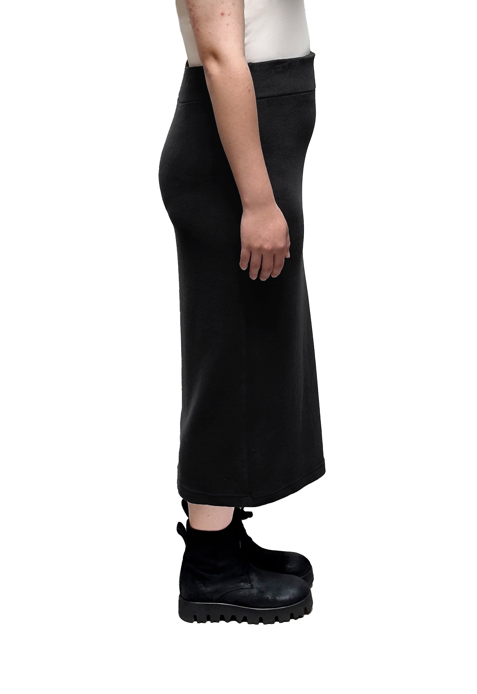 This is a classic pencil skirt in Mama B’s cozy knit fabric. It ends just below the calf.