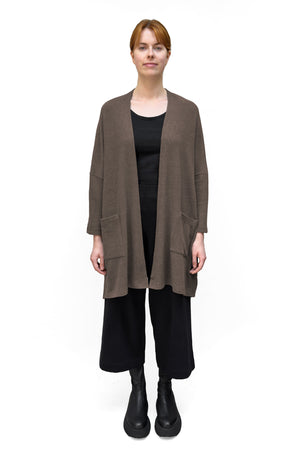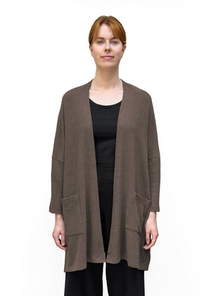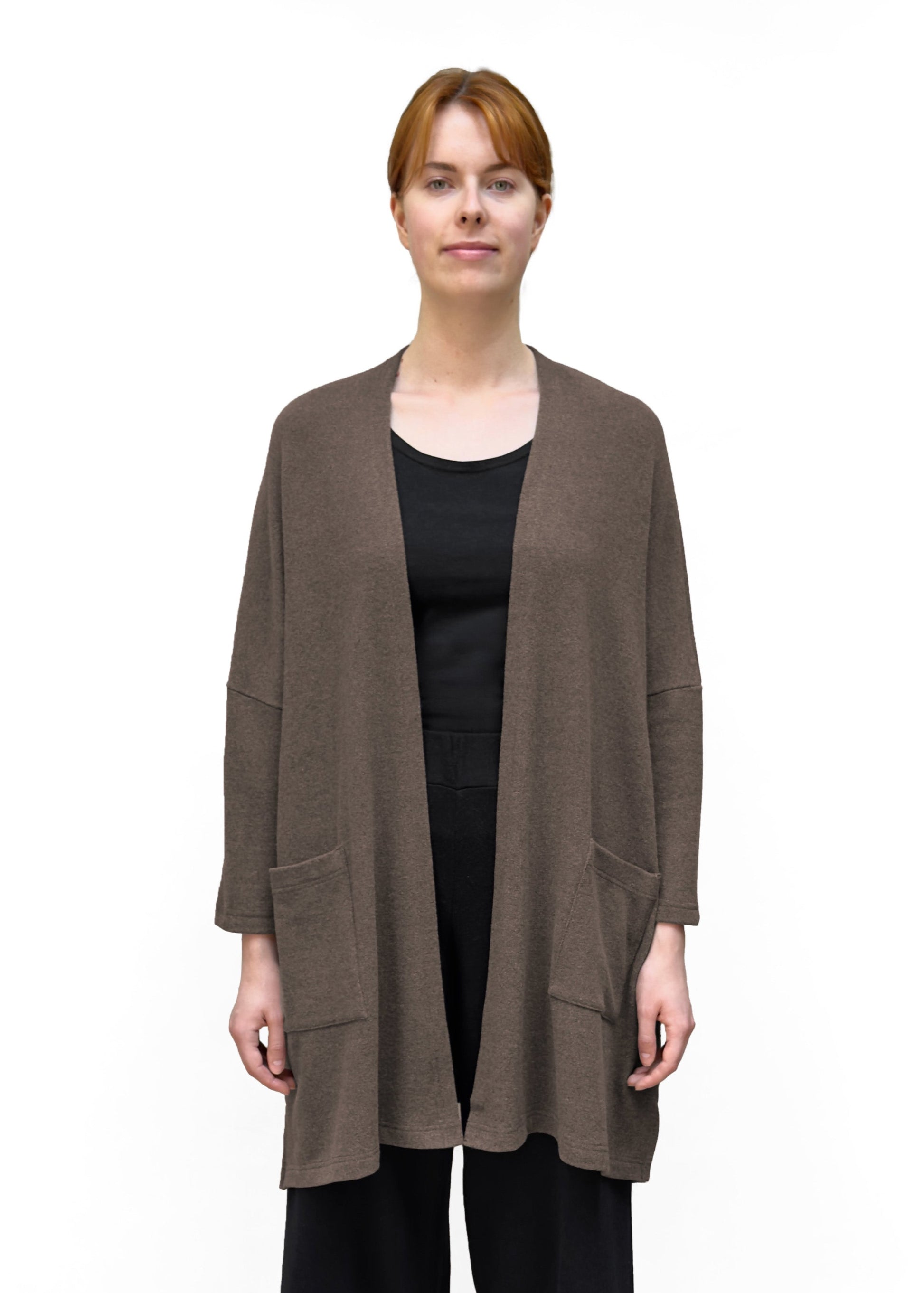 A long, open cardigan with long sleeves in Mama B's cozy knit fabric. It has a relaxed body and fitted sleeves that start at the elbow. This cardigan falls long, to mid-thigh and has two patch pockets in front.