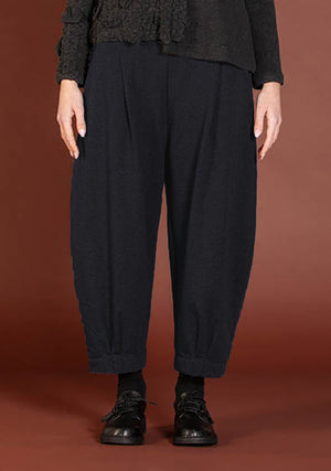 AA medium weight french terry cotton knit pant with an elastic waistband and 2 tucks in front giving room in the hips. The leg is rounded and tapers where it finishes at the ankle. There are pockets at the sides and has a fleece interior for warmth.