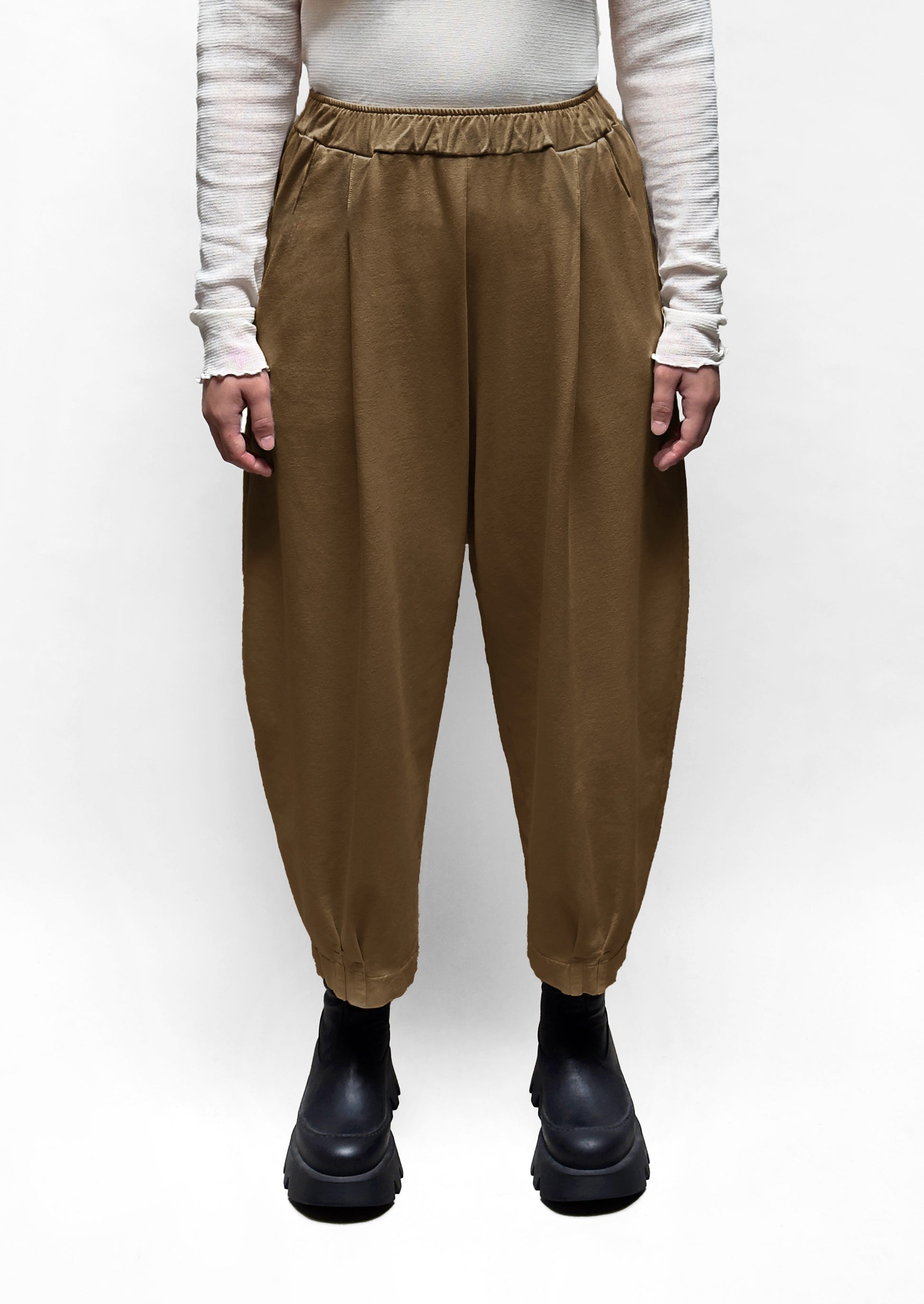A medium weight french terry cotton knit pant with an elastic waistband and 2 tucks in front giving room in the hips. The leg is rounded and tapers where it finishes at the ankle. There are pockets at the sides.
