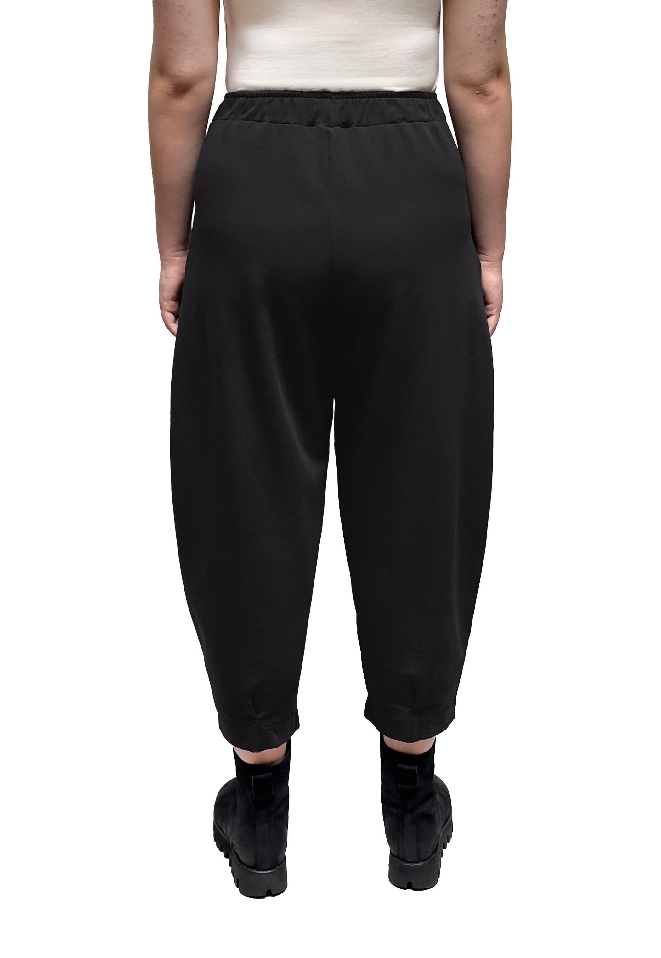 A medium weight french terry cotton knit pant with an elastic waistband and 2 tucks in front giving room in the hips. The leg is rounded and tapers where it finishes at the ankle. There are pockets at the sides and has a fleece interior for warmth.
