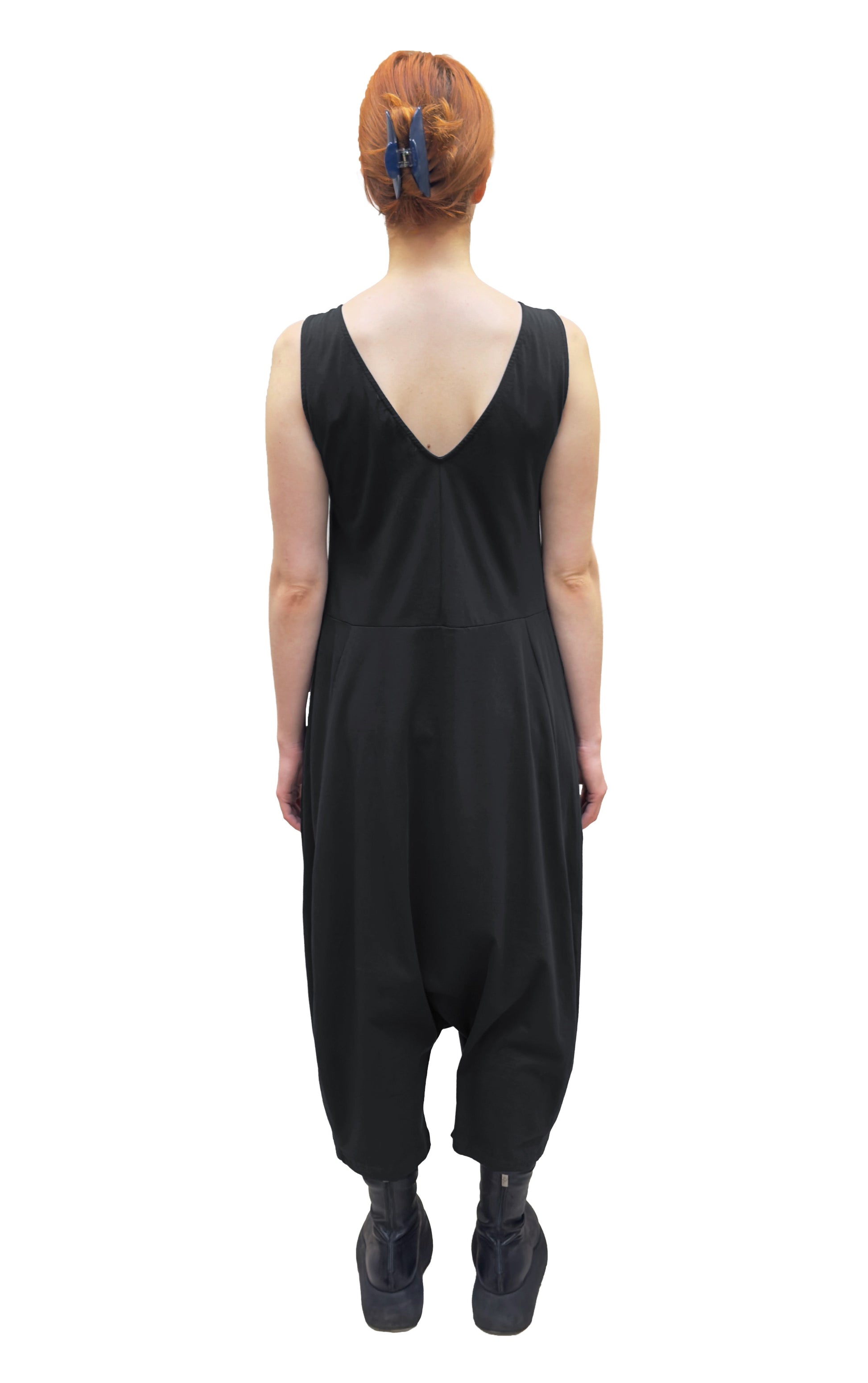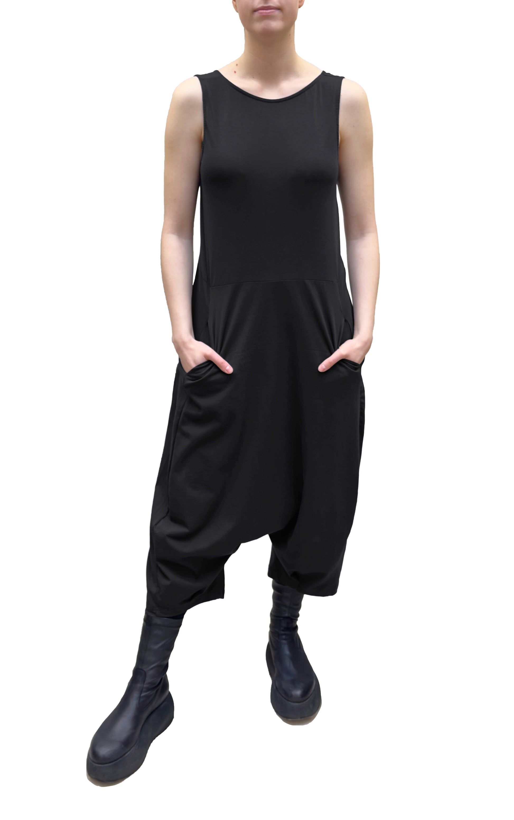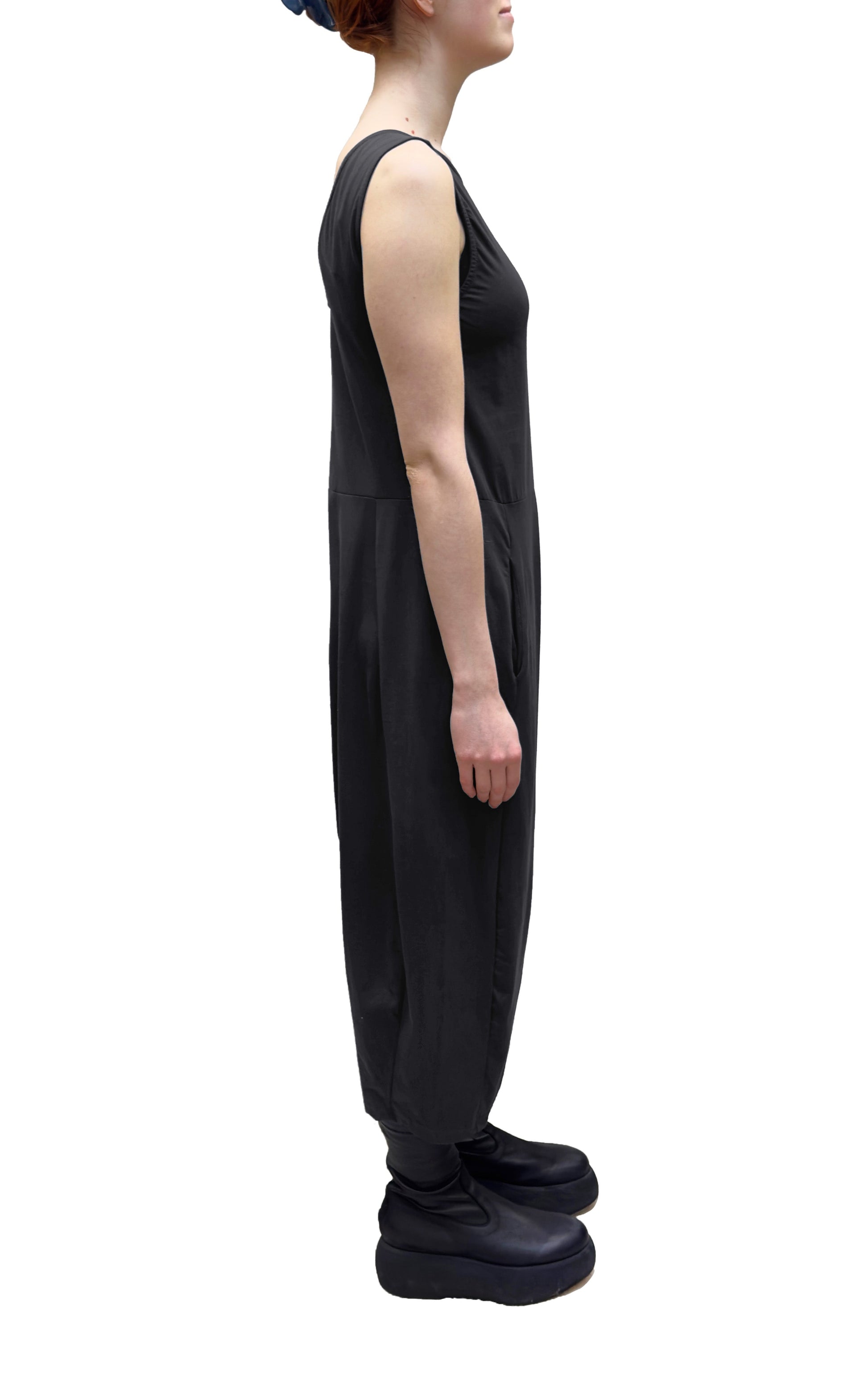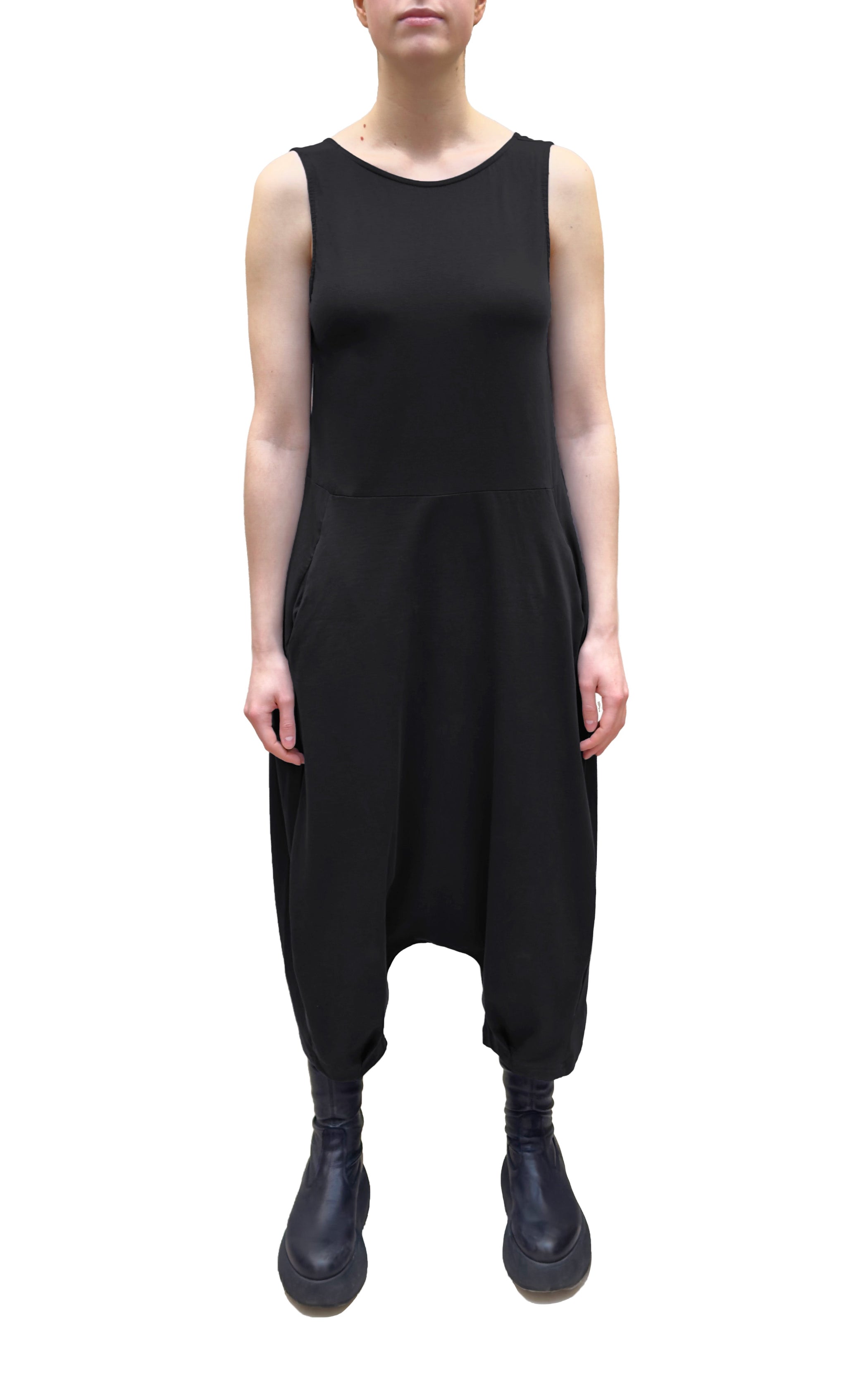This is Mama B's classic sleeveless jumpsuit, crafted from a cotton jersey knit with stretch. It features a round front neck, a V-neck at the back and side seam pockets. This jumpsuit has a dropped rise with a bubble shape through the body and the leg draws in at the hem.