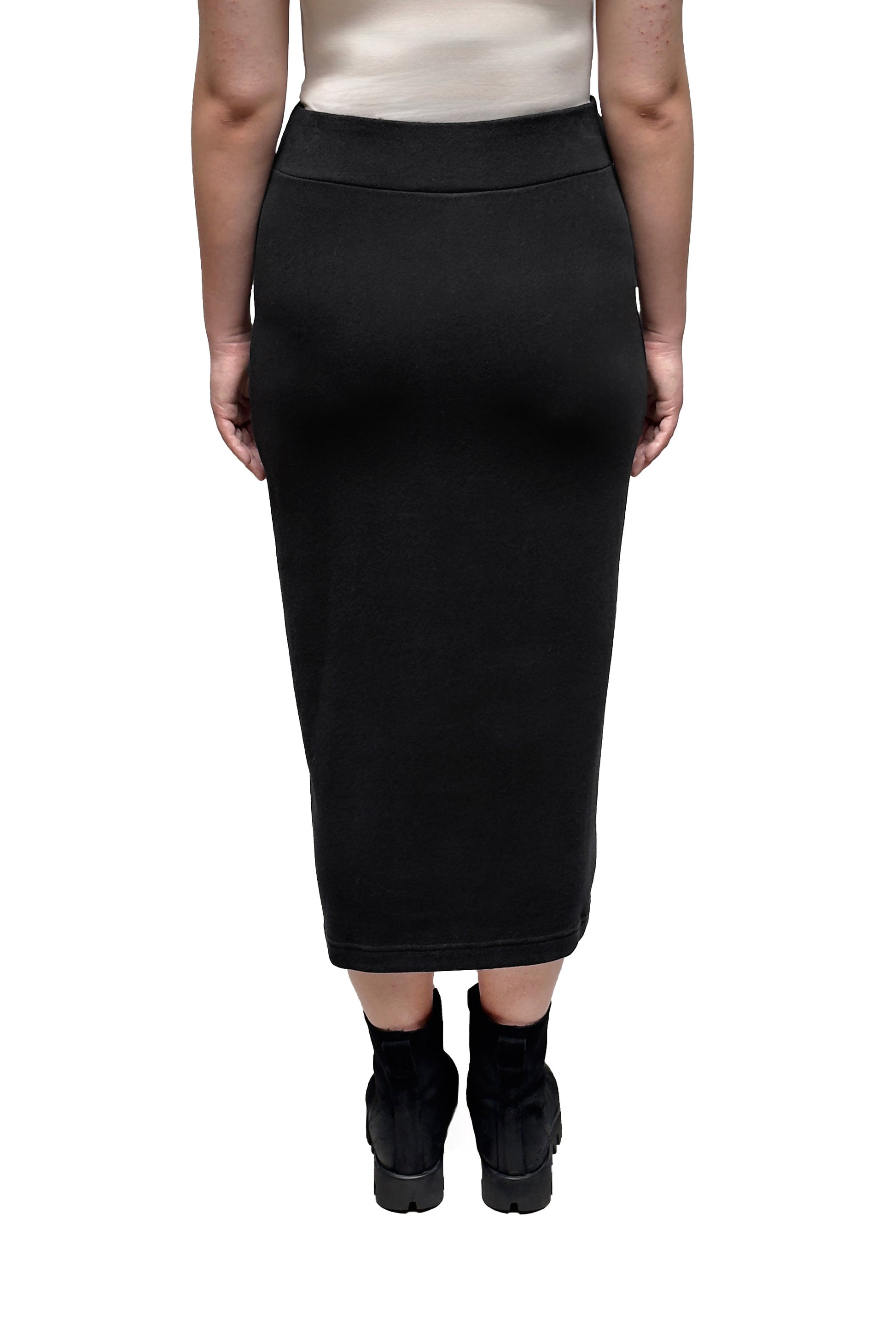 This is a classic pencil skirt in Mama B’s cozy knit fabric. It ends just below the calf.