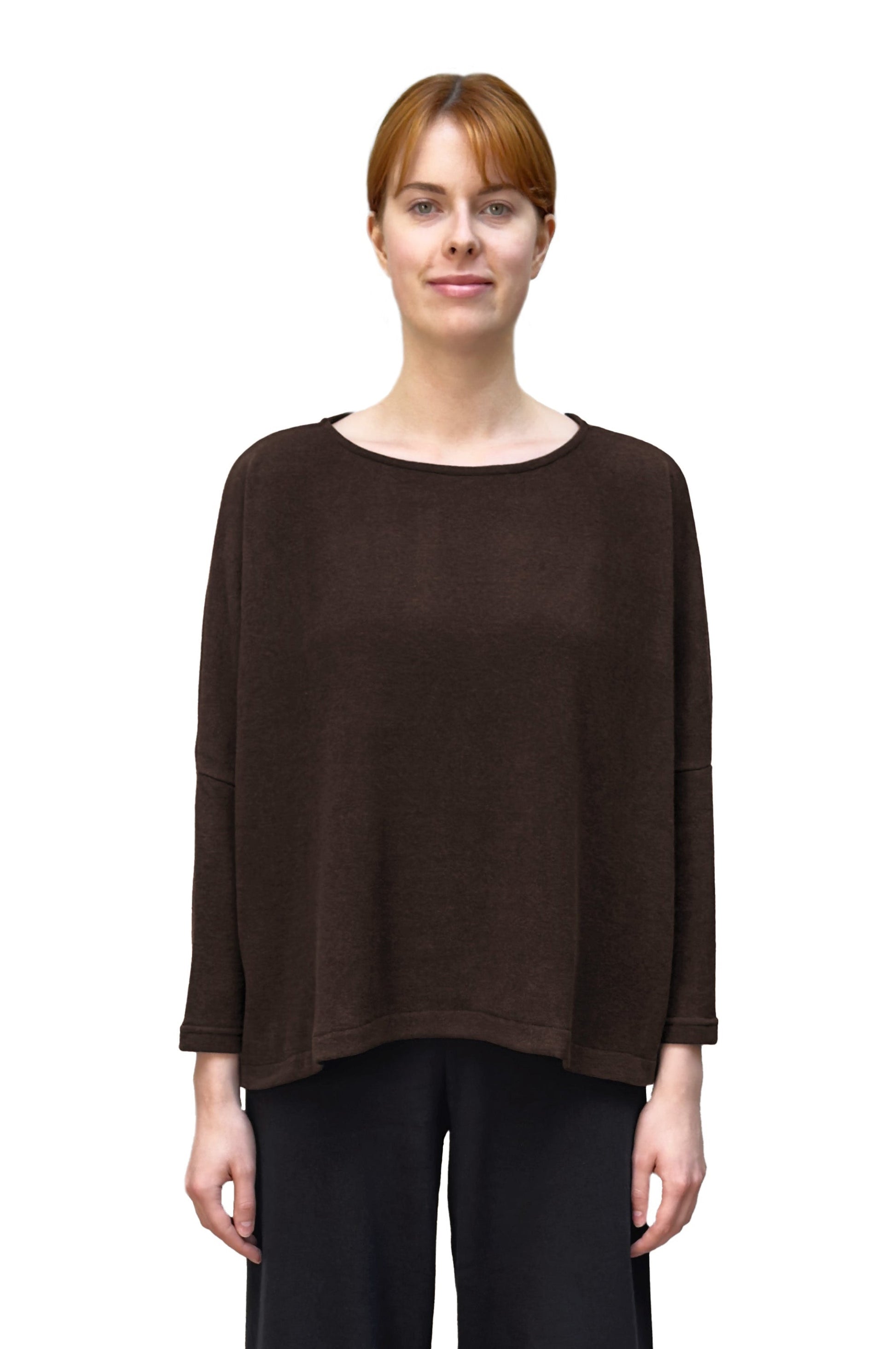 This boxy top features Mama B's cozy knit fabric. It has dropped shoulders and long sleeves that are fitted below the elbow. It features 4" side slits and a high boatneck for a flattering and comfortable look.