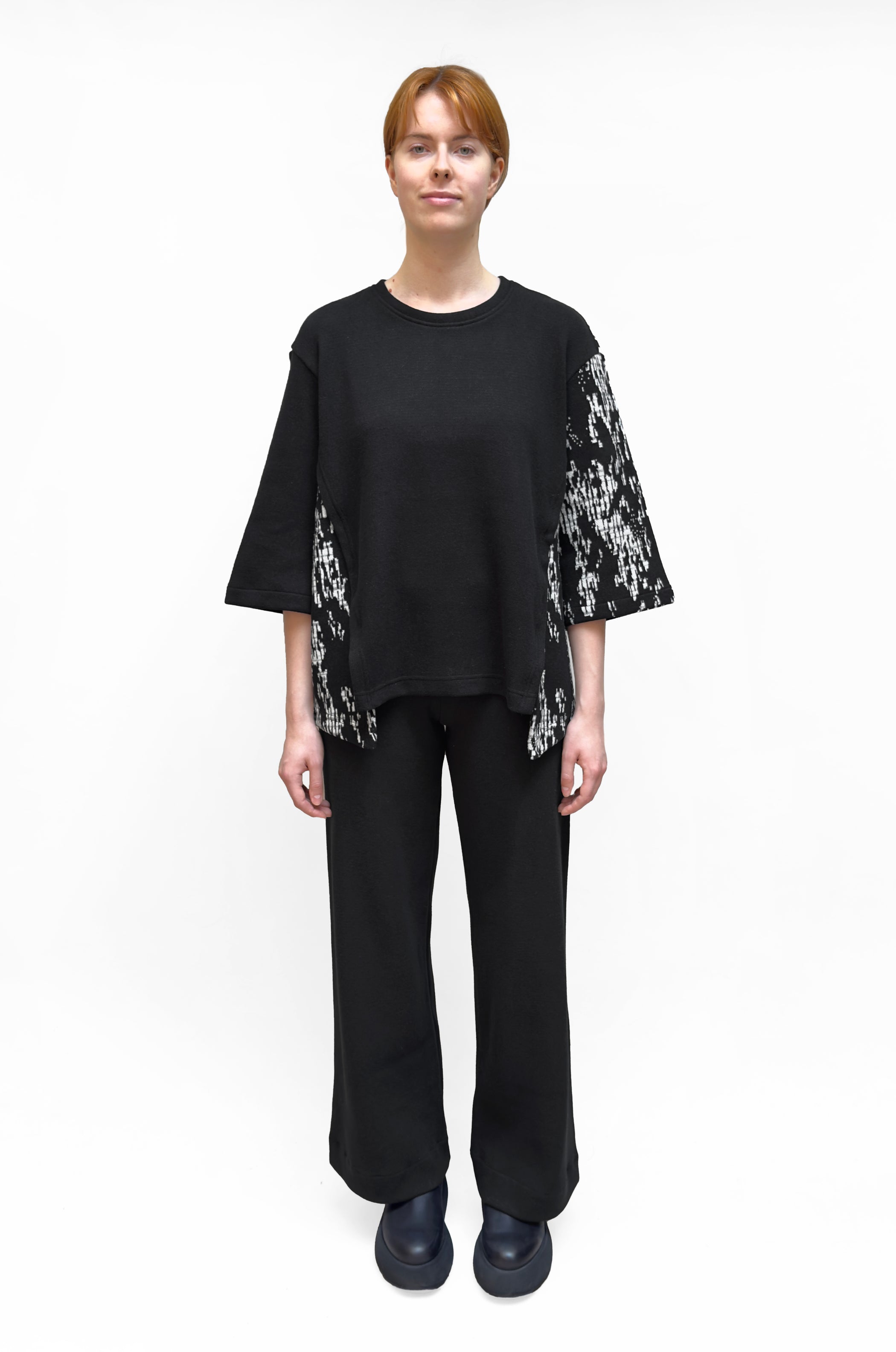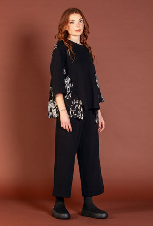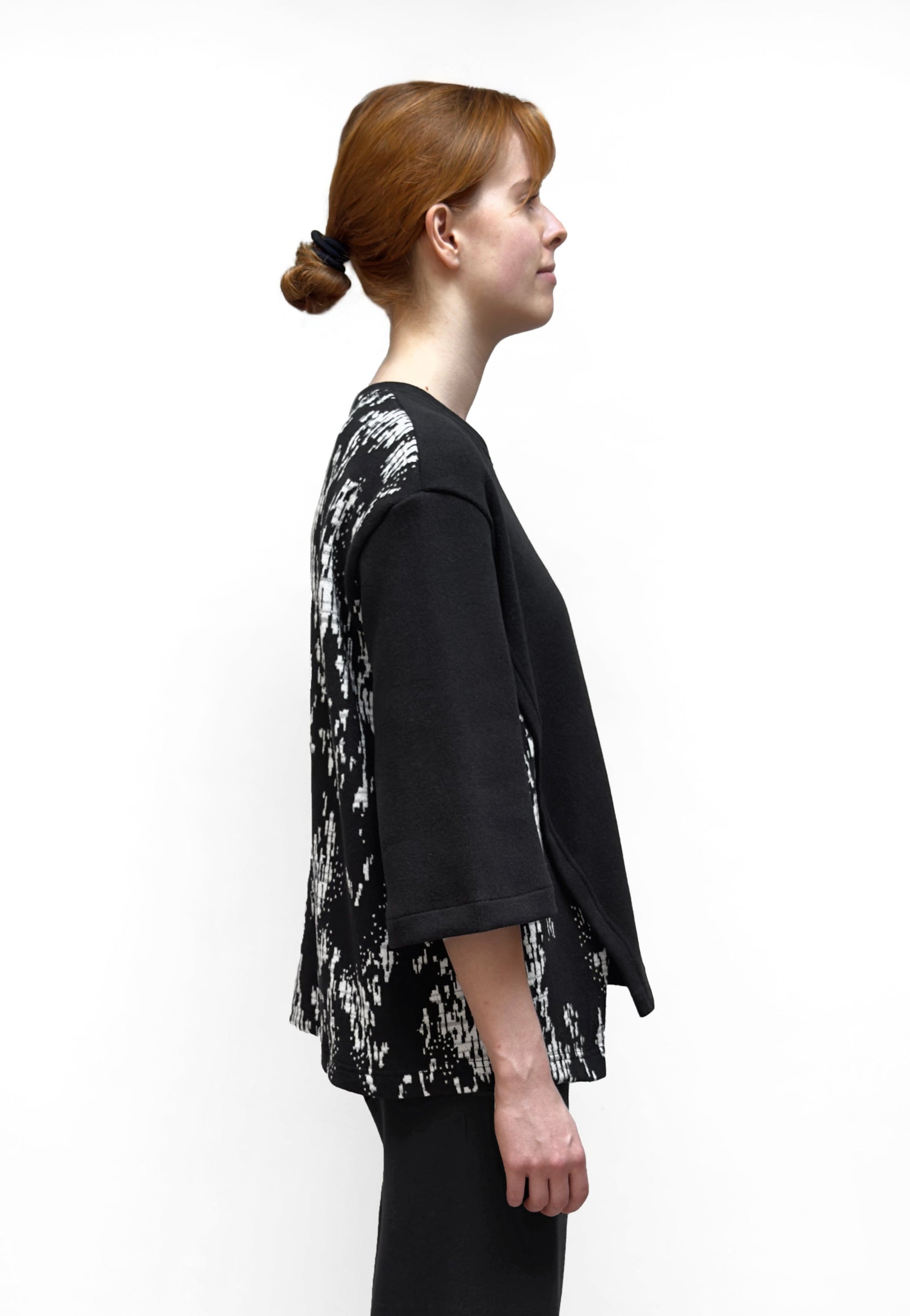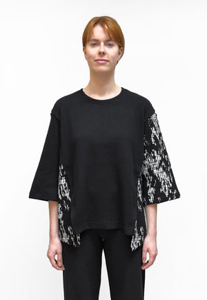 A heavy weight A-line top in a cotton blend soft fabric. This top features a round neck and a 3/4 length sleeve. The top falls above the hip with an uneven hemline. There is a solid panel in the centre of the top and printed panels on the side, sleeve and back.