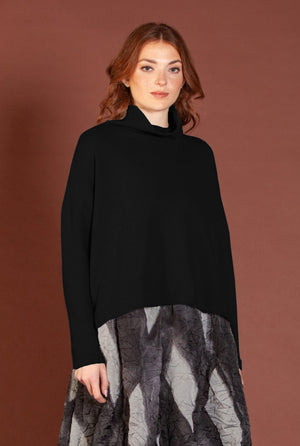 A boxy, long sleeve top in Mama b’s cozy knit fabric. This top has a relaxed turtleneck, fitted sleeves and 2” difference between the front and back hem giving the top a hi low style.