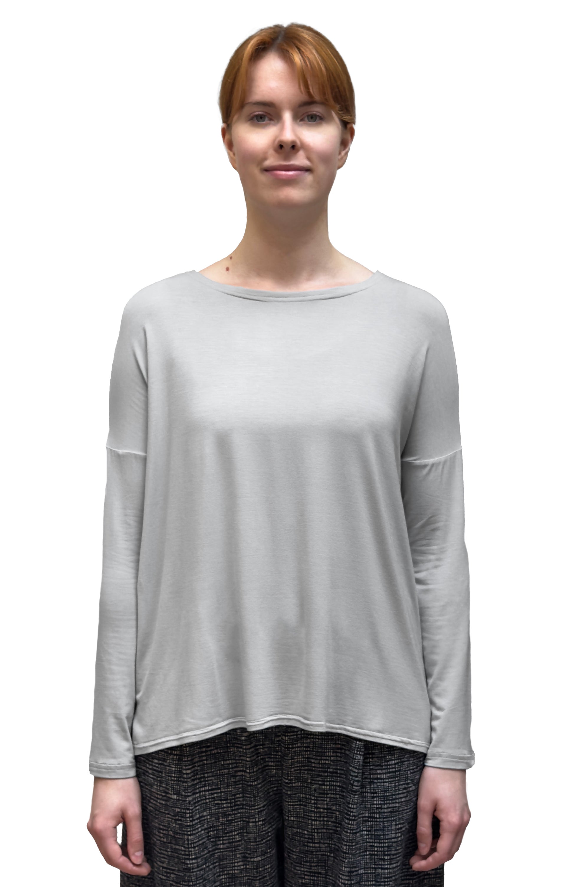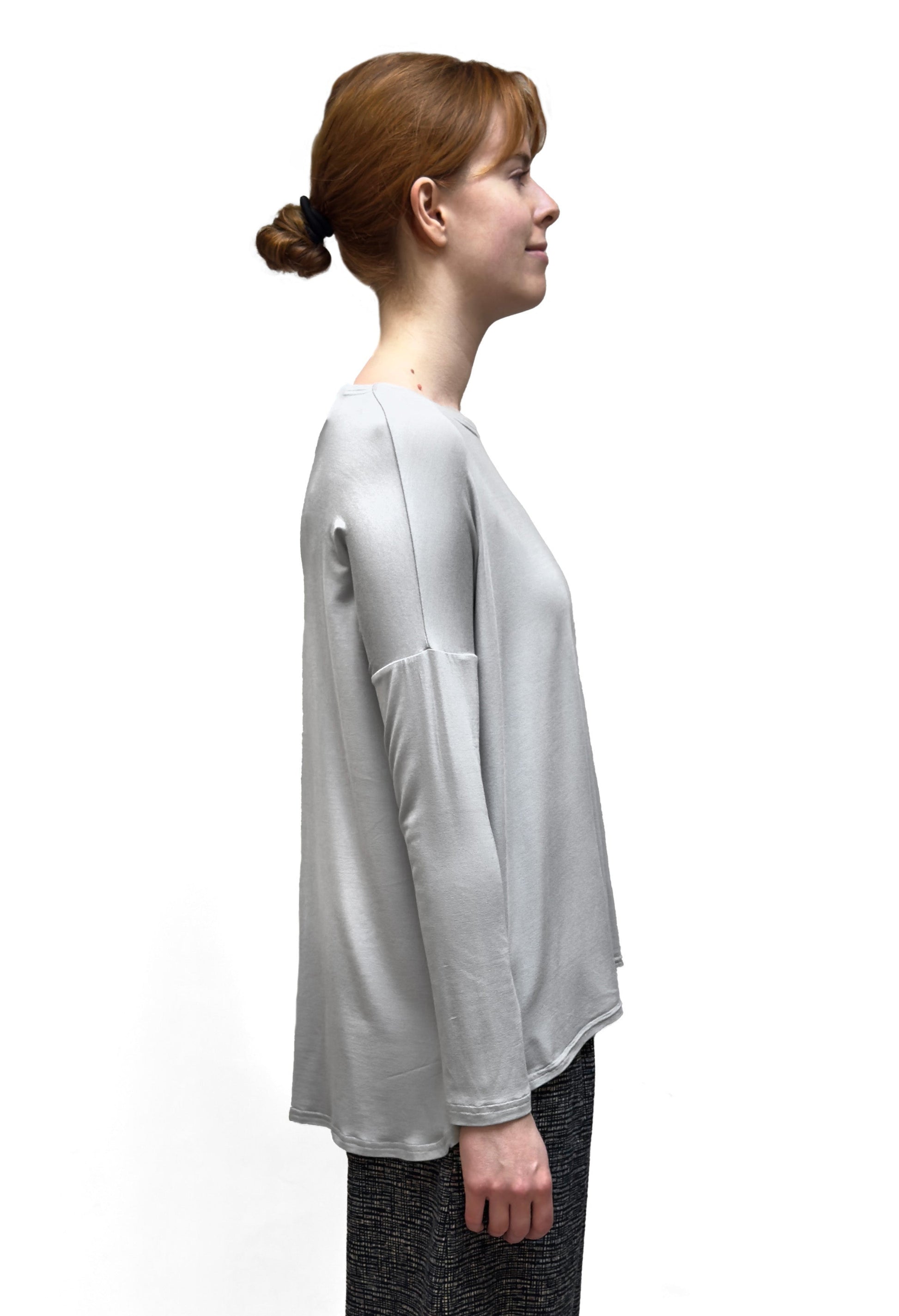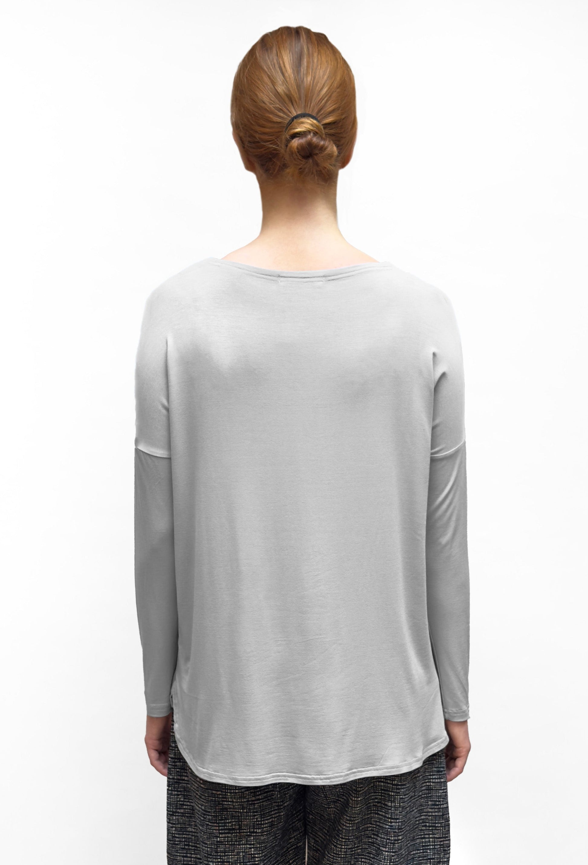 A relaxed top in a soft and light knit jersey with dropped full length sleeves. This top has a round neckline, with a slight A-line silhouette. The back hangs longer than the front creating a hi-low style.