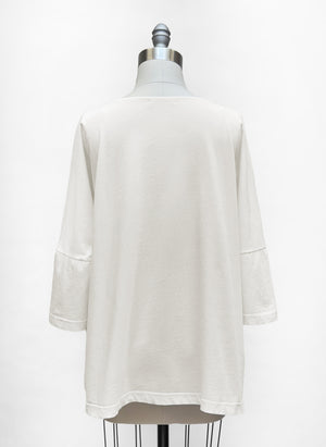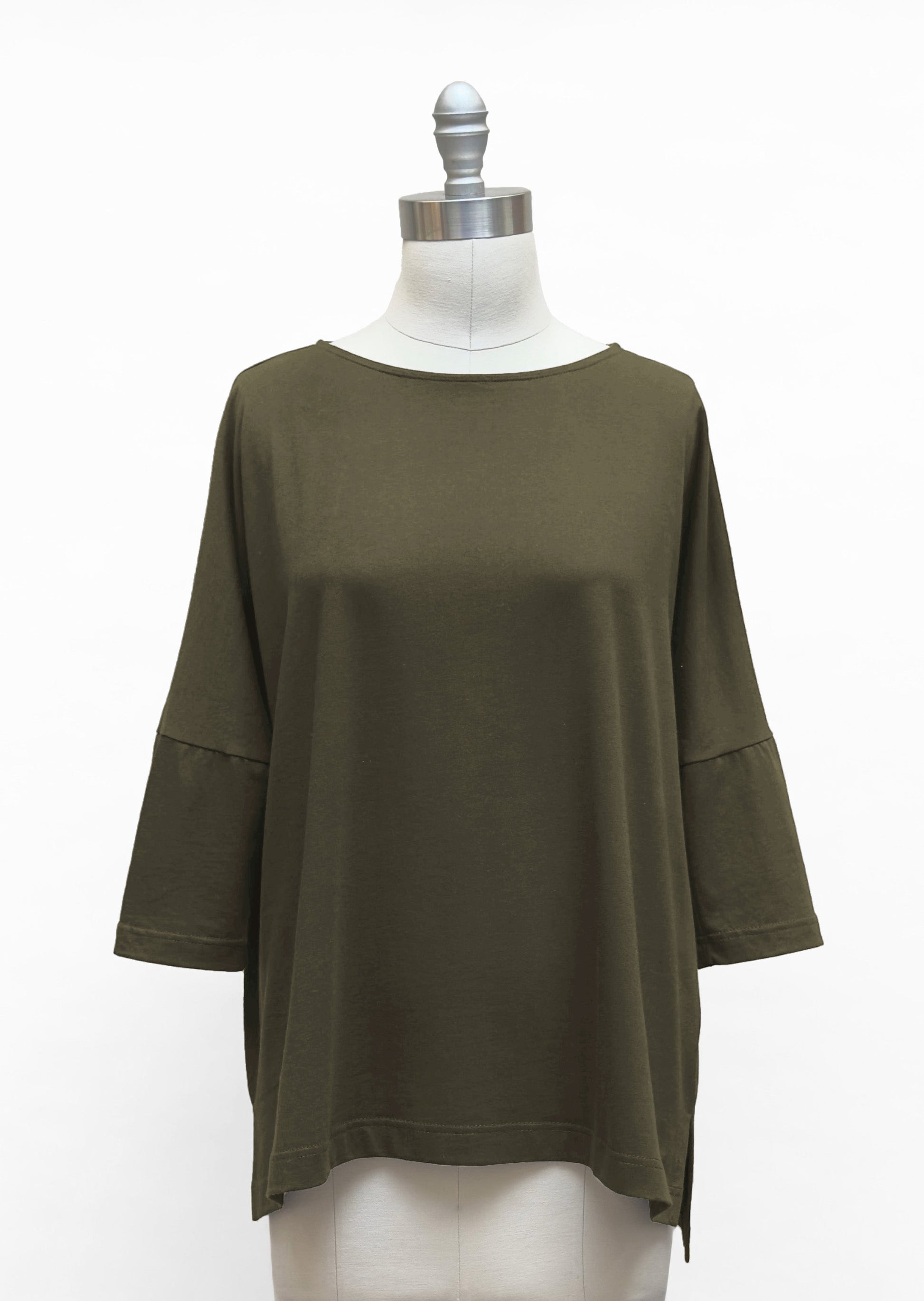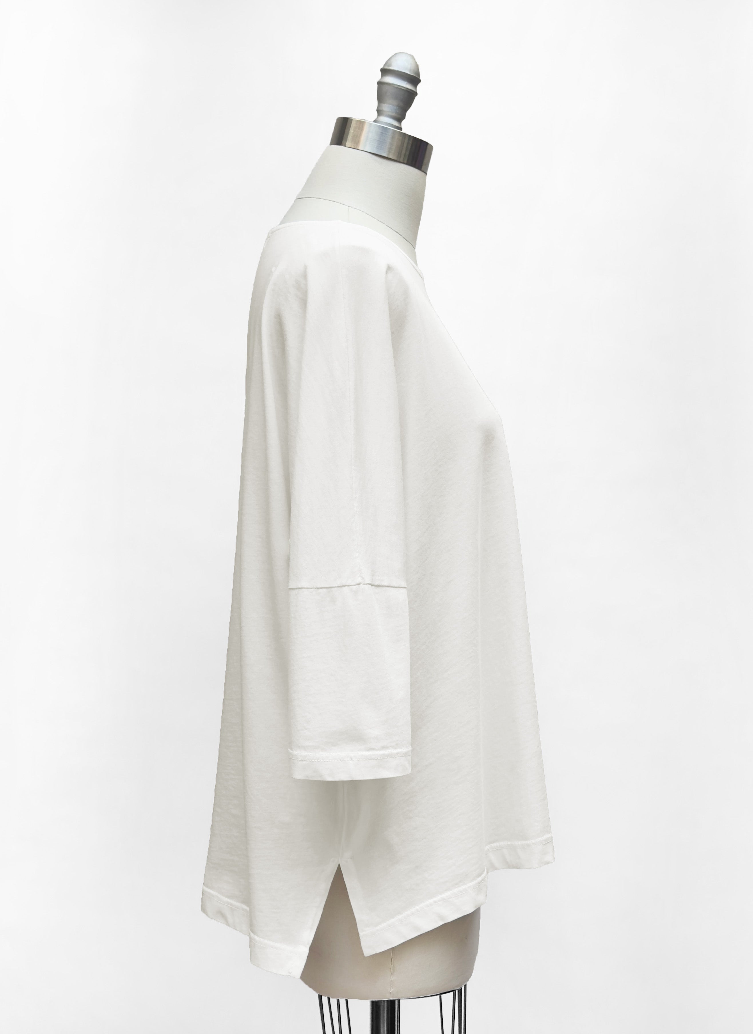 A boxy top crafted from a soft and light cotton knit, featuring dropped shoulders and 3/4 length sleeves. This top falls slightly longer at the back and features a boatneck.