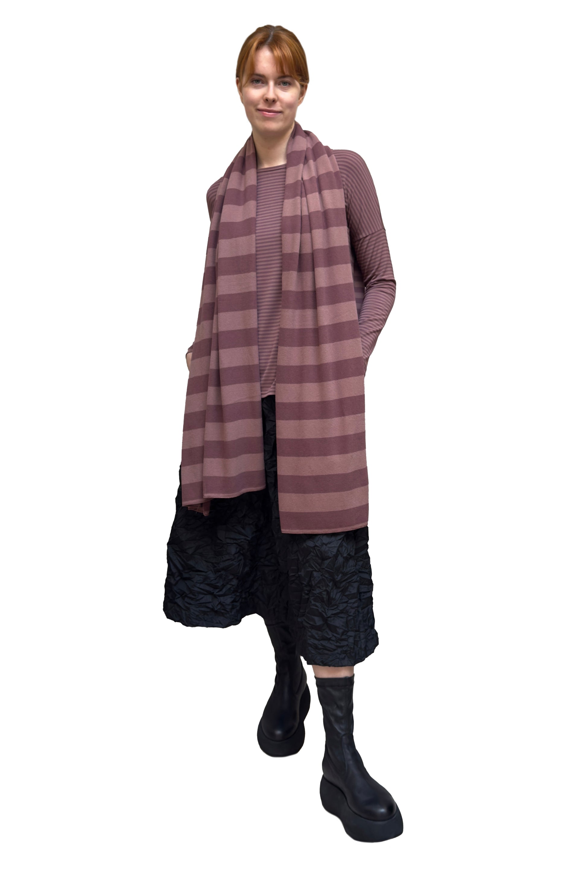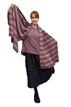 Oversized, long scarf. Features a lovely pattern of medium stripes. Made from Mama B's cozy knit fabric.