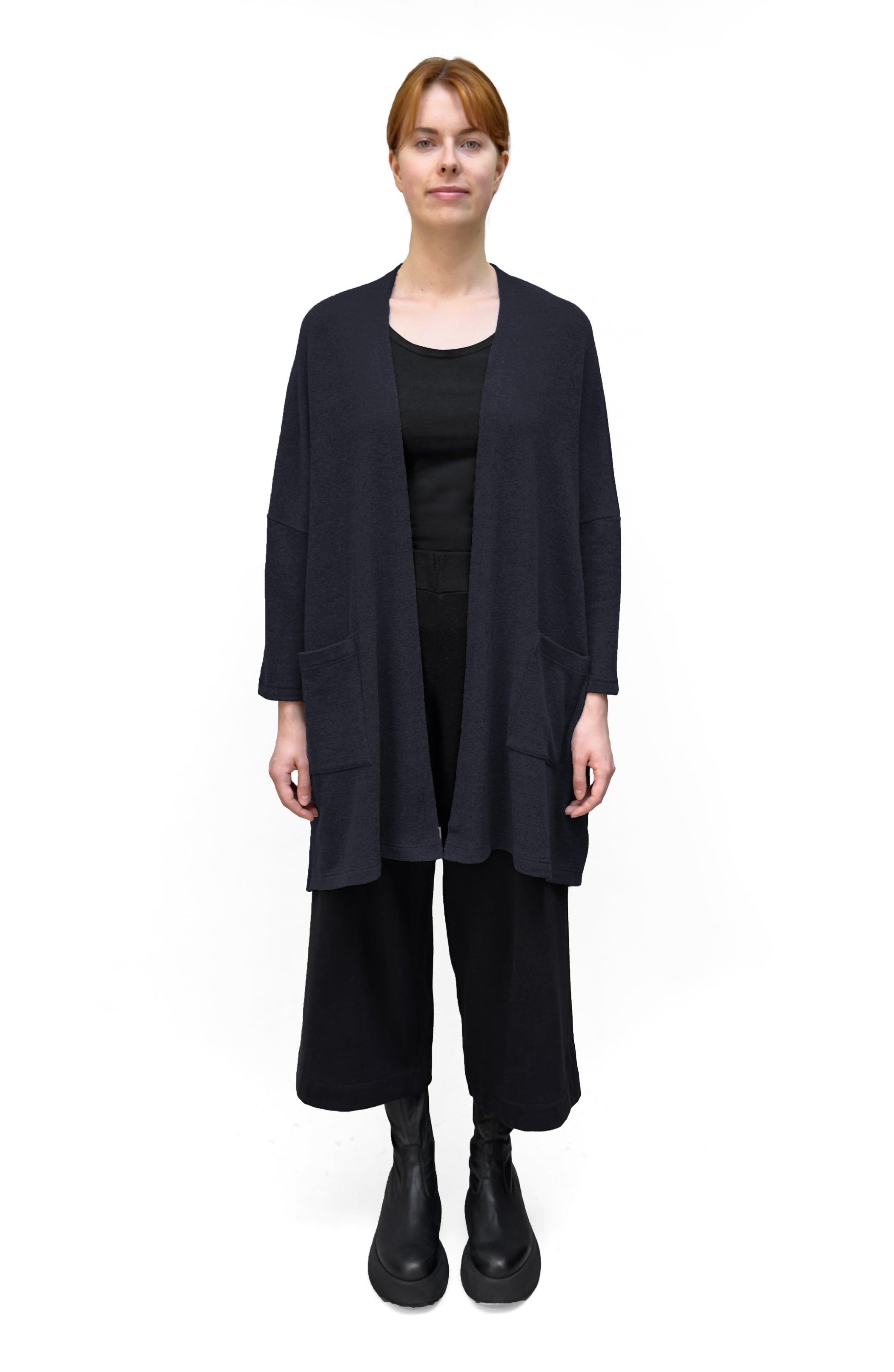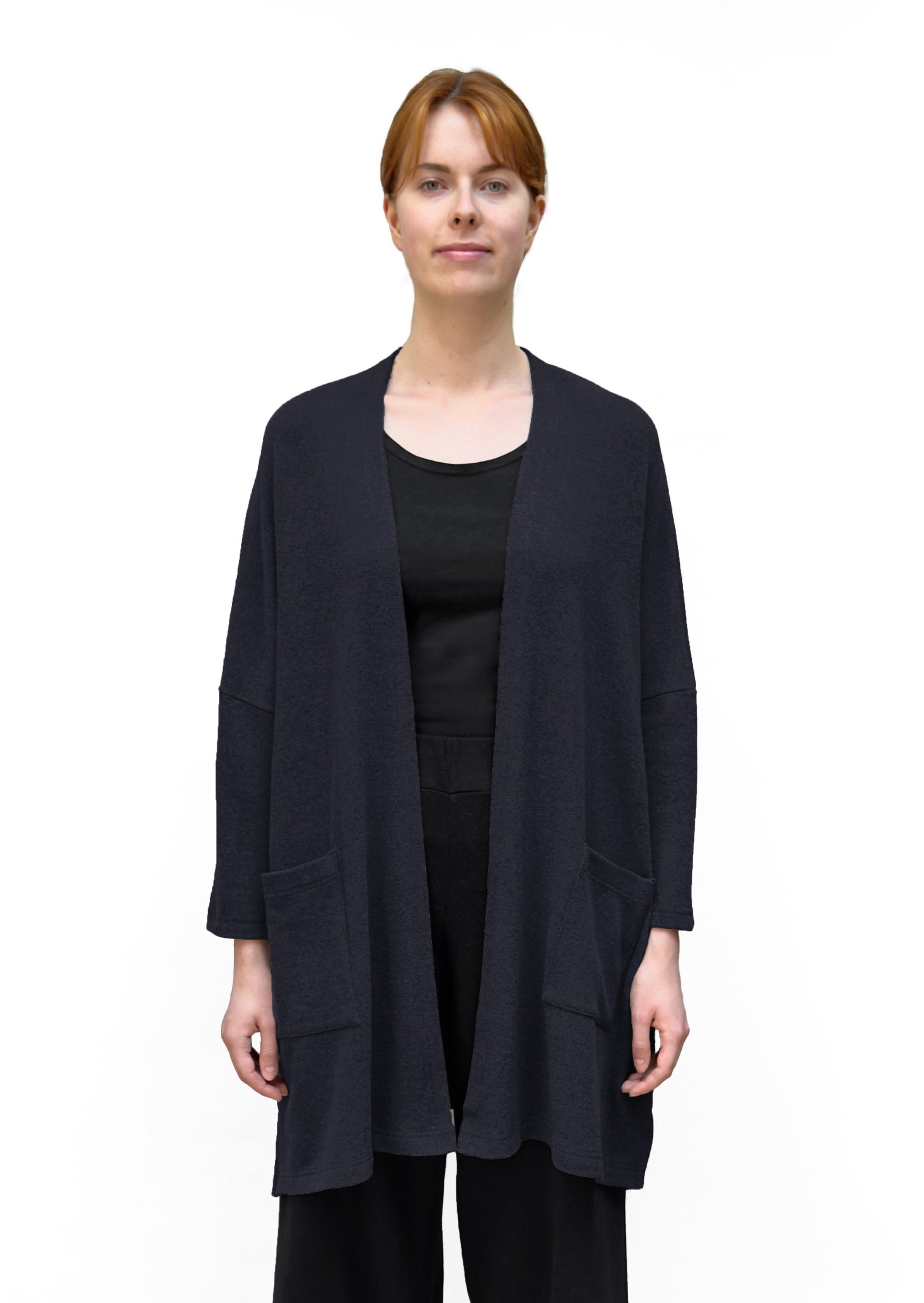 A long, open cardigan with long sleeves in Mama B's cozy knit fabric. It has a relaxed body and fitted sleeves that start at the elbow. This cardigan falls long, to mid-thigh and has two patch pockets in front.