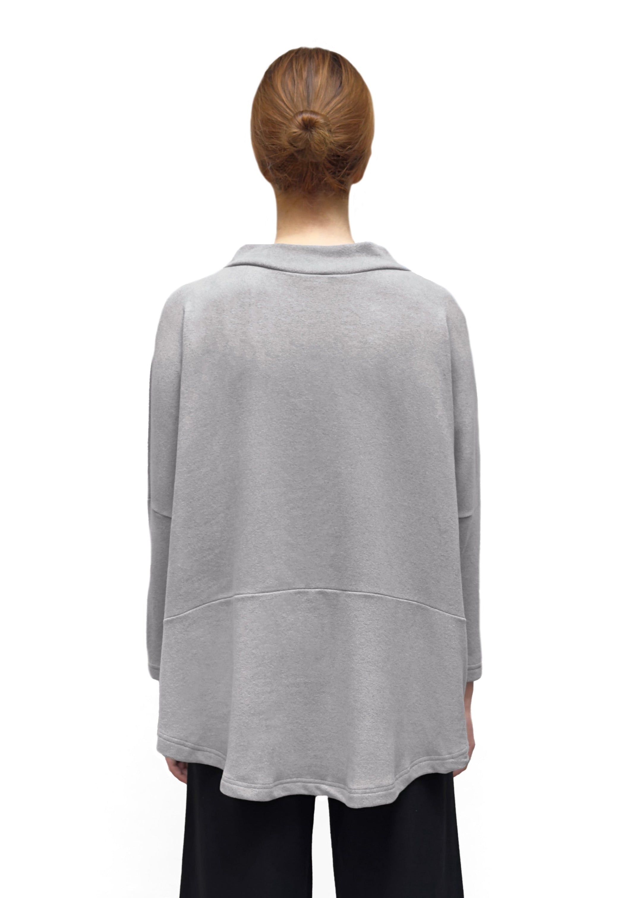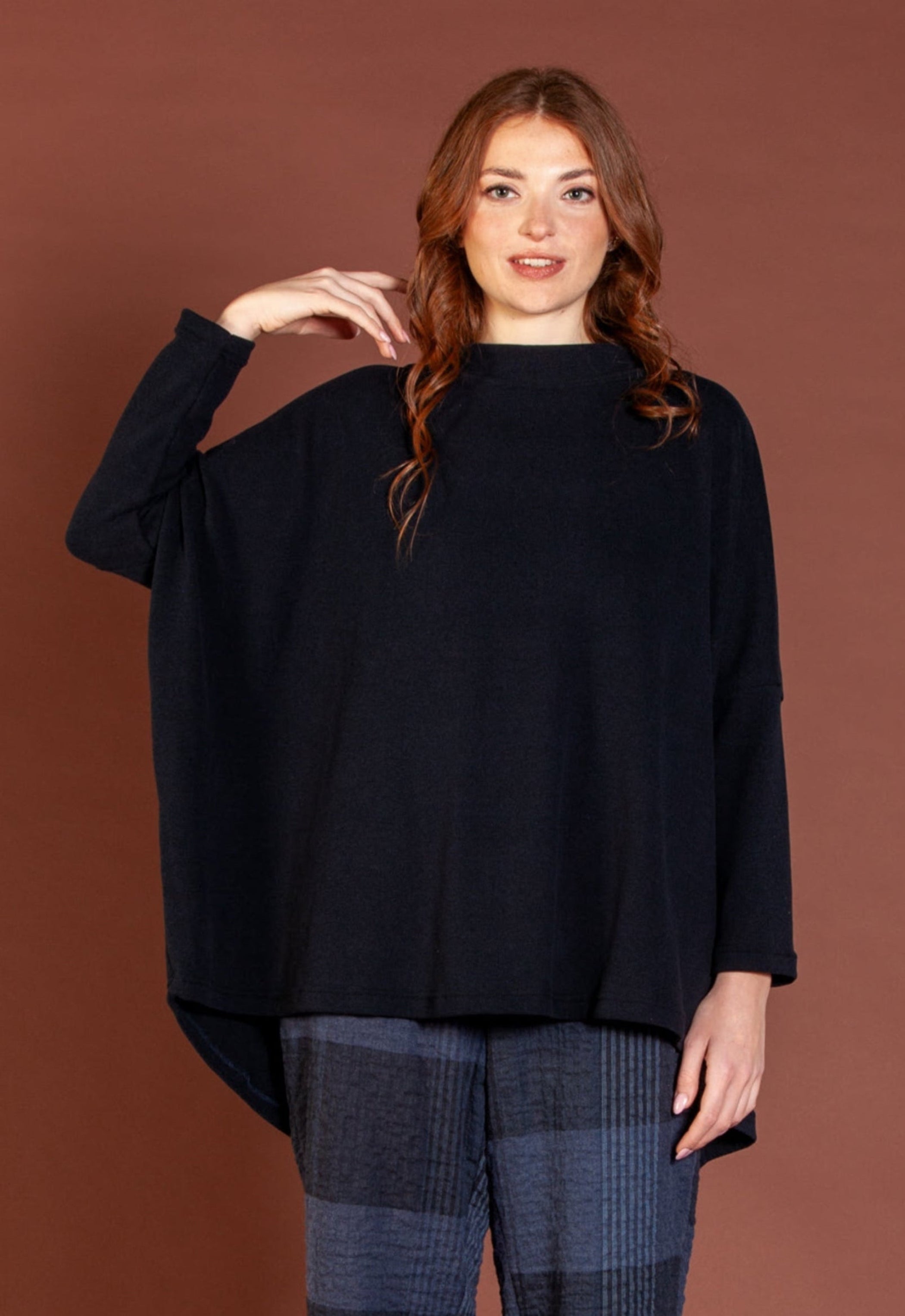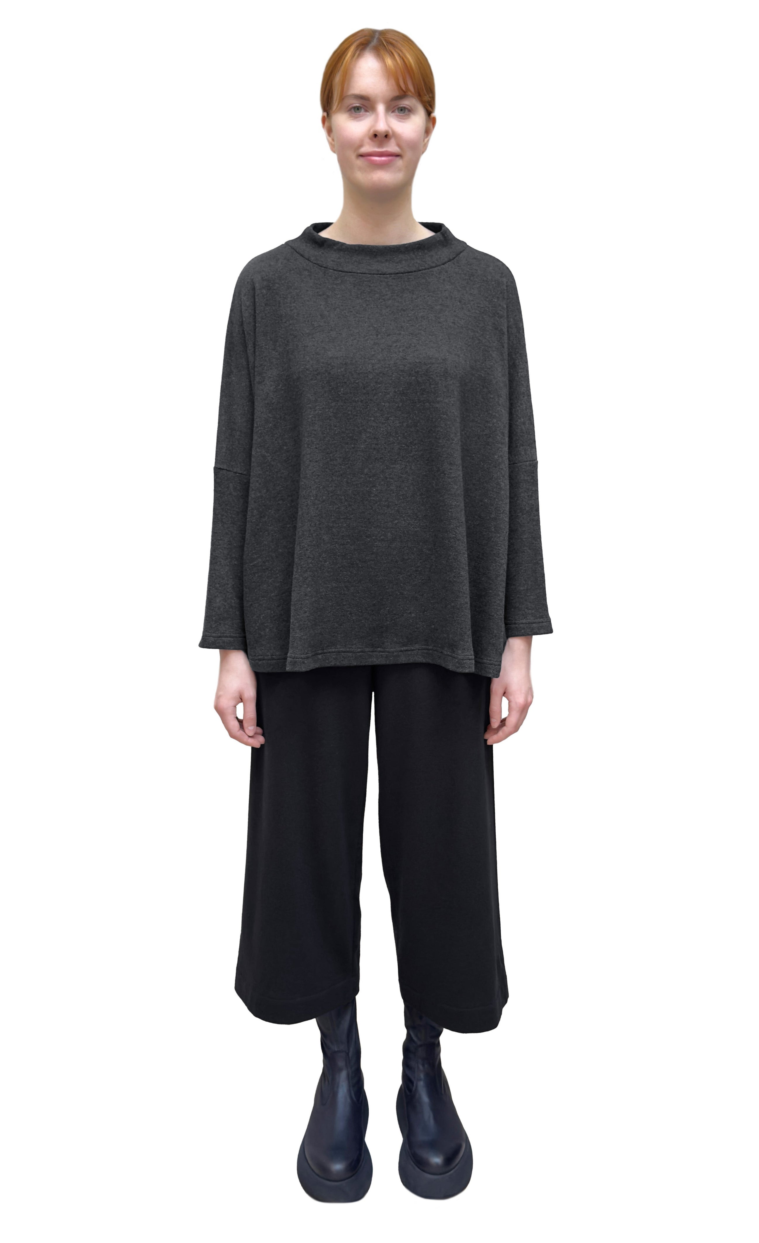 A relaxed and boxy pullover in Mama B's cozy knit fabric. This top has a wide and relaxed mock neck and dropped shoulders with 3/4 sleeves that are slightly fitted. It features a yoke seam at the lower back. The front falls 5" shorter than the back which has a rounded hem that dips down at the centre.