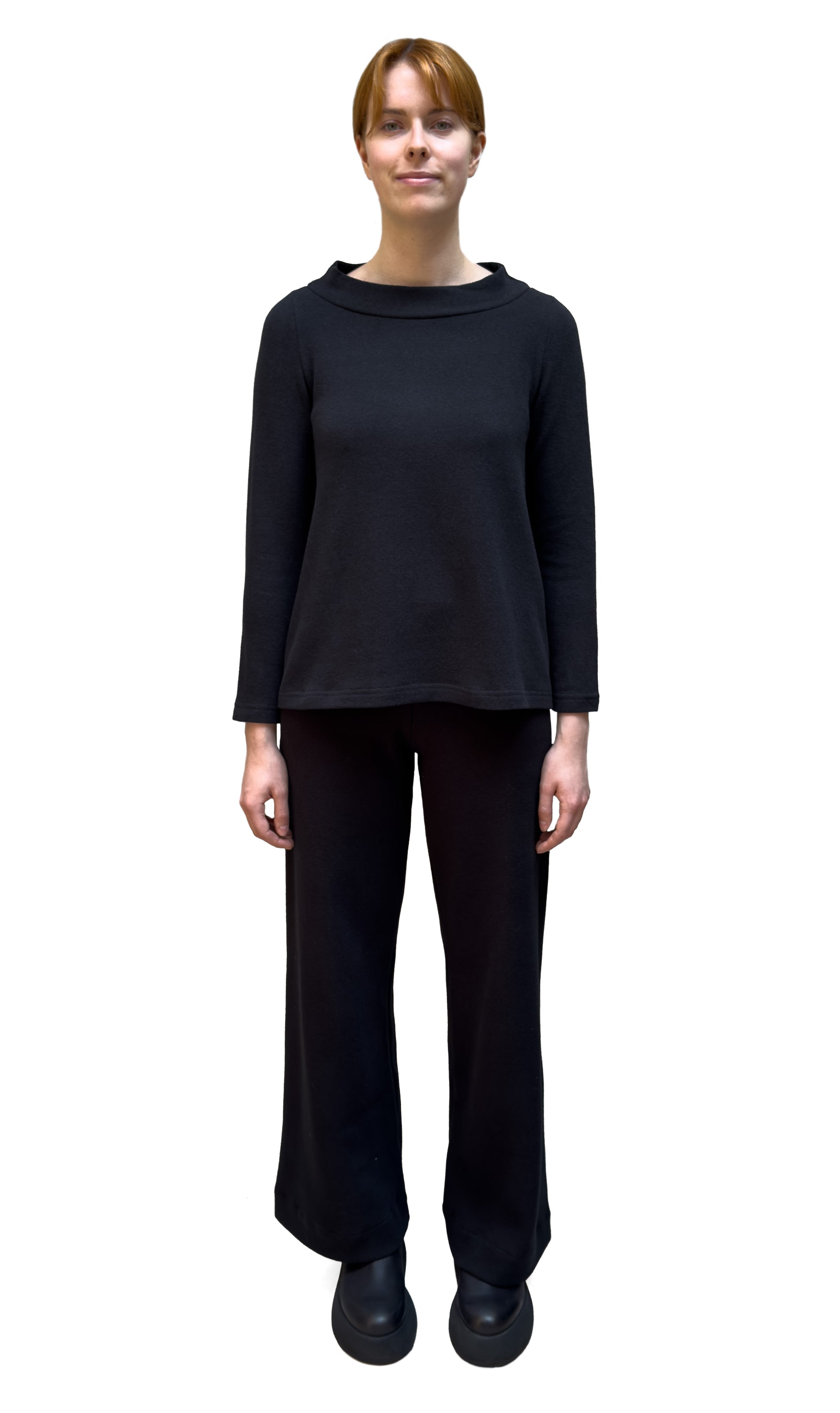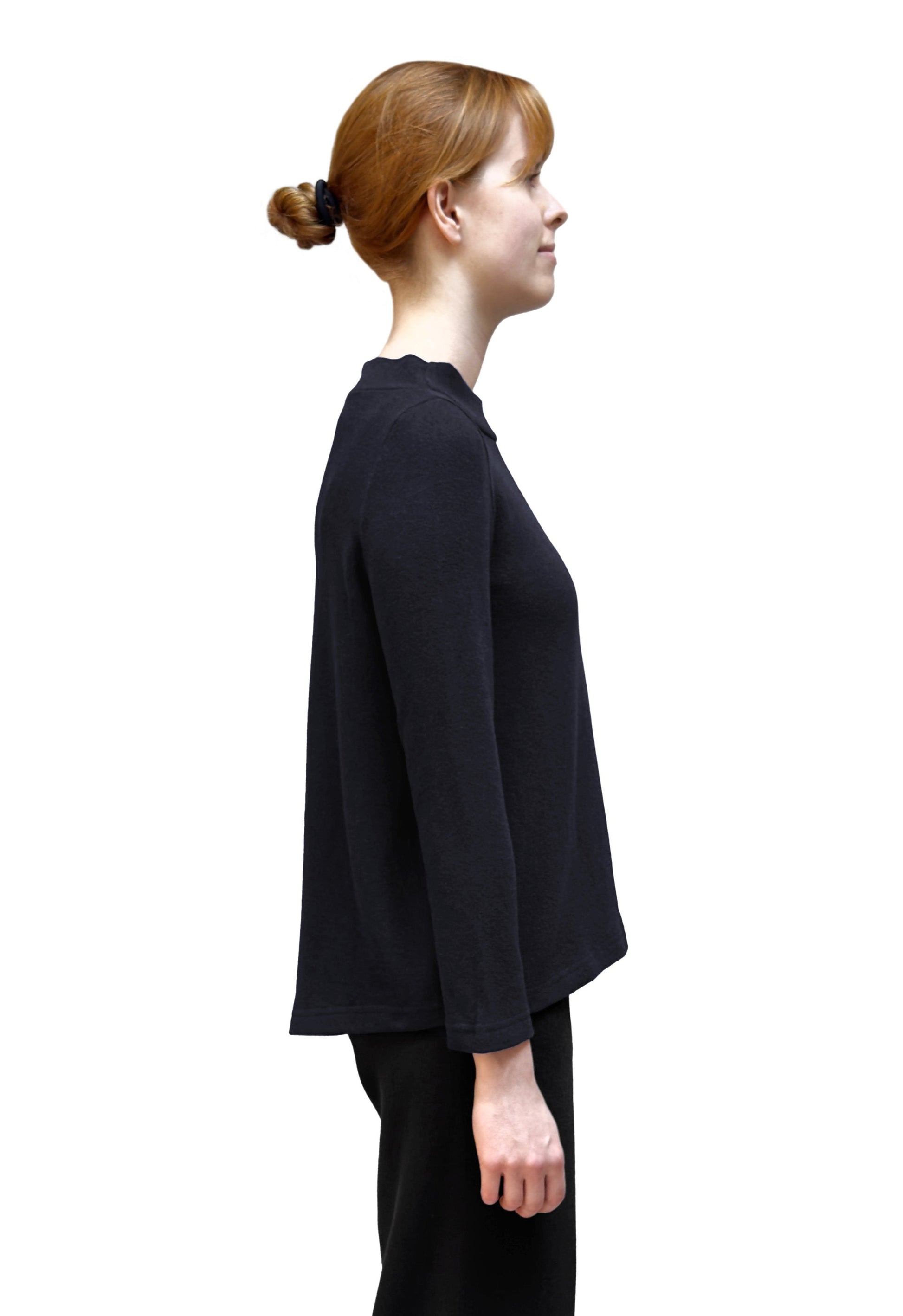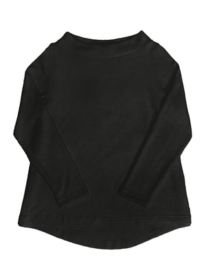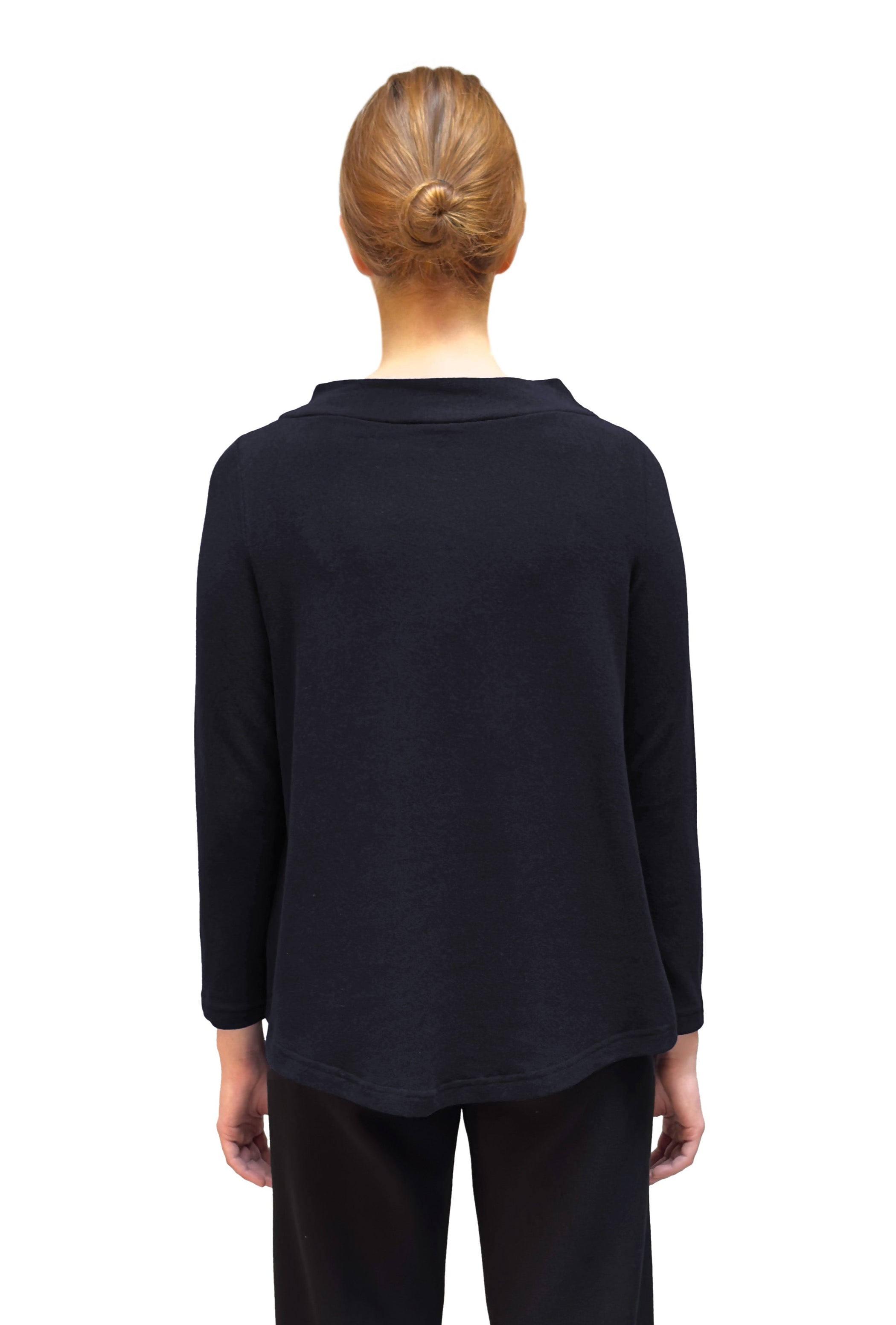 A slimmer and closer fitting top with a soft A-line shape and long sleeves in Mama B’s cozy knit fabric. This top has a relaxed and wide mock neck and close fitting set-in sleeves. The back slightly dips down making a 5” difference between the front and back centre hem giving the top a high low style.