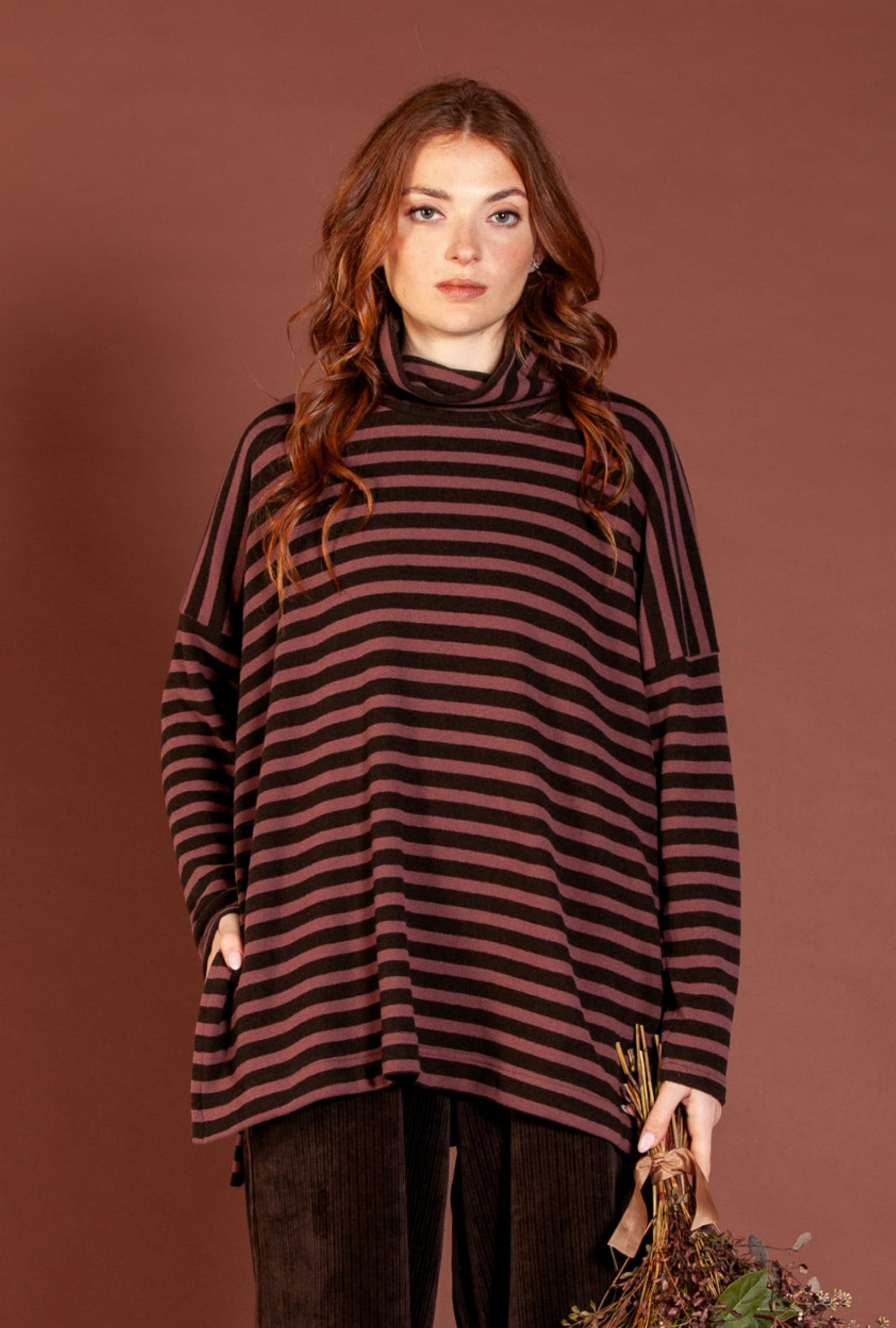 A pullover with a boxy fit in Mama B's cozy knit fabric featuring dusky pink and umber stripes. It offers a flattering turtleneck and dropped shoulders with fitted sleeves from the elbow down. The 11" slits at the sides add a stylish touch. This top falls below the hips.