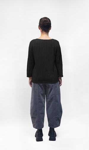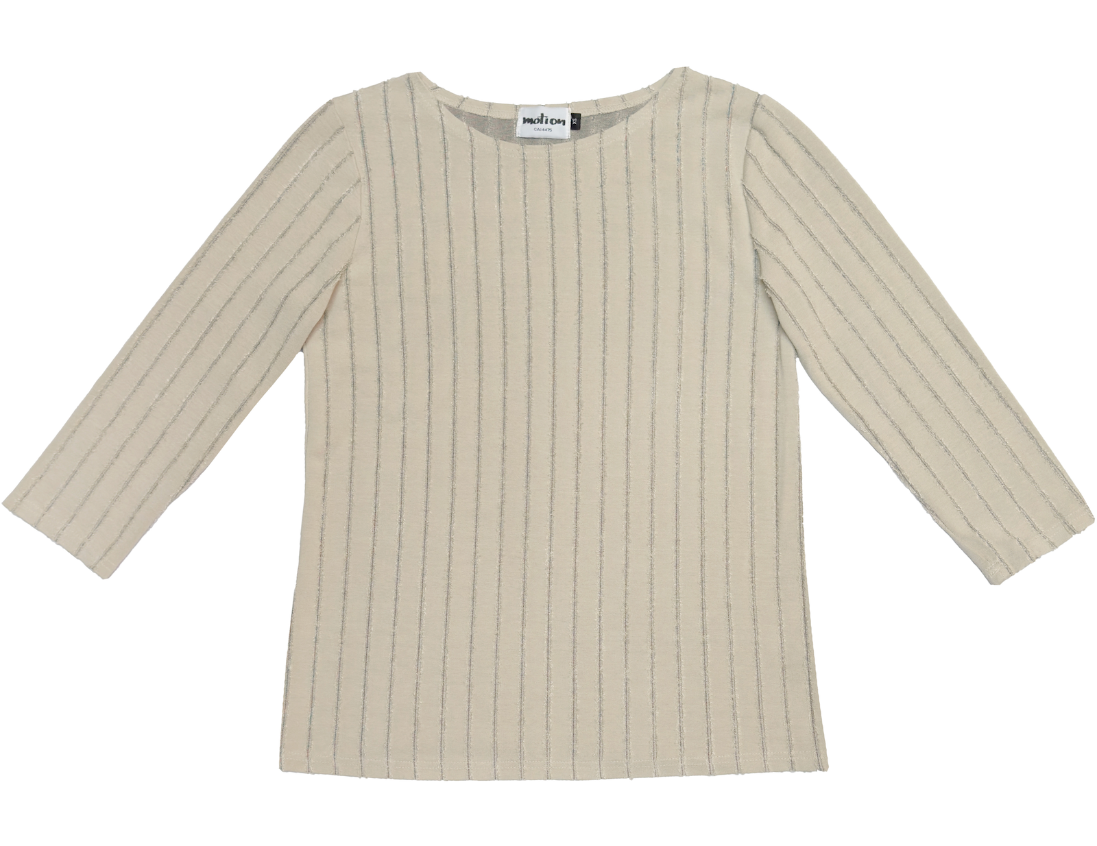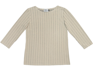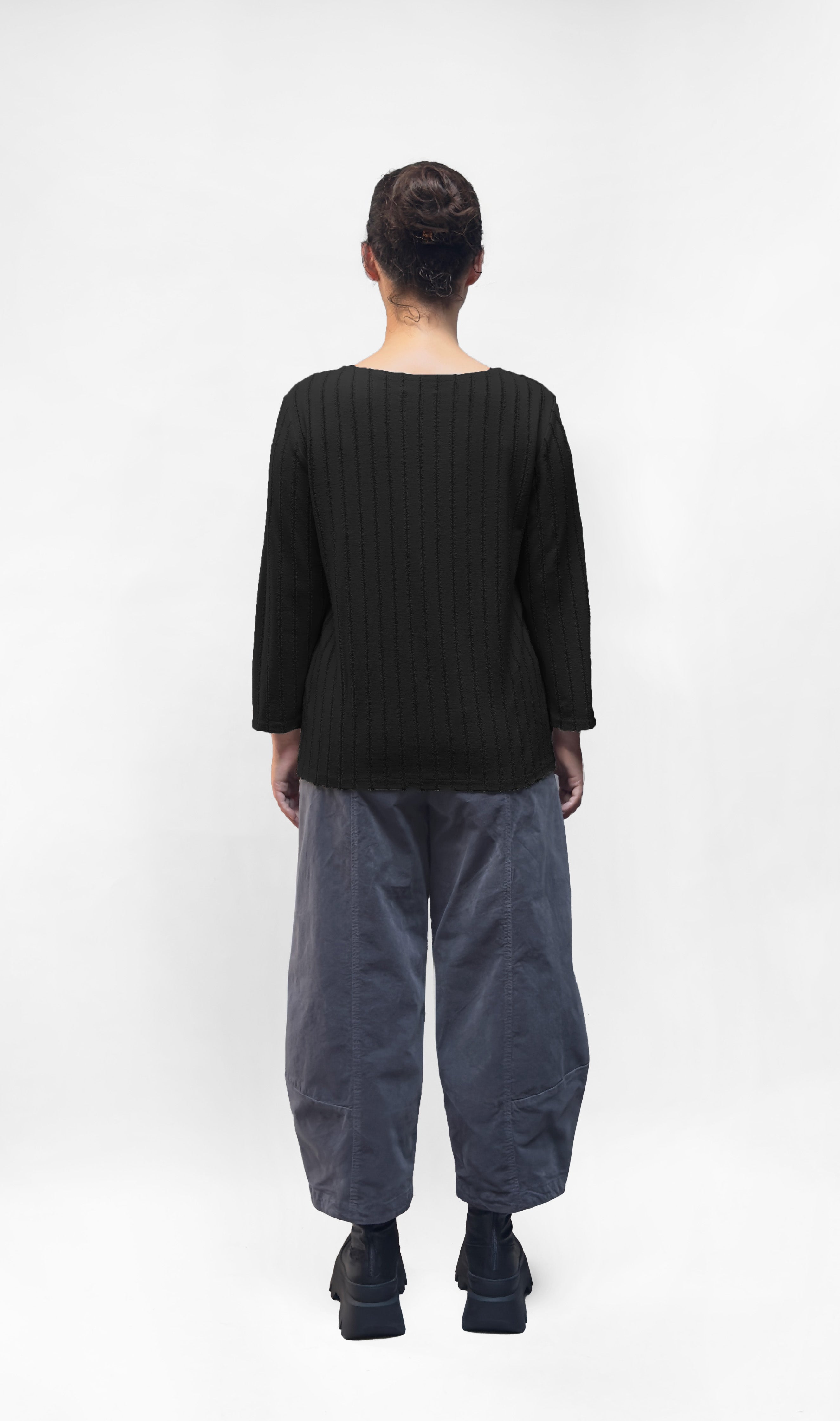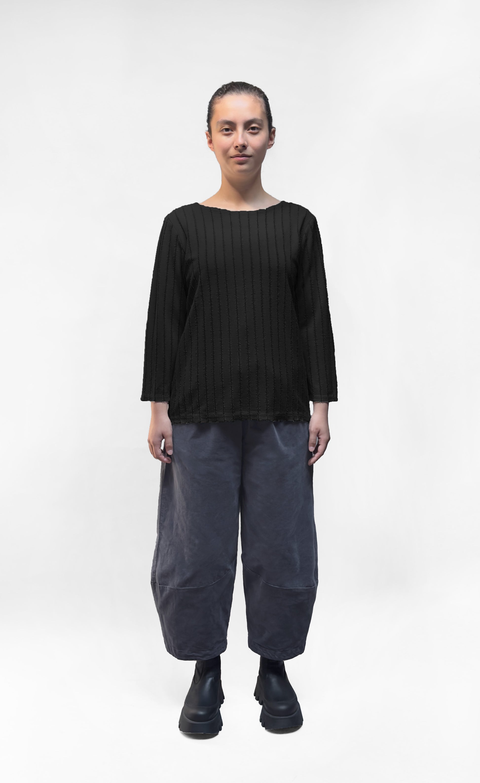 A straight-cut tee with a classic boatneck, featuring a textured fabric. It has 3/4 sleeves and falls hip-length.