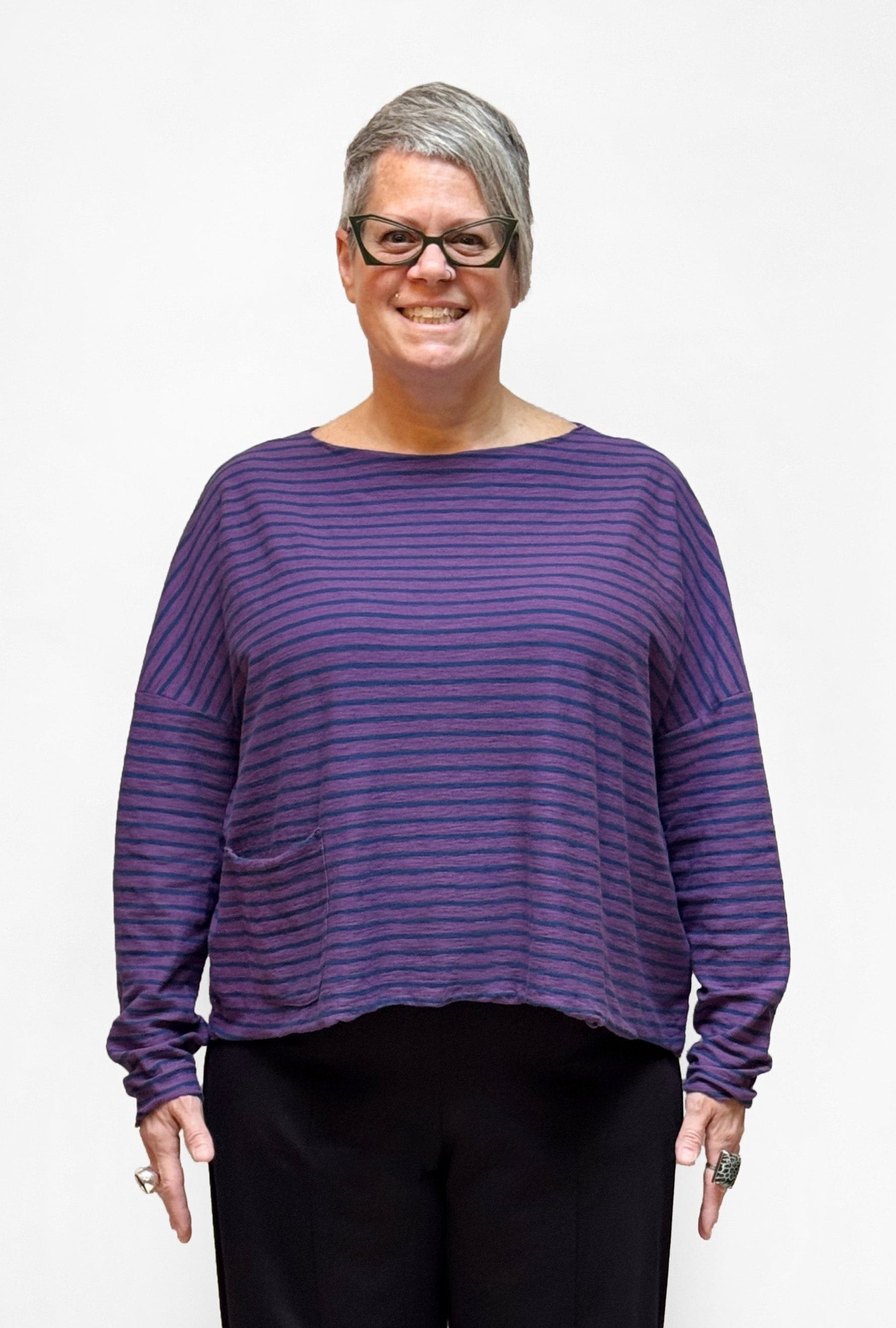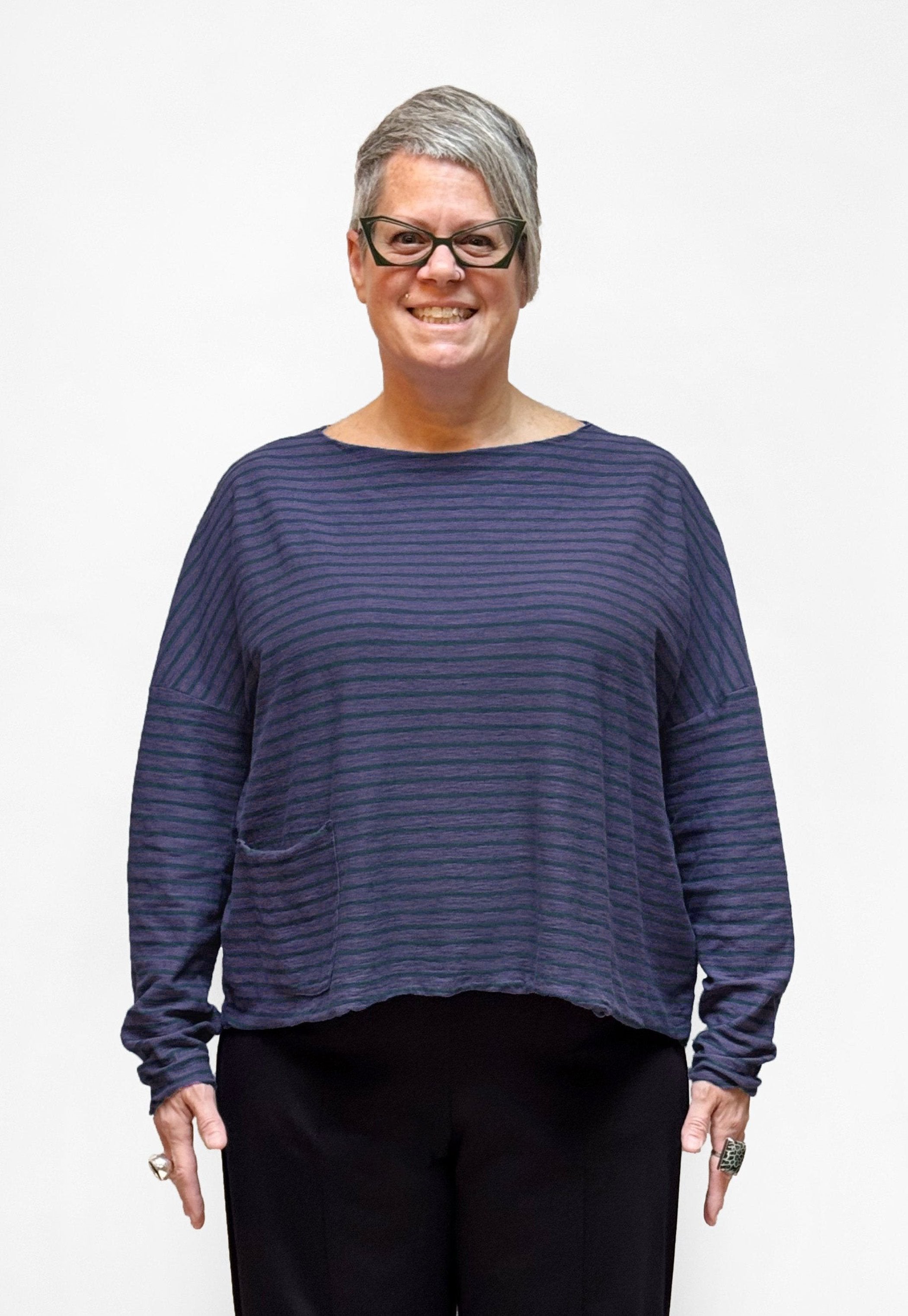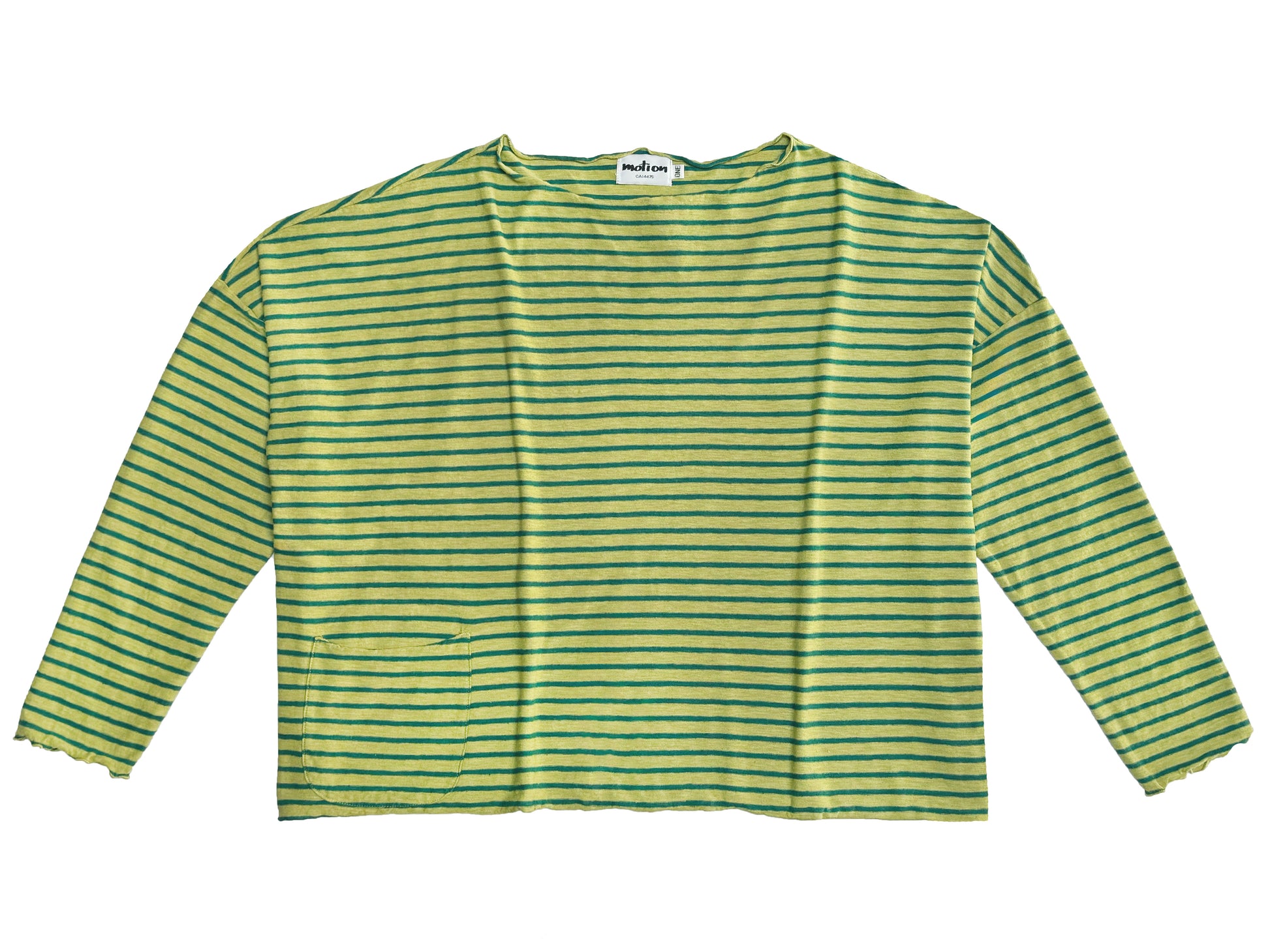 This top has a boxy and relaxed fit, crafted from a comfortable cotton-linen blend knit. The classic blue stripe design is accentuated by the contrast-coloured background, which comes in a variety of options. It features serged edges that naturally roll over, full length sleeves and a pocket at the front.