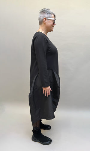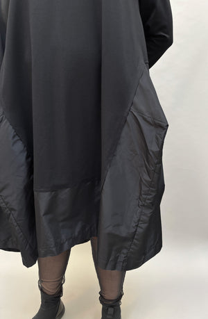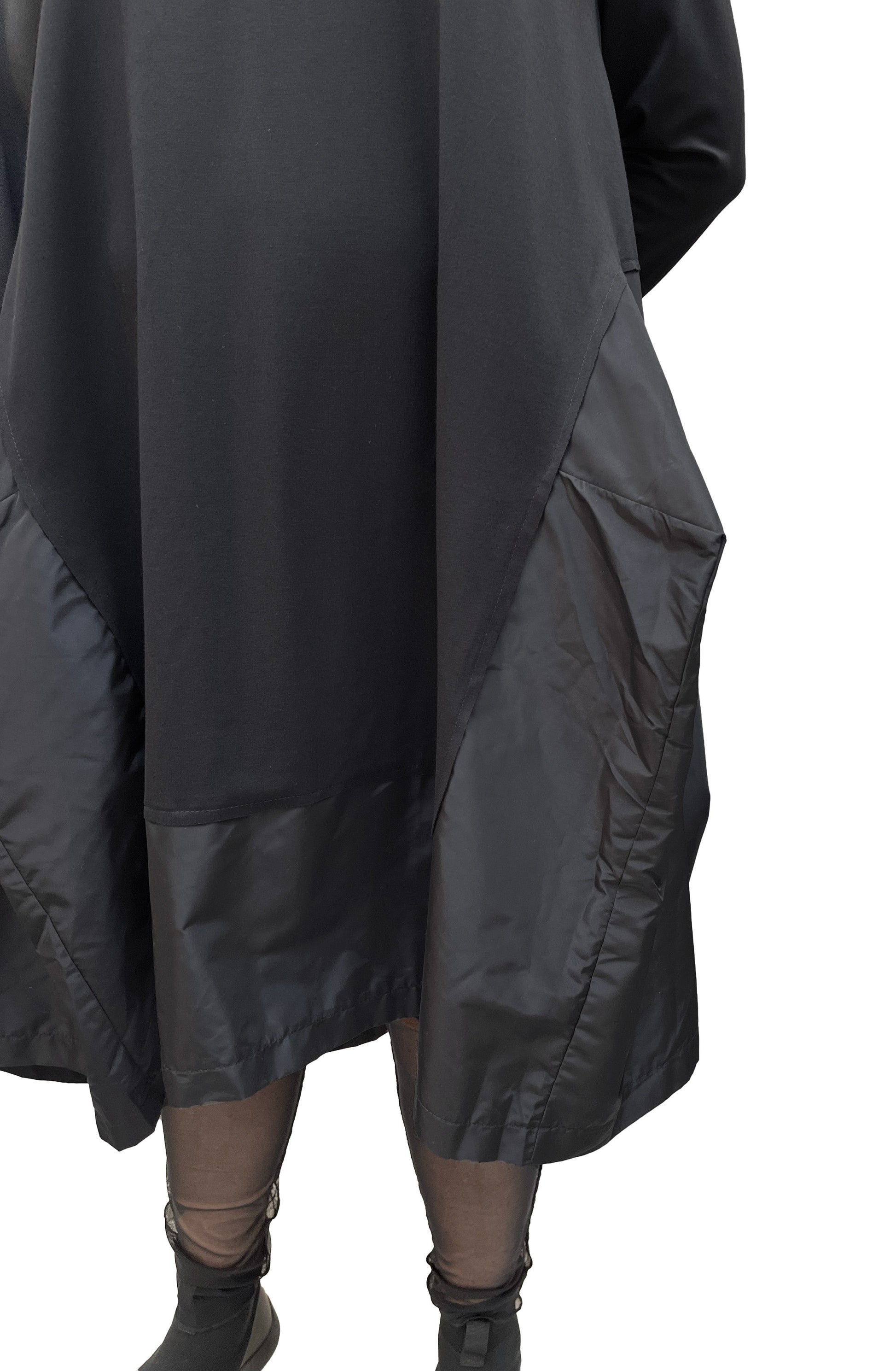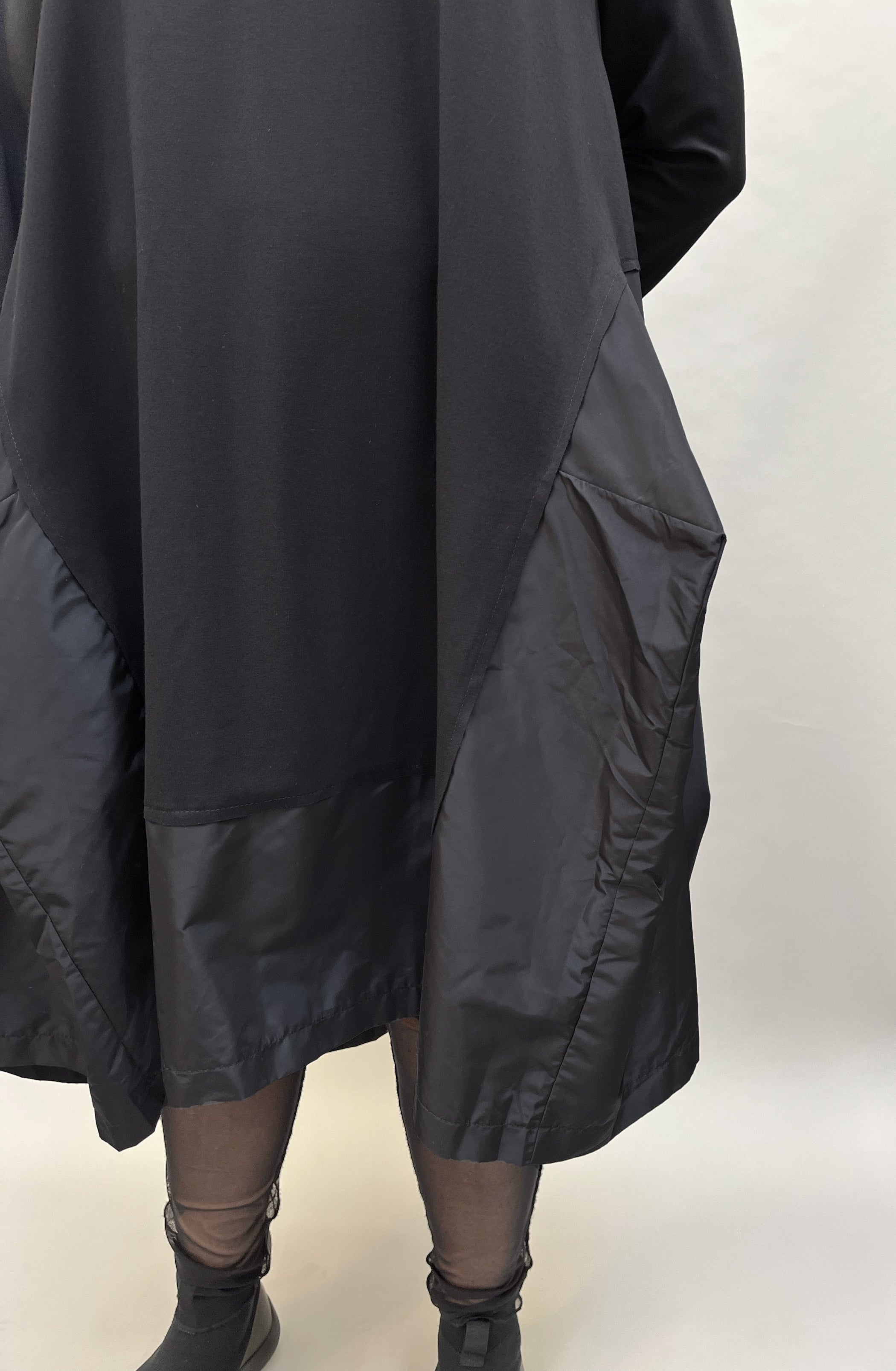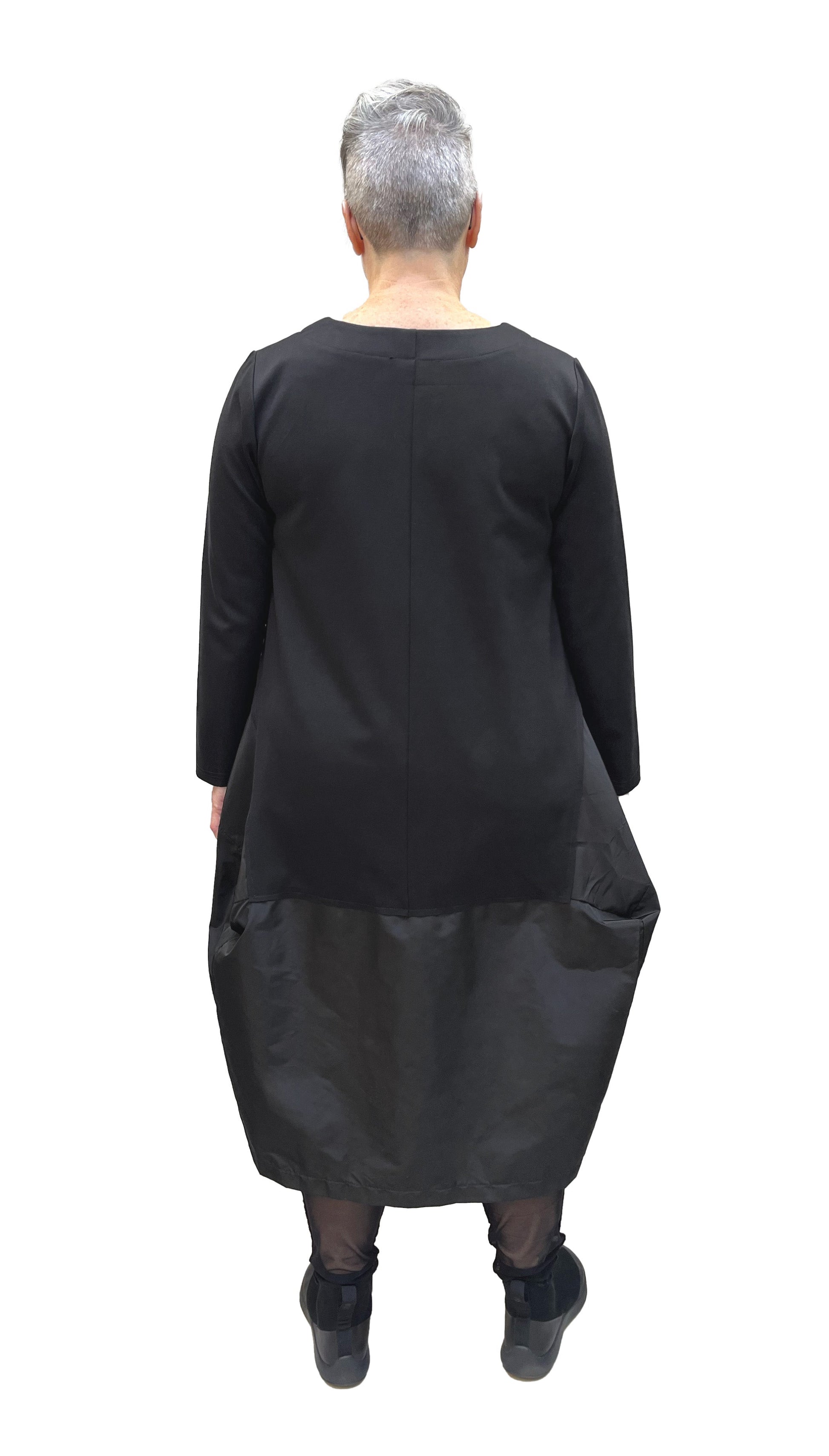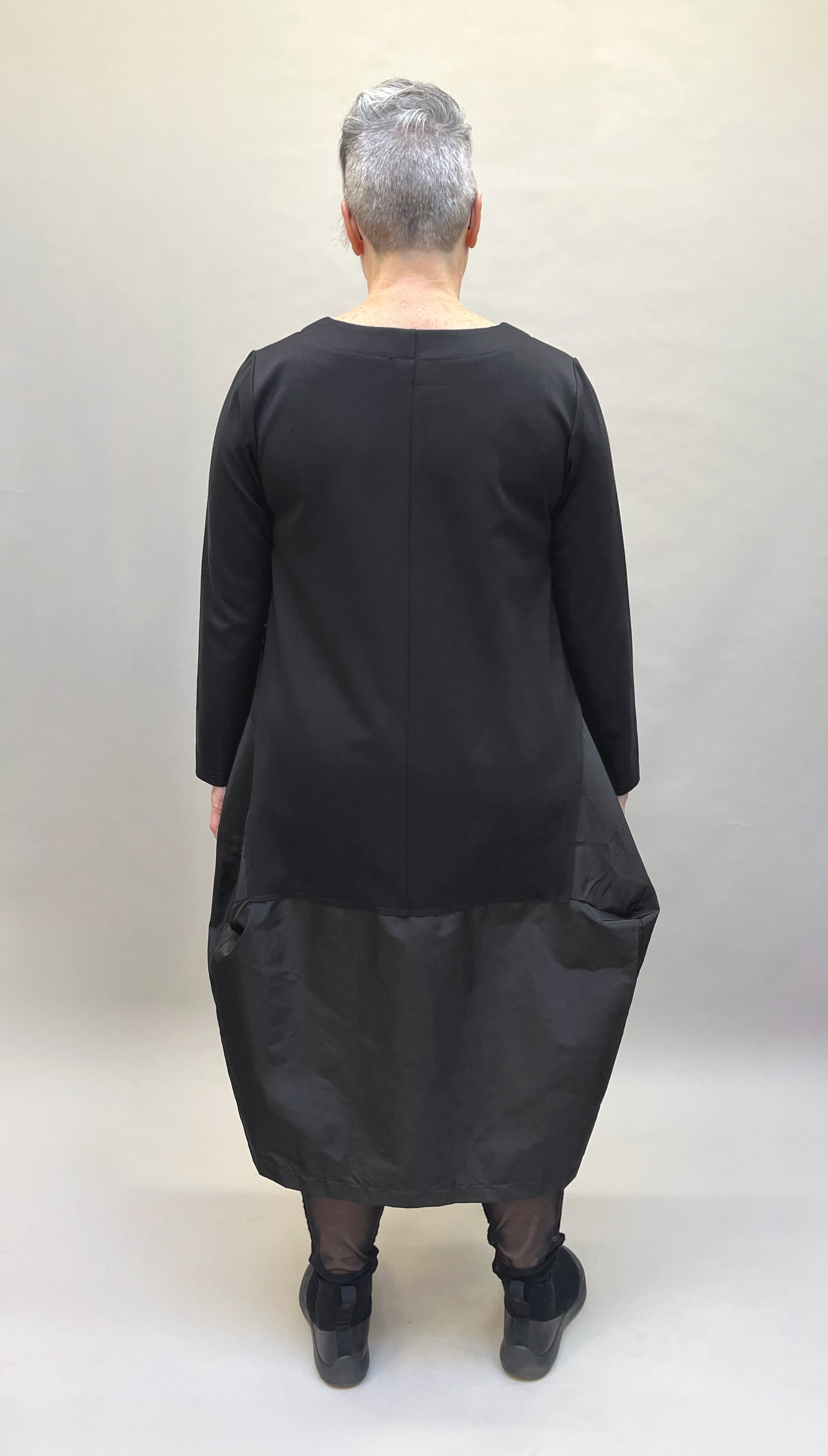 Features a round scoop neck-line, long fitted sleeves and a raw edge where the upper dress material meets the taffeta. A classic silhouette with a sculptural twist. Style as is, or experiment with layering over and under.