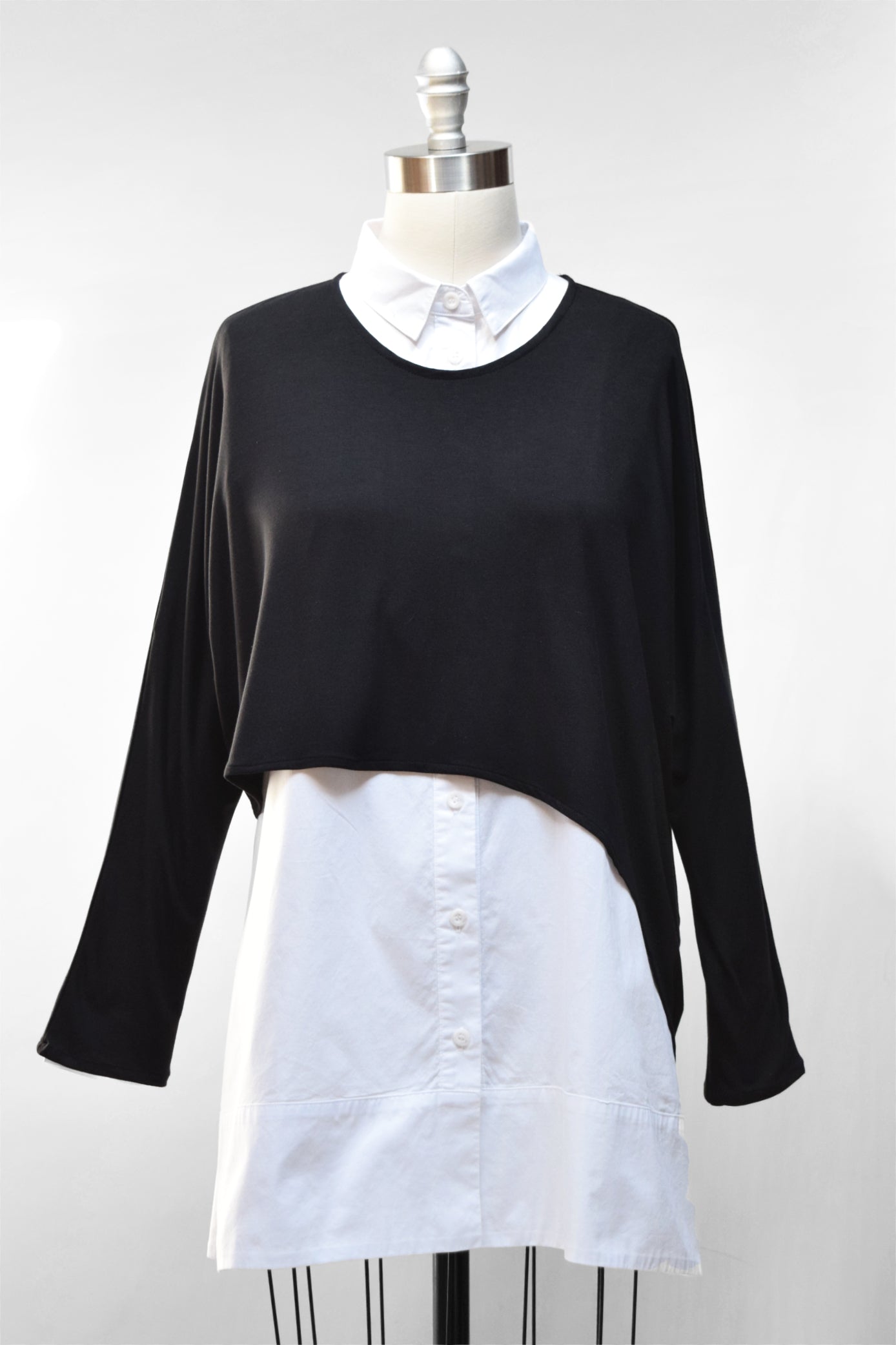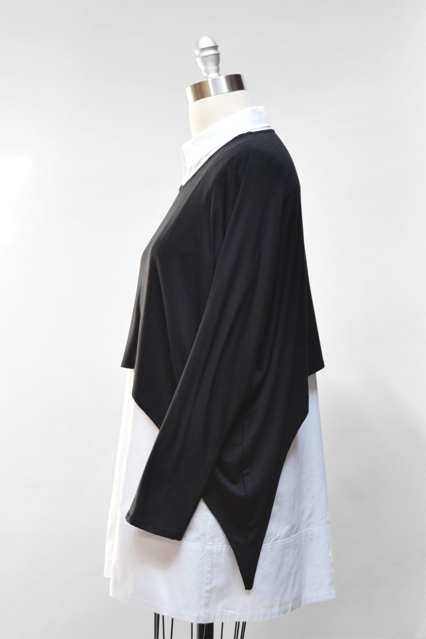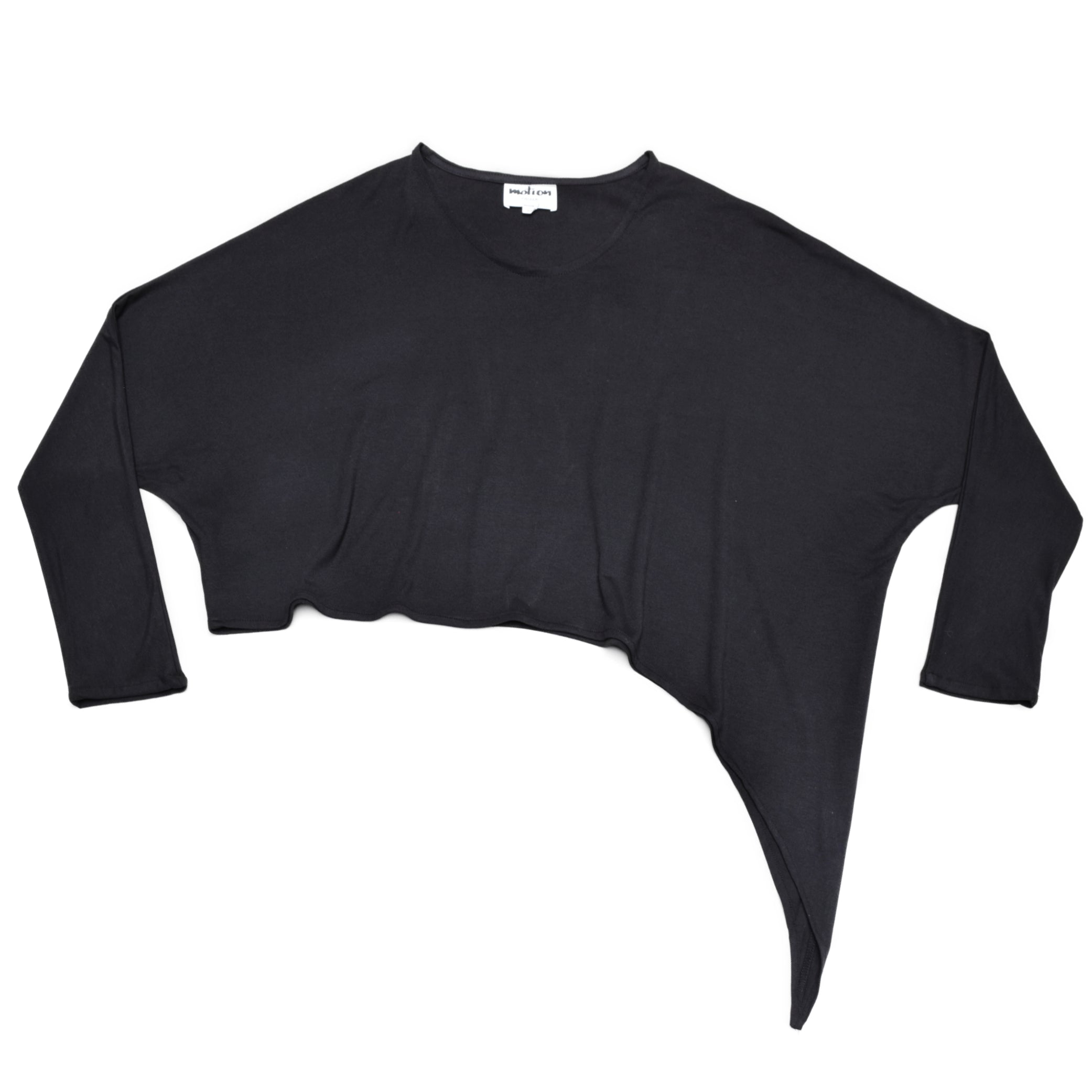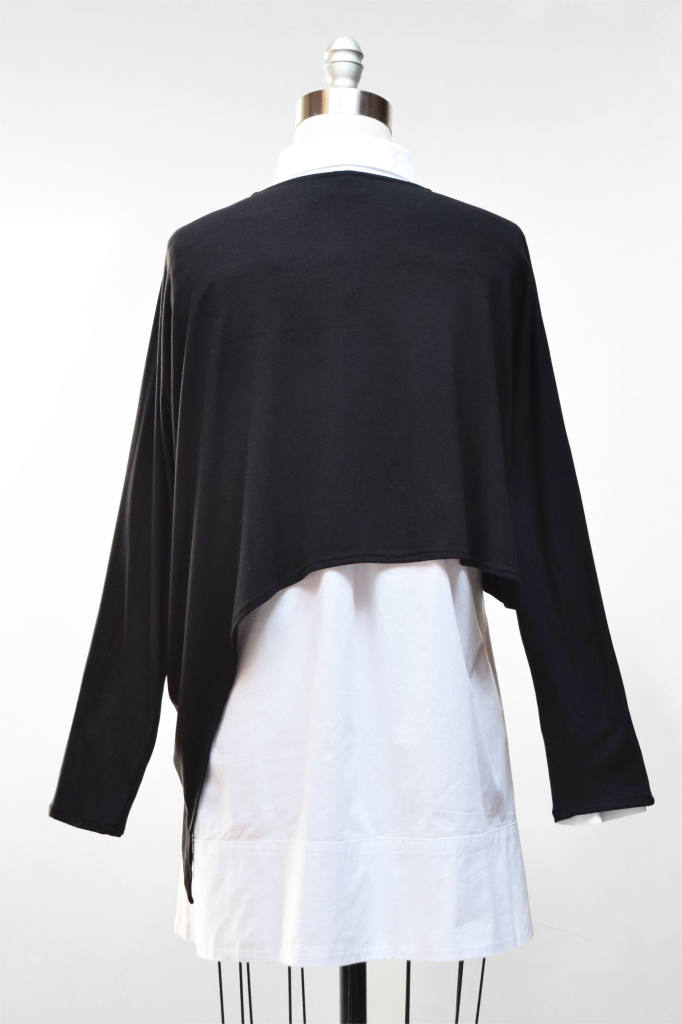 A relaxed layering top with an asymmetric dip on one side. It has a high, round neckline and long dolman sleeves. Pictured is size S, which falls waist-length. Each size up is longer.